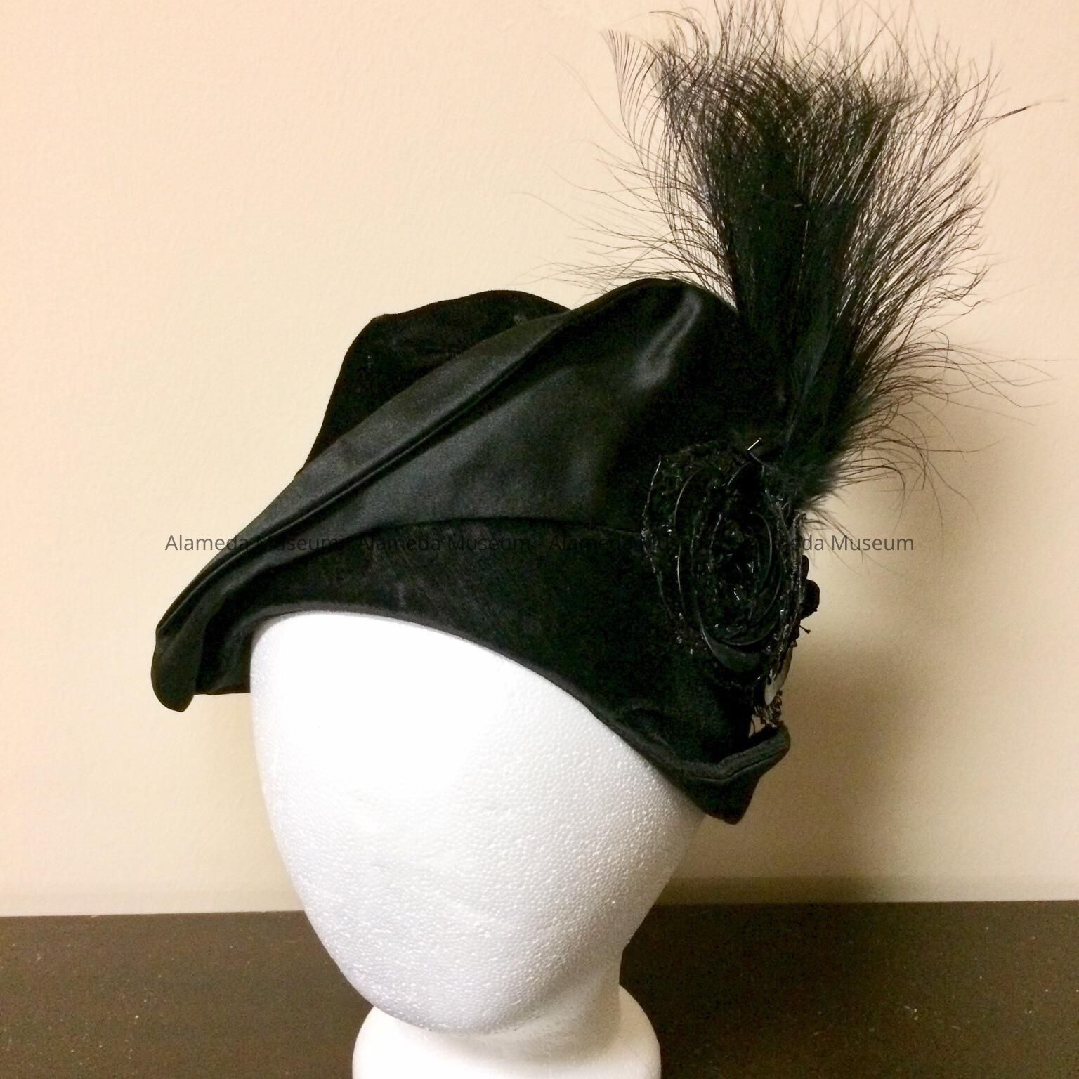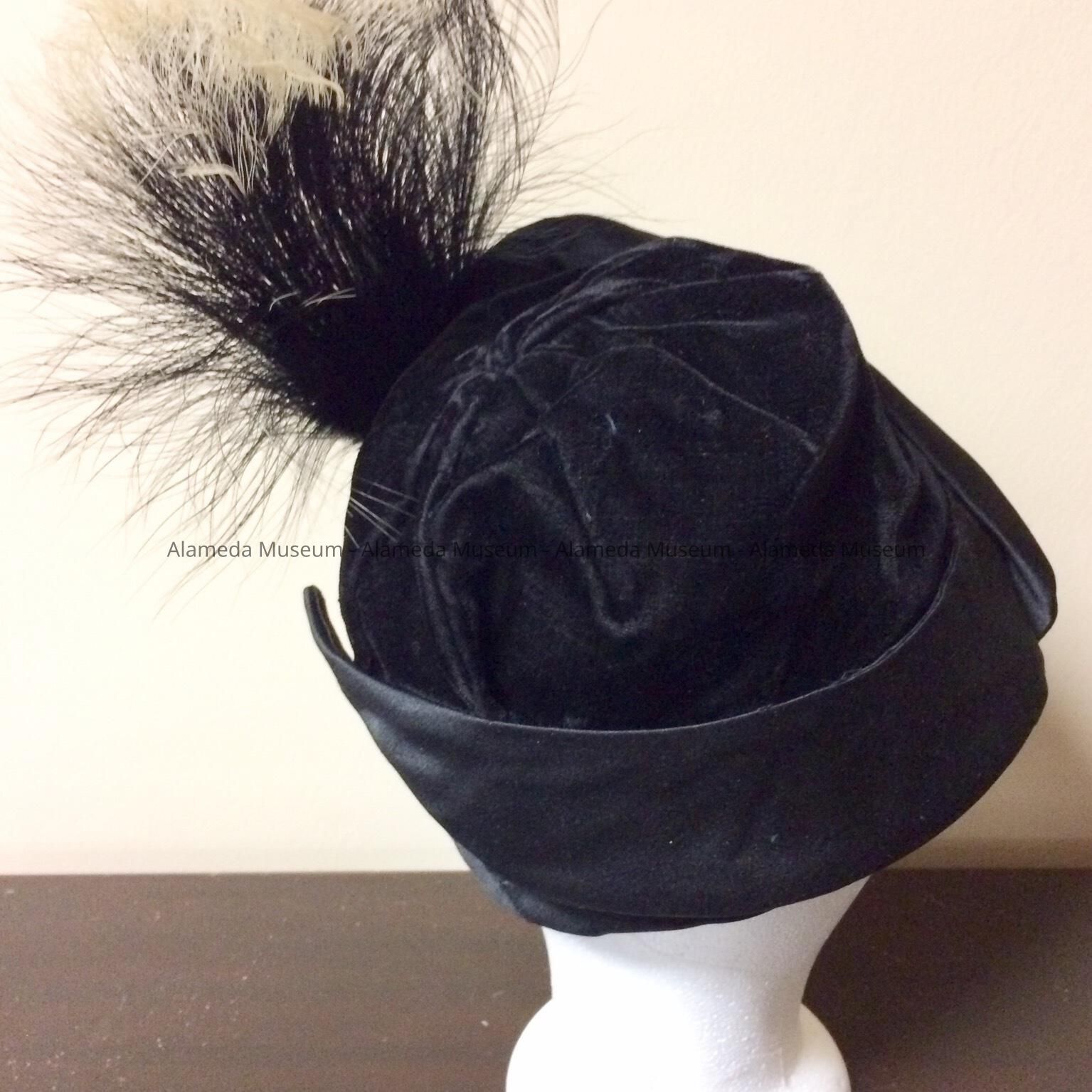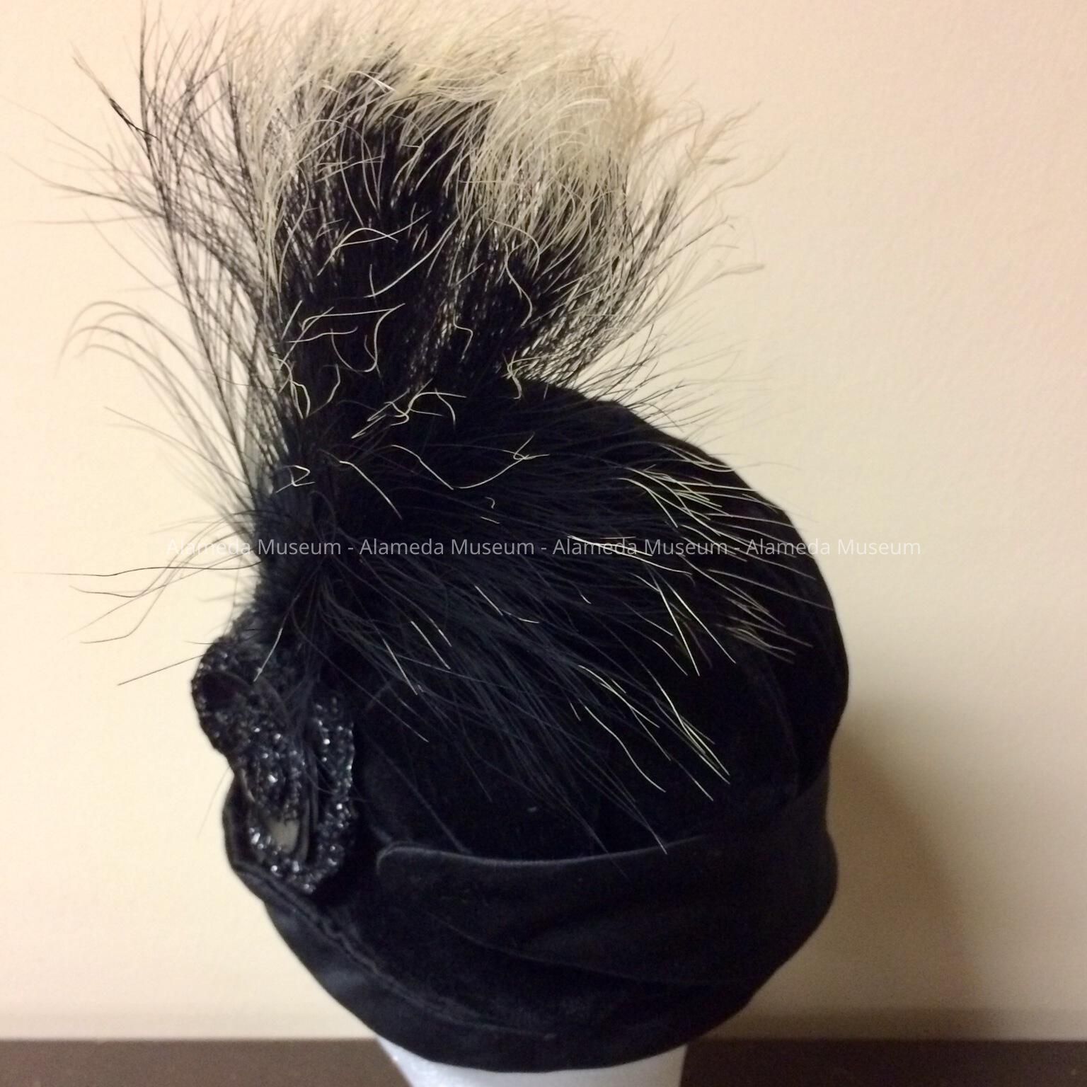 Black velvet pseudo cloche hat with white tipped feather ornament, 1920sEntry/Object ID