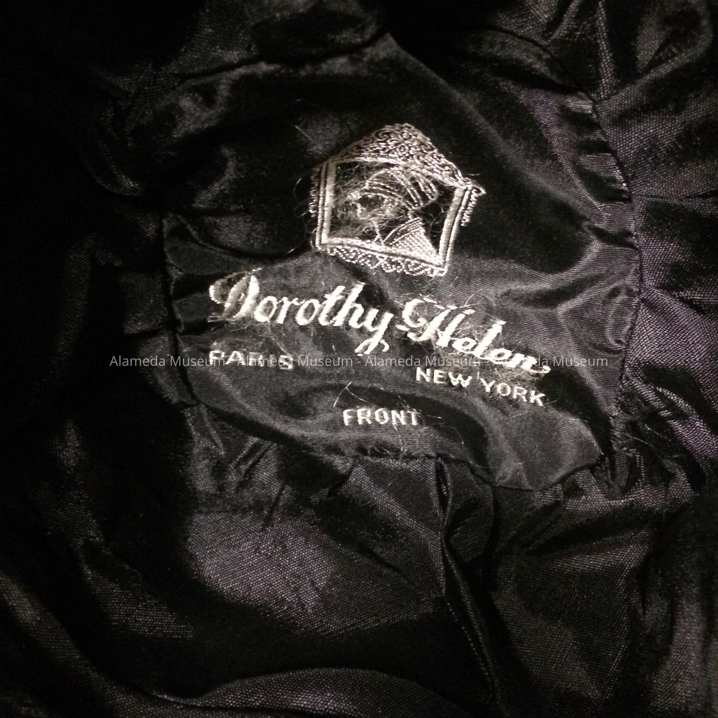 Description: Black Velvet pseudo cloche hat with black satin trim and white tipped feather ornament supported by straw flowers (trimmed in a patent leather effect). Interior label stating "Dorothy-Helen-Paris, New York."