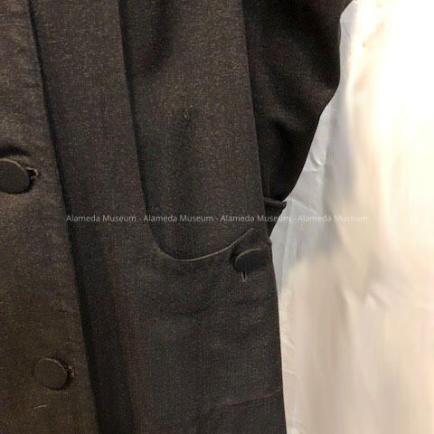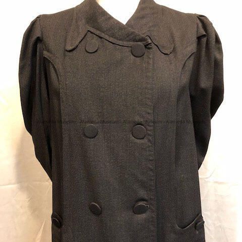 DESCRIPTION: Black wool serge. Has silk faille buttons. It appears to be a coat from 1906 to 1910. There are ten silk faille buttons down the front and the buttons are repeated on the pockets. There are cuffs at the sleeve. Coat was actually worn in Alameda.