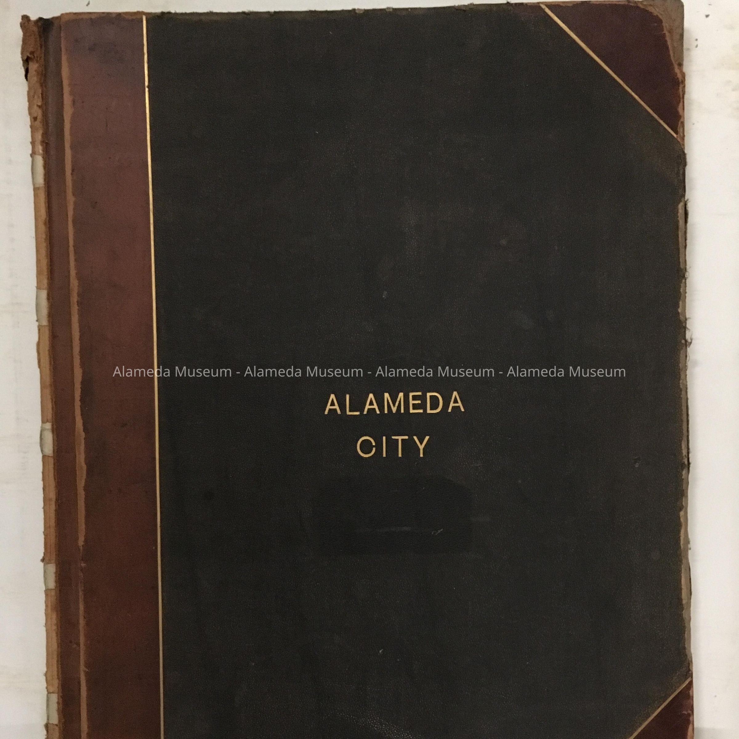 HARD-BOUND BOOK, WITH COVER OF BLACK-COLORED BUCKRAM, TRIMMED SPINE IN BROWN-COLORED LEATHER. INCISED CAPTION IN GOLD ON COVER READS, "ALAMEDA CITY."