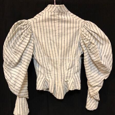 Description: Blouse of Plissi (seersucker) has leg-of-mutton sleeves and stand up collar. Form fitting bodice has hook and eye closure at front with black button decoration down front. Bottom edge comes to points on each side of front and rounded point at back.