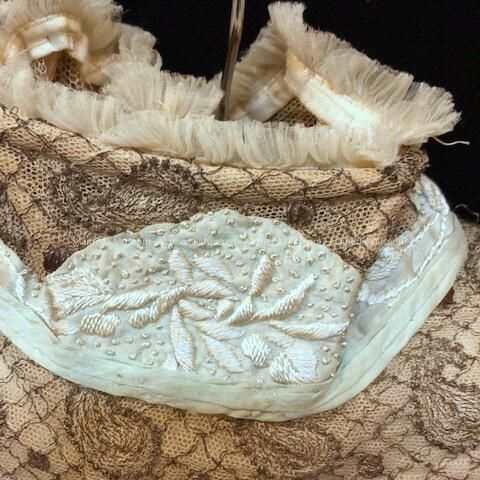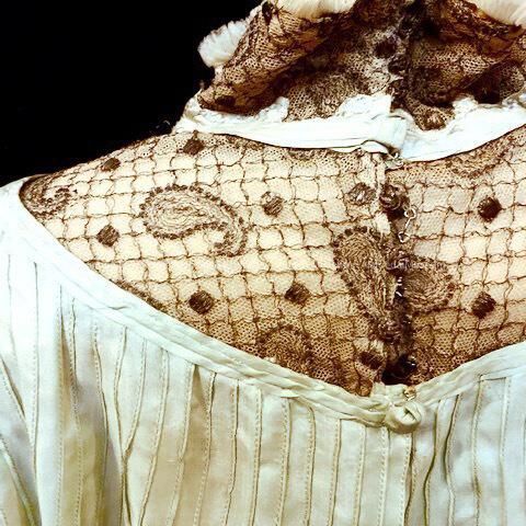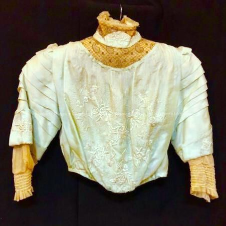 Description: Blue Japanese silk with high neck. Gold lace over ecru background. Blue embroidery flowers and french knots. Tucks at sleeves. Top only, missing skirt.