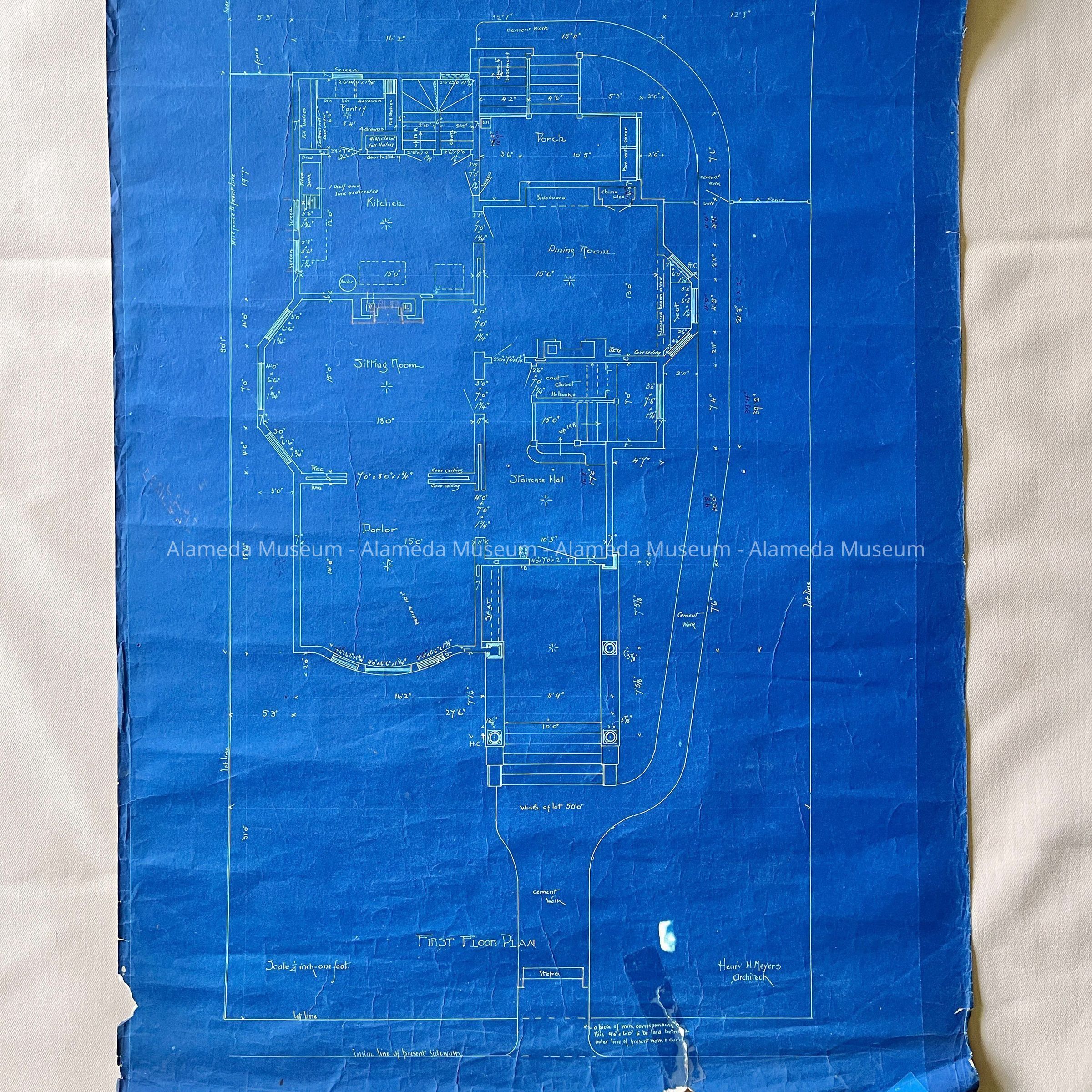 EARLY BLUEPRINT COPY FROM THE ORIGINAL DRAWING OF THE FIRST FLOOR AT 2021 ALAMEDA AVENUE, ALAMEDA, CA. PARLOR, SITTING ROOM, DINING ROOM, AND KITCHEN ARE INCLUDED IN THE BLUEPRINT COPY. PRIVATE RESIDENCE OF HENRY H MEYERS, ARCHITECT, ERECTED IN 1897.