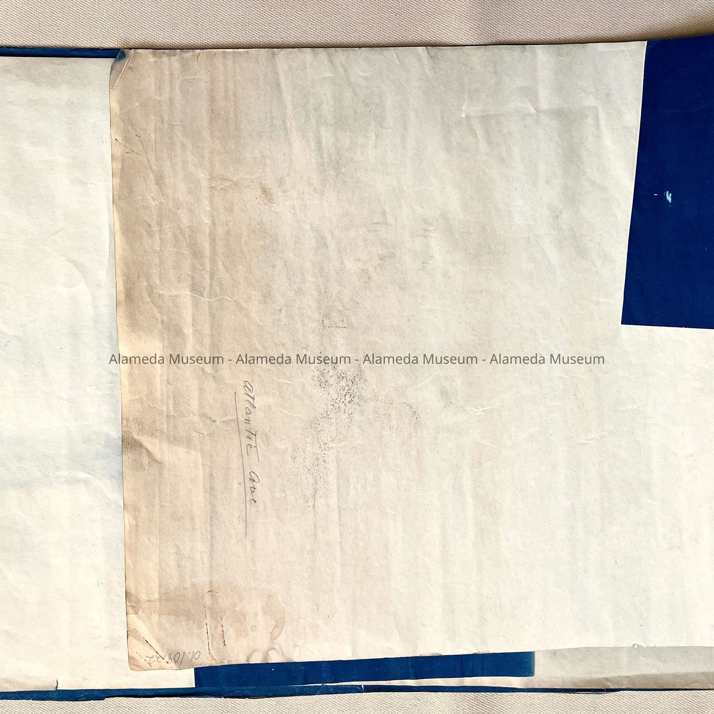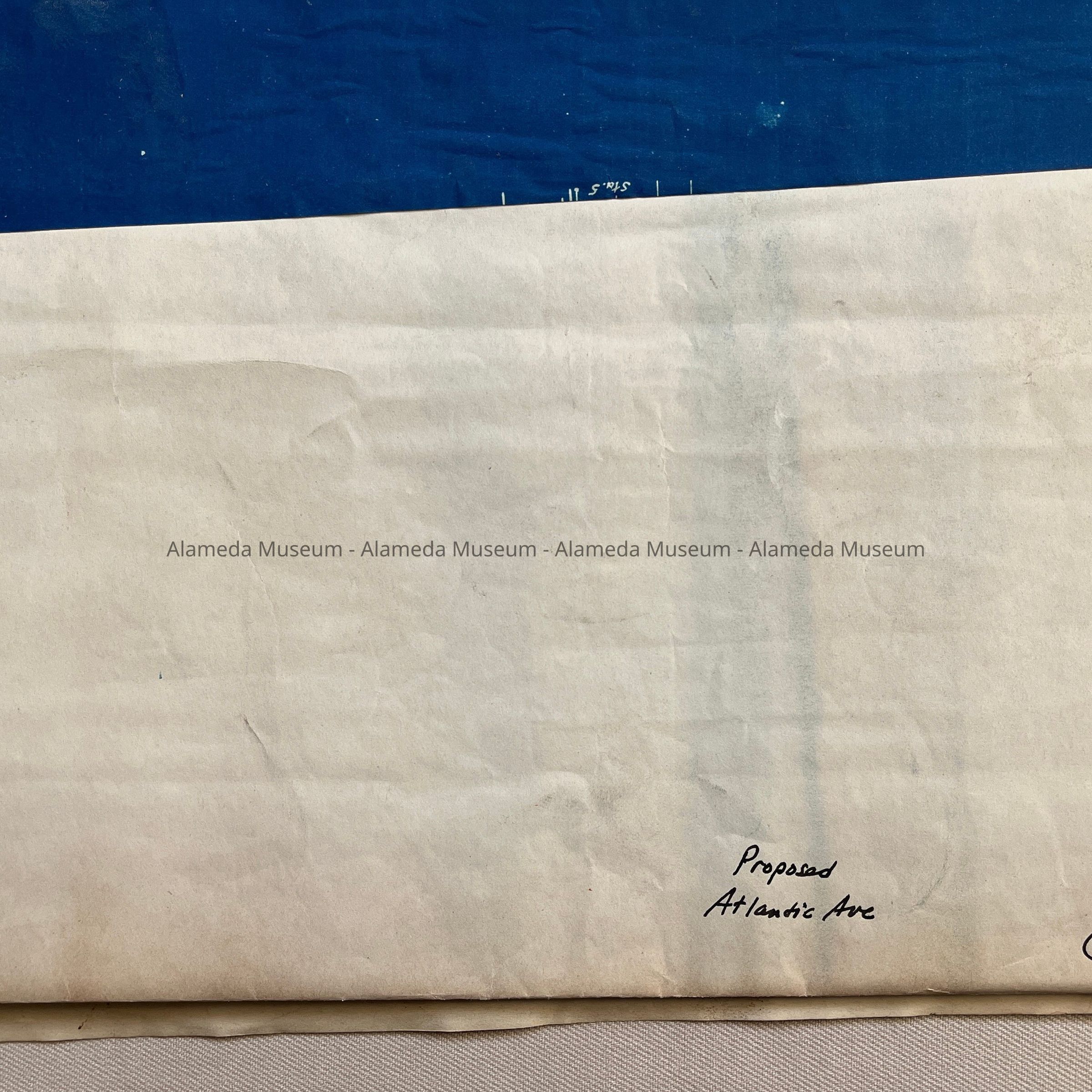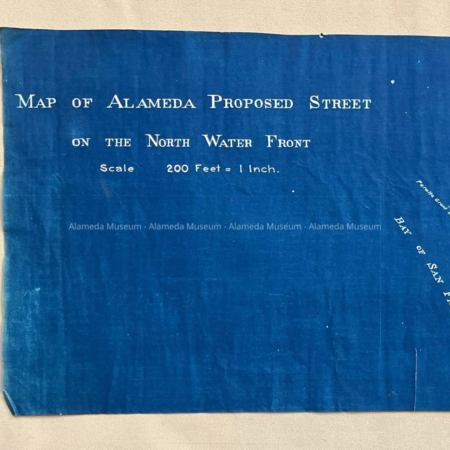 DESCRIPTION: BLUEPRINT-STYLE MAP IN WHITE-COLORED TYPE ON A BLUE-COLORED BACKGROUND. MAP HAS BOLD-PRINTED CAPTION, "MAP OF ALAMEDA PROPOSED STREET."
