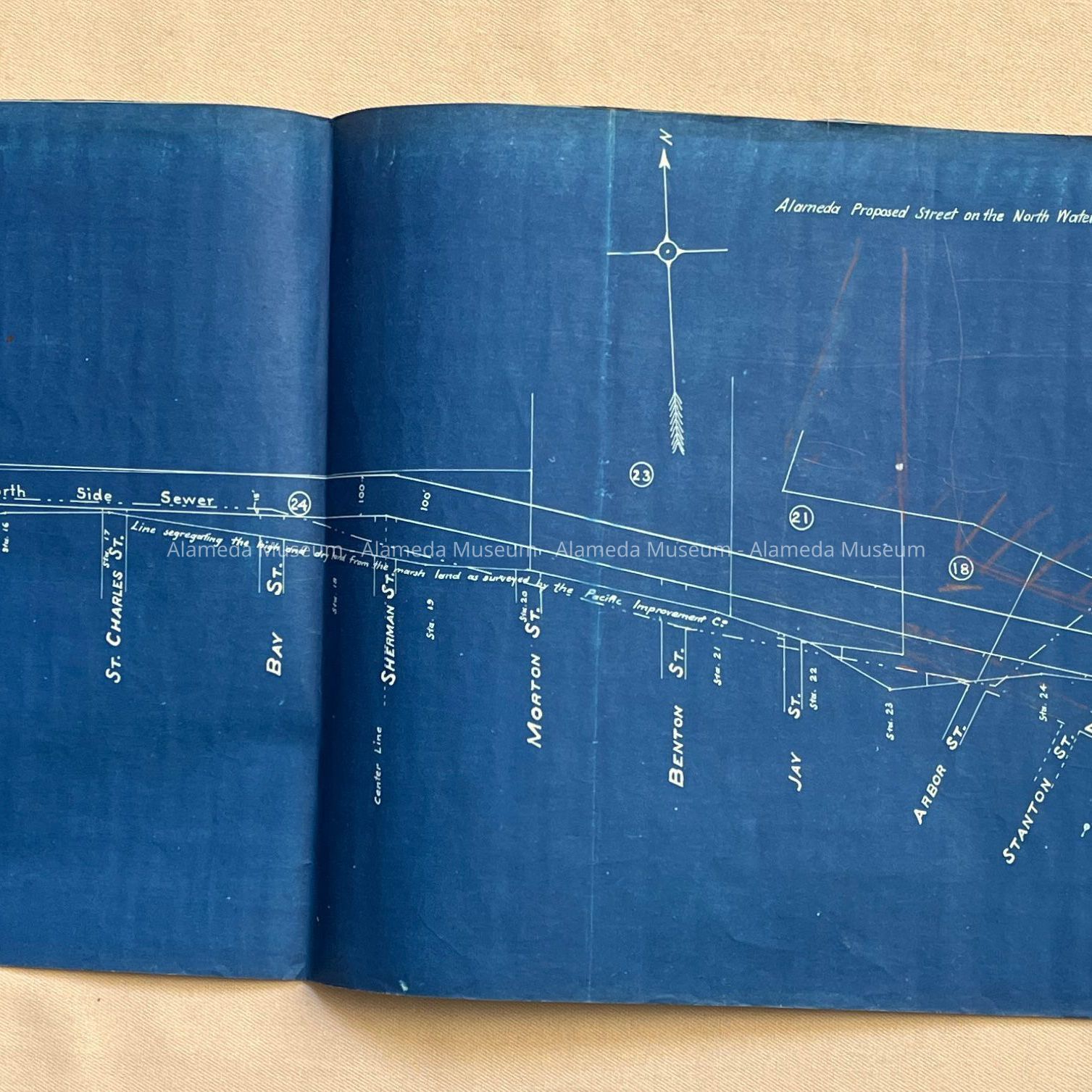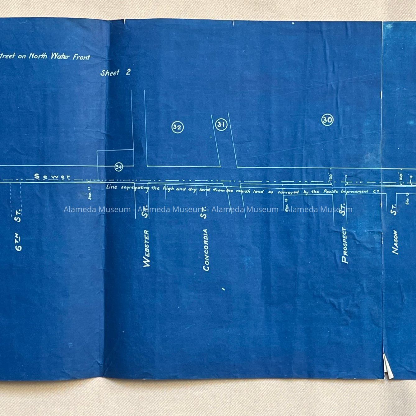 HISTORY OF OBJECT: BLUEPRINT DRAWING DEPICTING PROPOSED BOULEVARD THAT WOULD RUN ON THE NORTHERN SIDE OF THE PENINSULA FROM APPROXIMATELY GRAND STREET TO THE WEST END OF ALAMEDA.