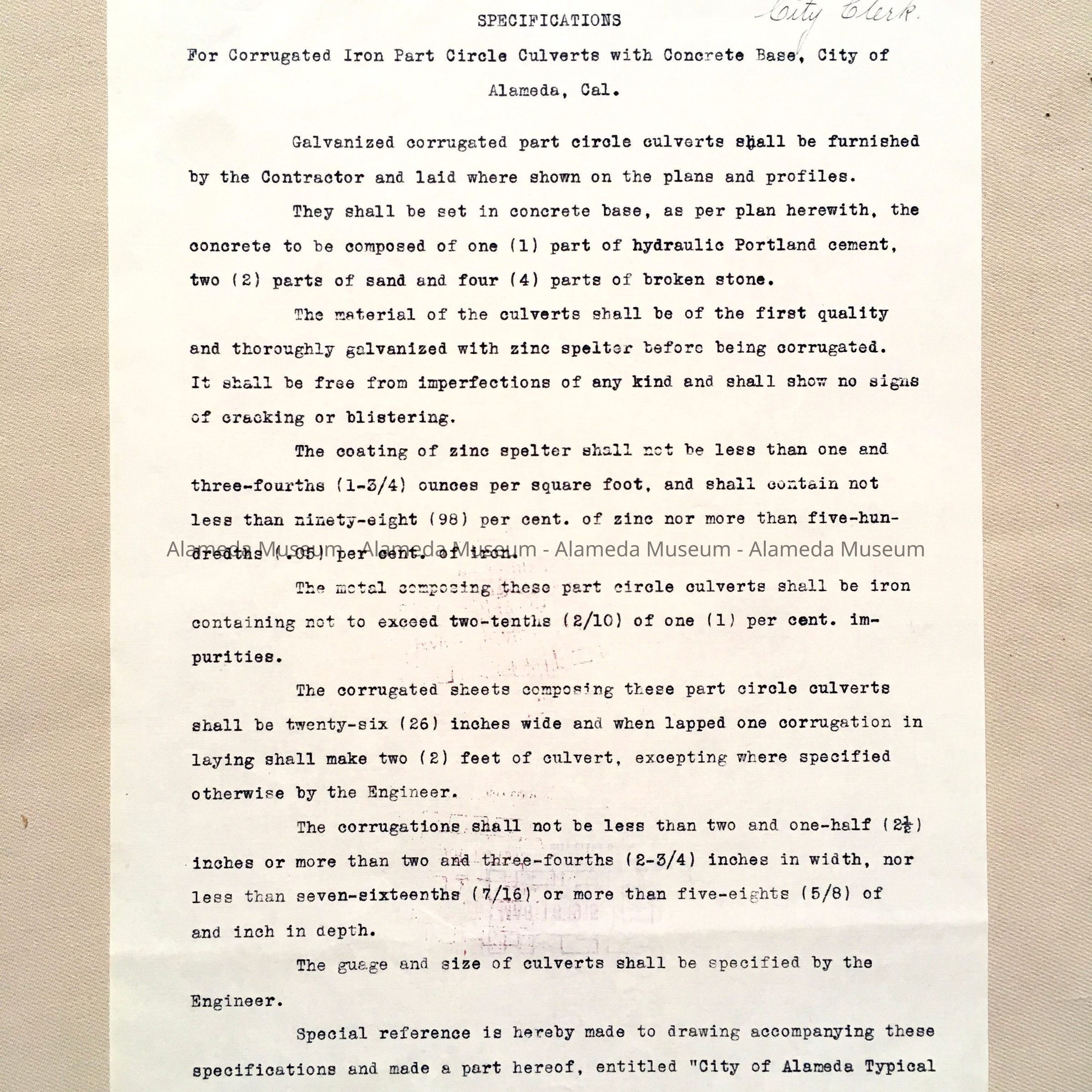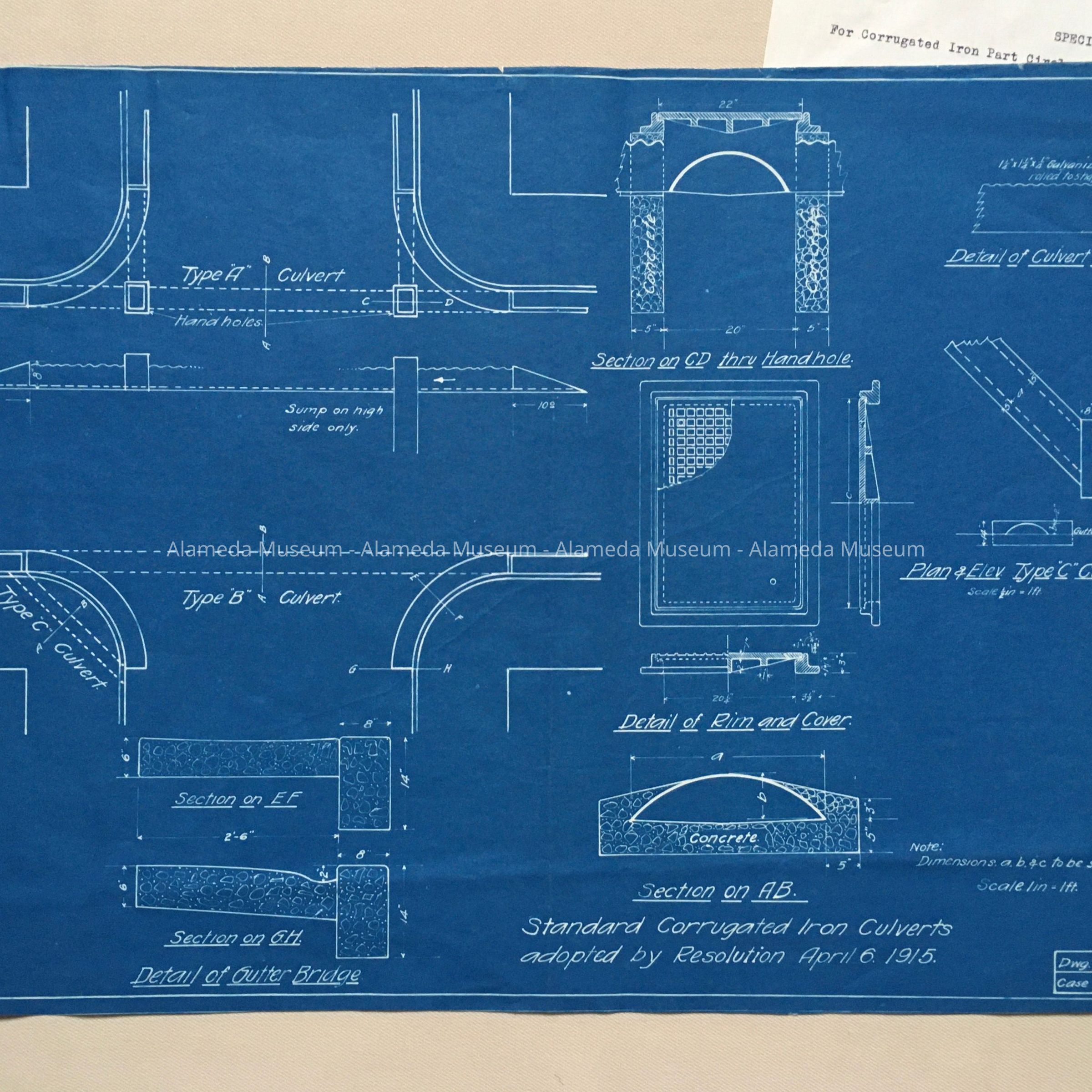 Blueprints giving diagrams of iron culverts utilized in the City of Alameda during the jurisdiction of James E. Sutton, City Engineer, 1915.