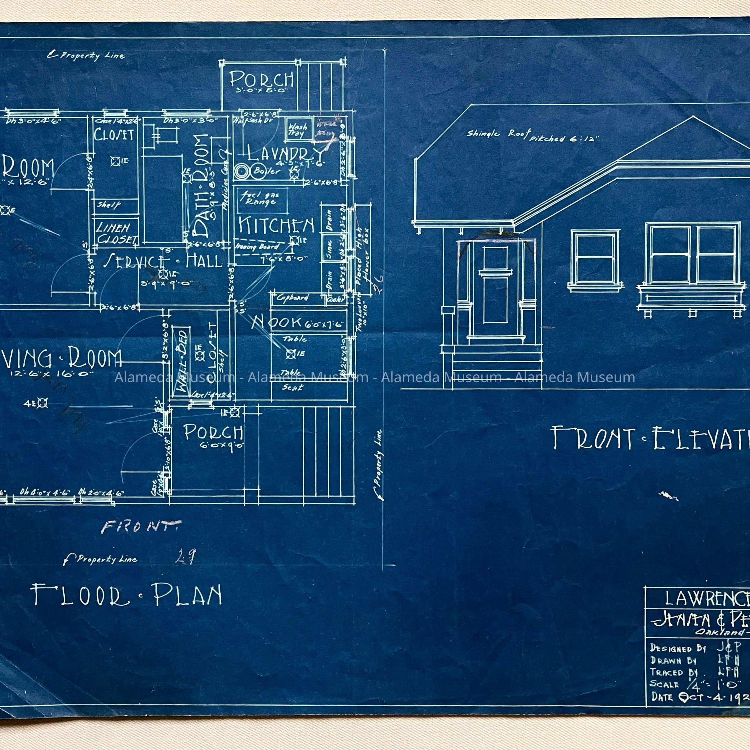 Description: Blueprint for a 1-bedroom, 1 bath squarish, with Front Elevation and Floor Plan. At bottom right: 'Lawrence Flagg Hyde'; 'Bungalow Building for Jensen & Petersen Builders / Oakland - California', Job No 501 [?], Date, Oct-4-1922.