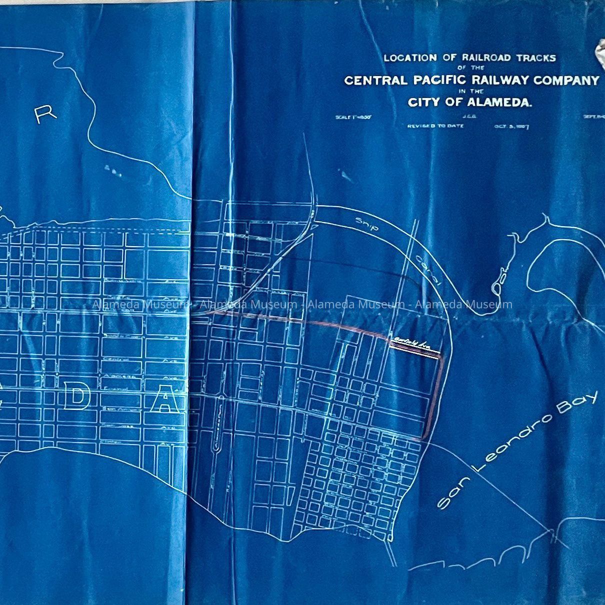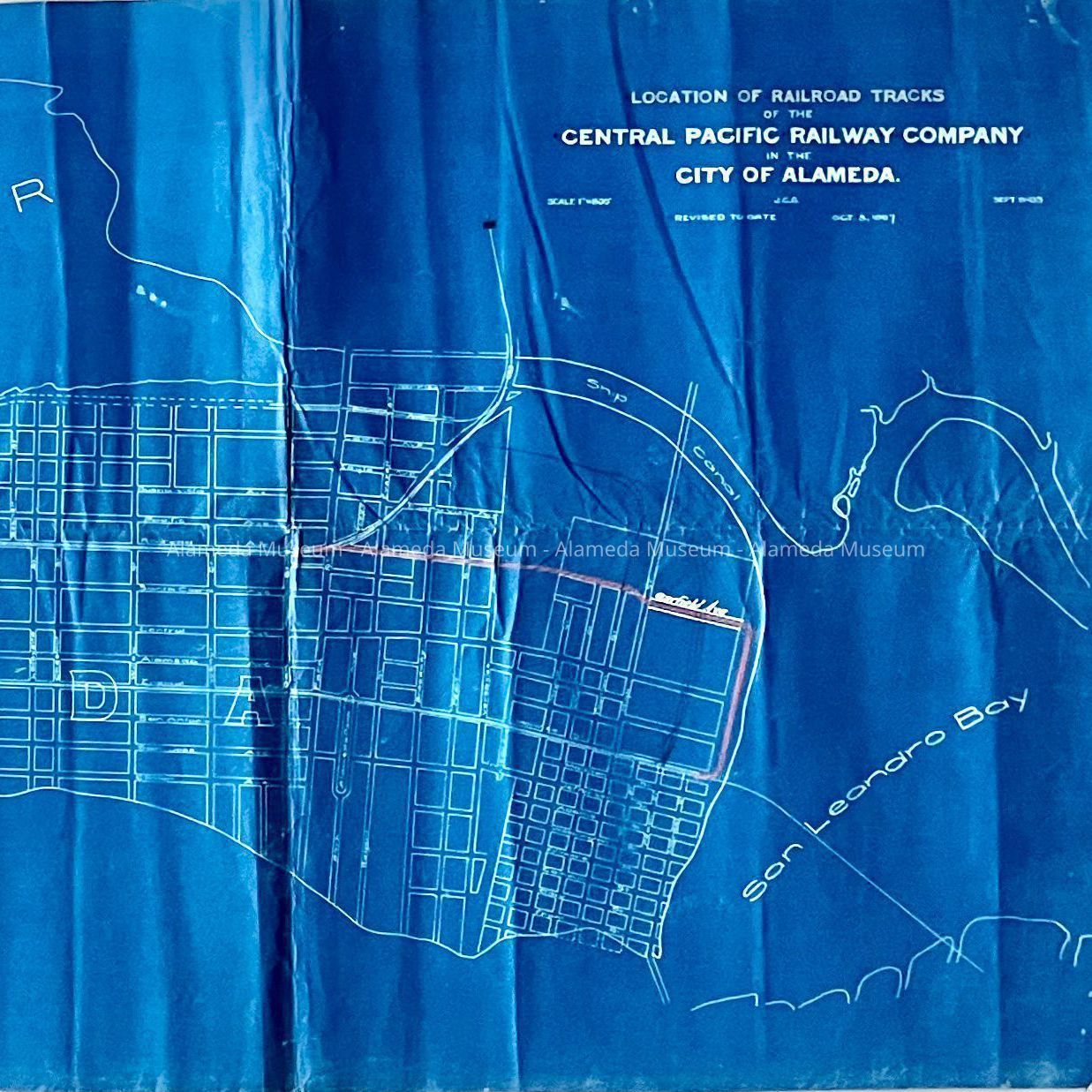 History of Object: Blueprint of existing railroad lines and a proposed line along Garfield which never was implemented. Shows boundaries of Alameda, and marsh lands. Extracted from folder acc. no. 11.34.2.