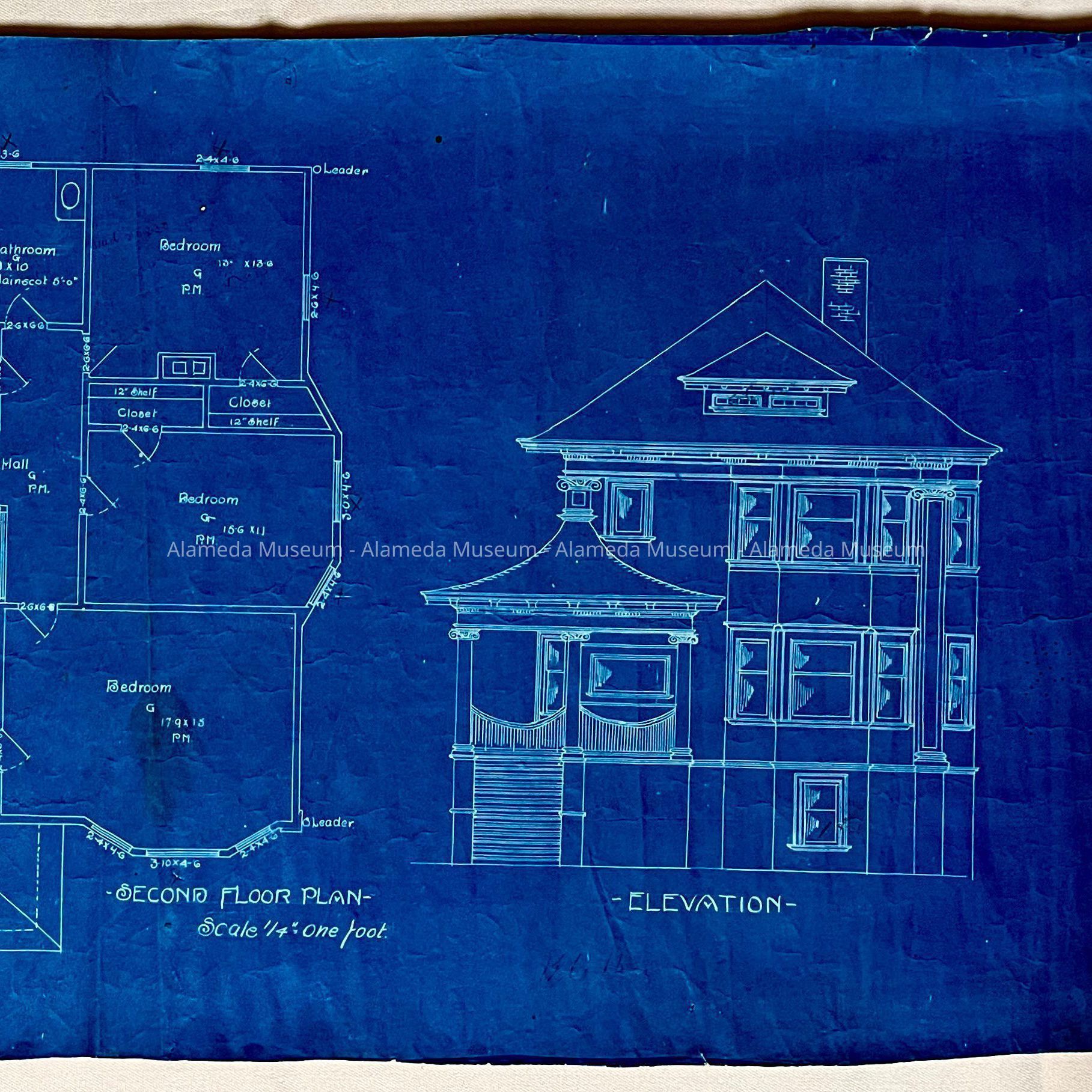 History of Object: Blueprint depicting first & second floors, and main facade