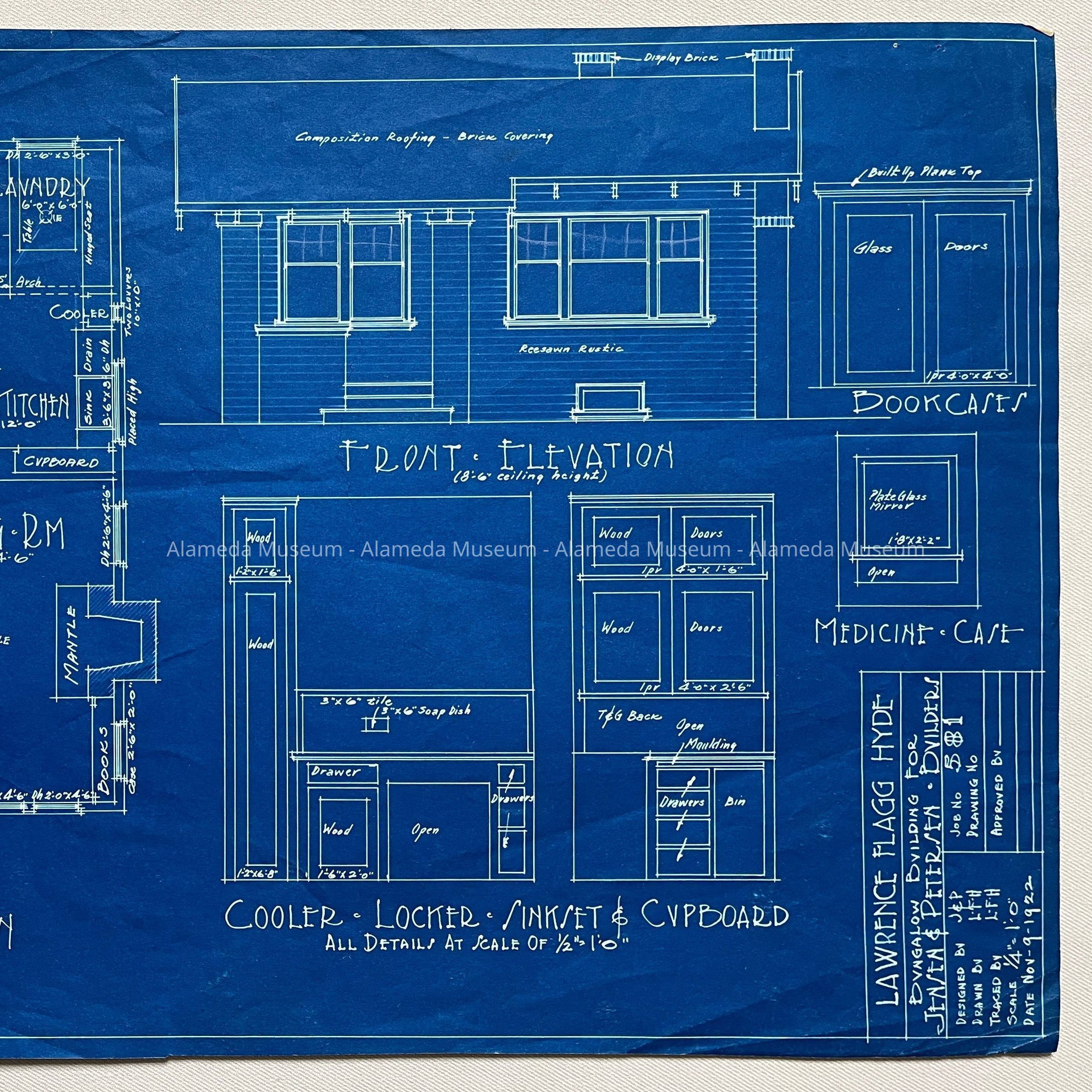 Description: Blueprint for a 3-bedroom house, with Front Elevation, Floor Plan, and design of 'BookCases', 'Medicine Case' and 'Cooler Locker Sinkset & Cupboard'. At bottom right: 'Lawrence Flagg Hyde'; 'Bungalow Building for Jensen & Petersen Builders', Job No 581, Date, Nov-9-1922.