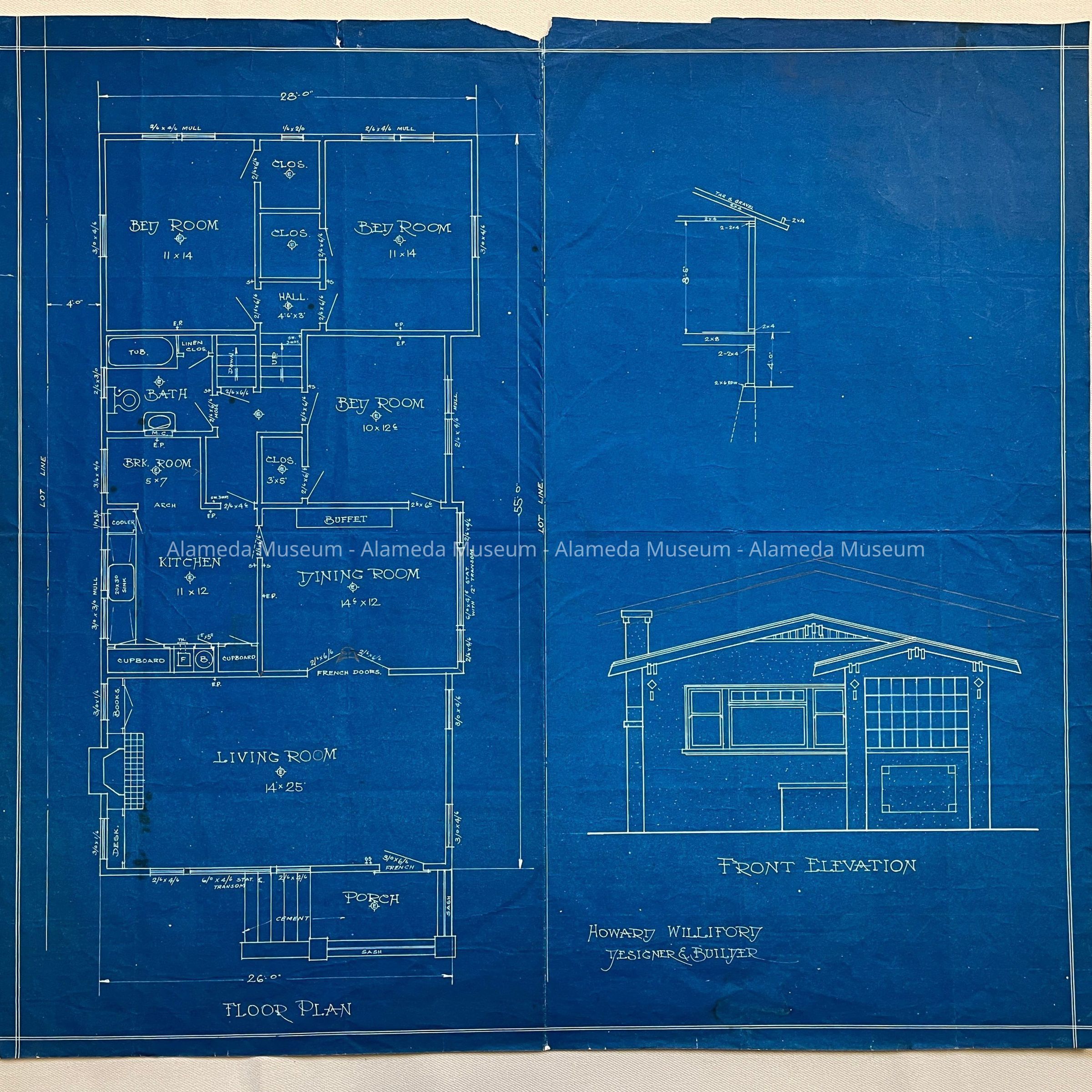 History of Object: Blueprint for an unidentified house, designed by Howard Williford. Howard Williford was a prolific builder, mostly smaller craftsman homes, in the 1920s in Alameda and neighboring cities, sometimes working as co-owner 'Williford & Klambt', sometimes for others (eg. Callie Back, H.G. Mehrtens). No specific house has been located matching this blueprint.