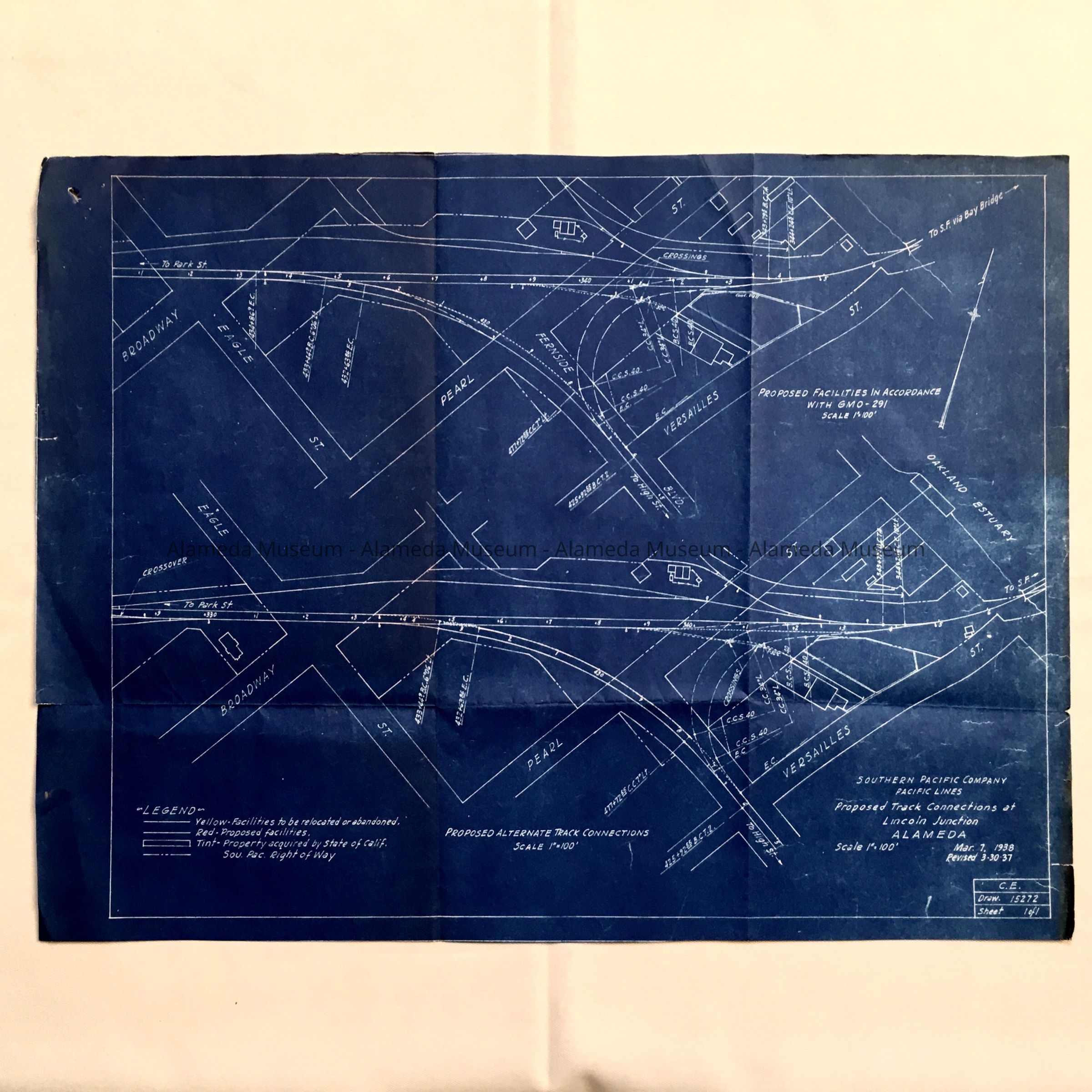 A BLUEPRINT DEPICTING A PROPOSED ALTERNATE TRACK CONNECTION OF THE SOUTHERN PACIFIC CO. AT LINCOLN JUNCTION, ALAMEDA, ON MARCH 7, 1938.