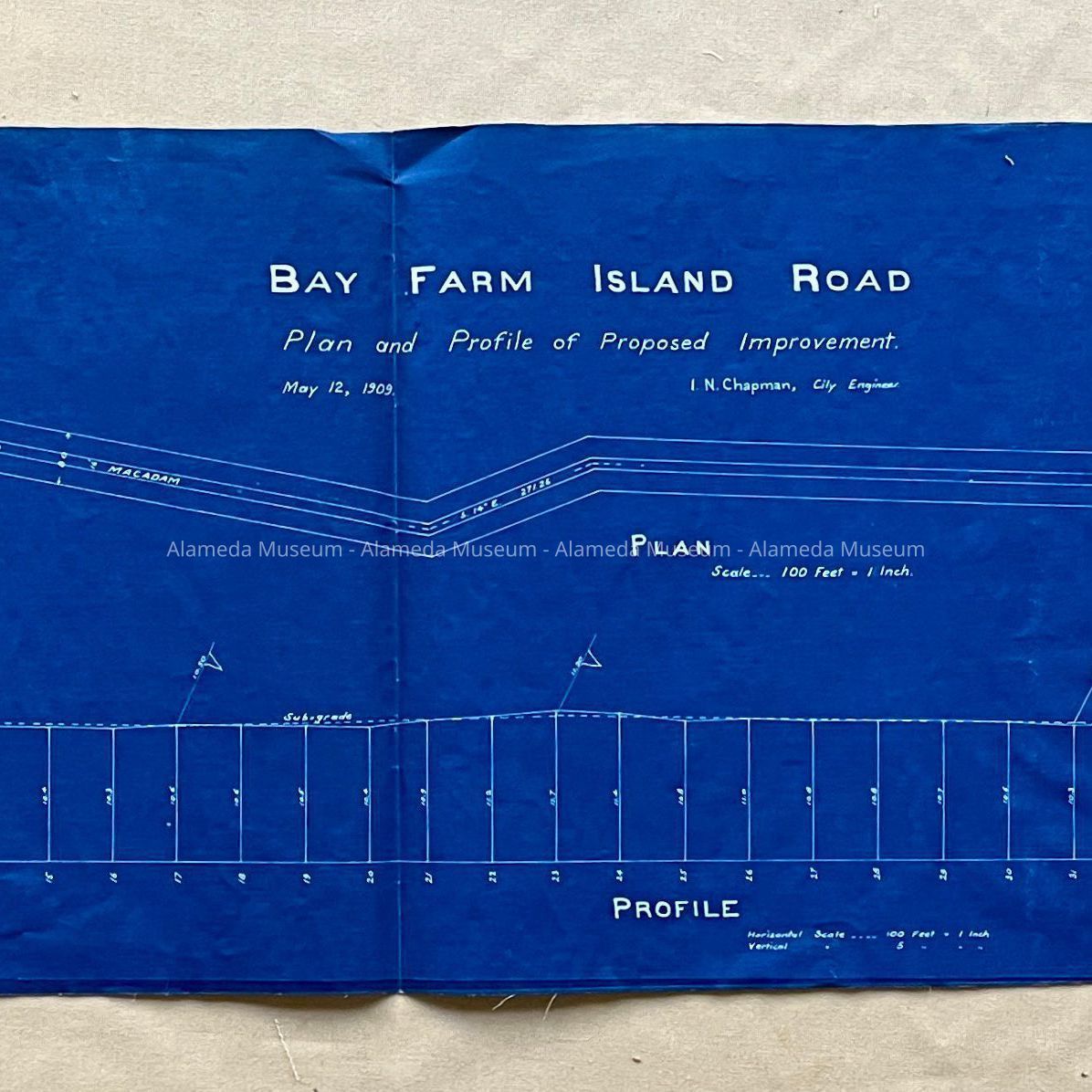 HISTORY OF OBJECT: BLUEPRINT OF PLAN AND PROFILE OF PROPOSED IMPROVEMENT TO BAY FARM ISLAND ROAD, DATED MAY 12, 1909. BY I. N. CHAPMAN.