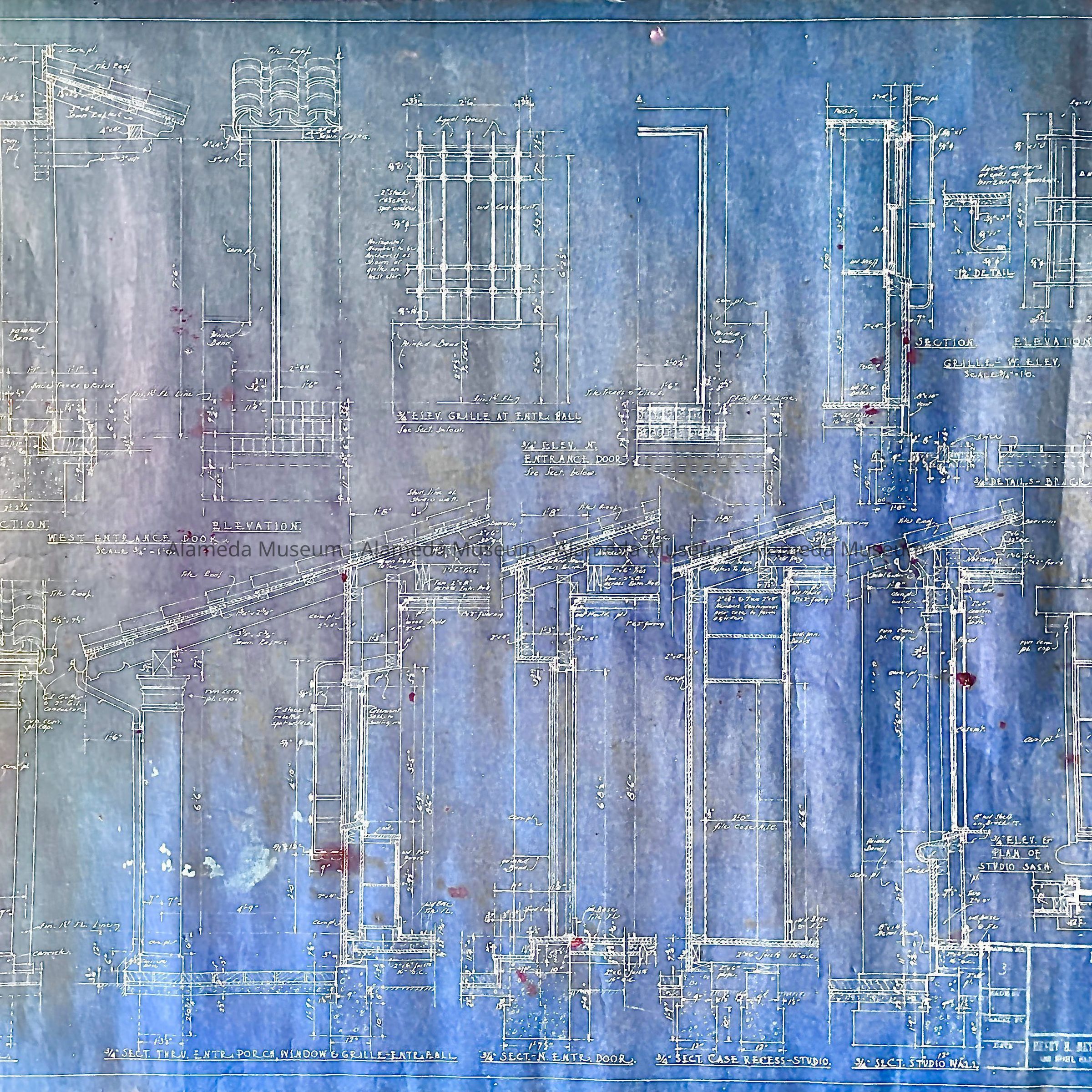 BLUEPRINT DISPLAYS ENTRANCE DETAIL, WINDOW AND GRILLE, MAIN FACADE OF STUDIO AND LIBRARY ANNEX OF THE HENRY H MEYERS' RESIDENCE LOCATED AT 2021 ALAMEDA AVENUE, ALAMEDA, CALIFORNIA.