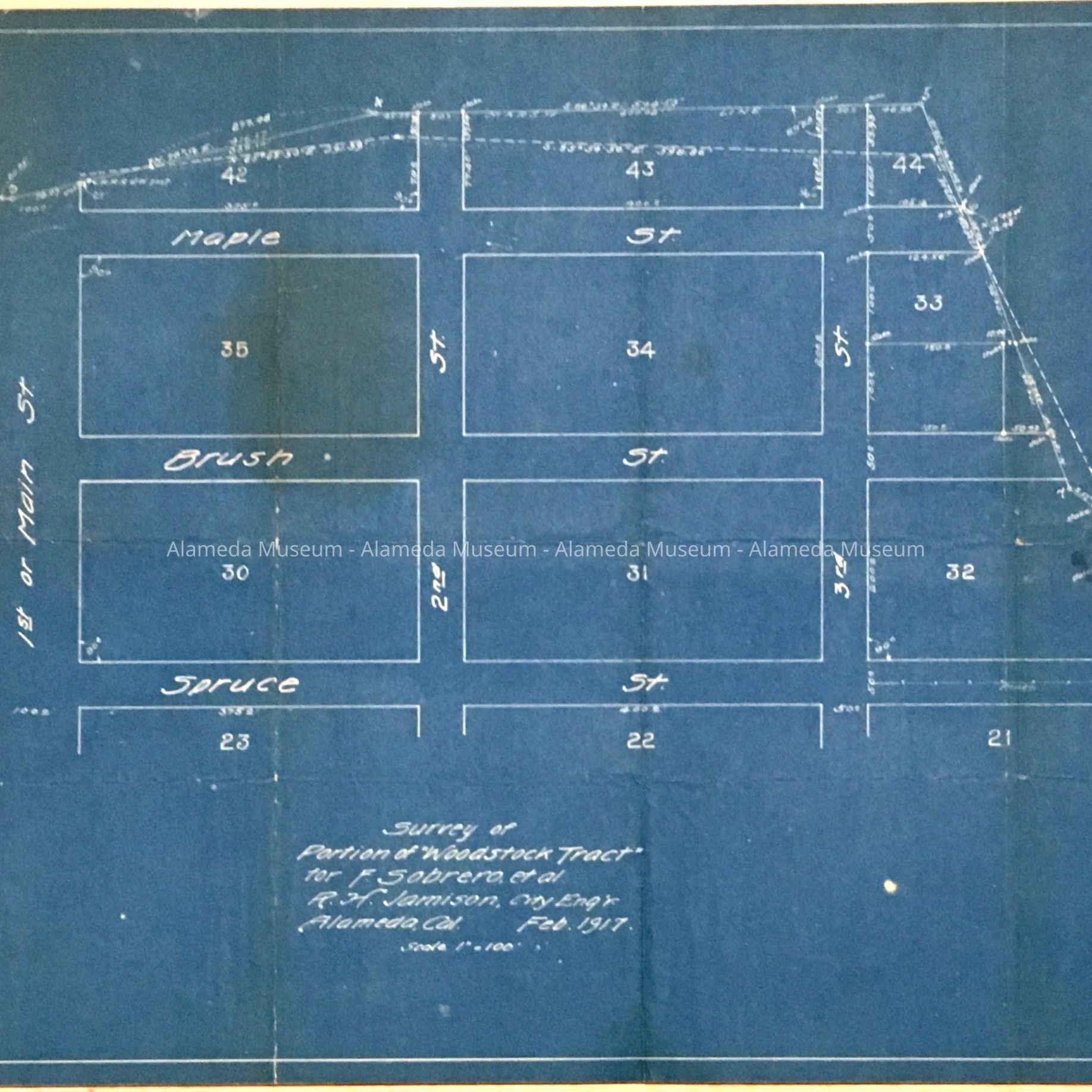 History of Object: Blueprint "Survey of Portion of Woodstock Tract," for F. Sobrero, et al. R. H. Jamison, City Engineer. Alameda, Cal. Feb. 1917. Land bounded by Spruce, Maple, 1st (Main) & 3rd Streets.