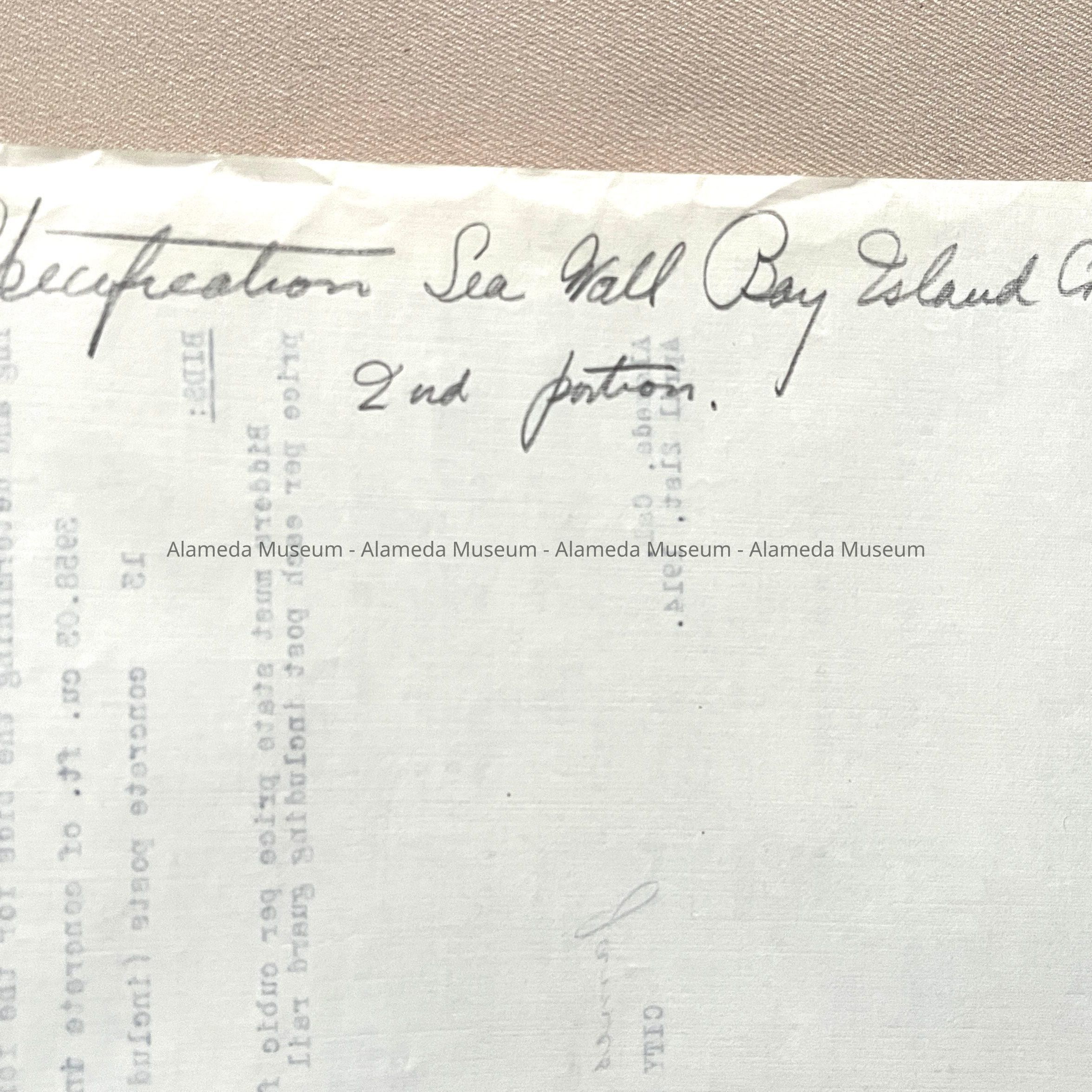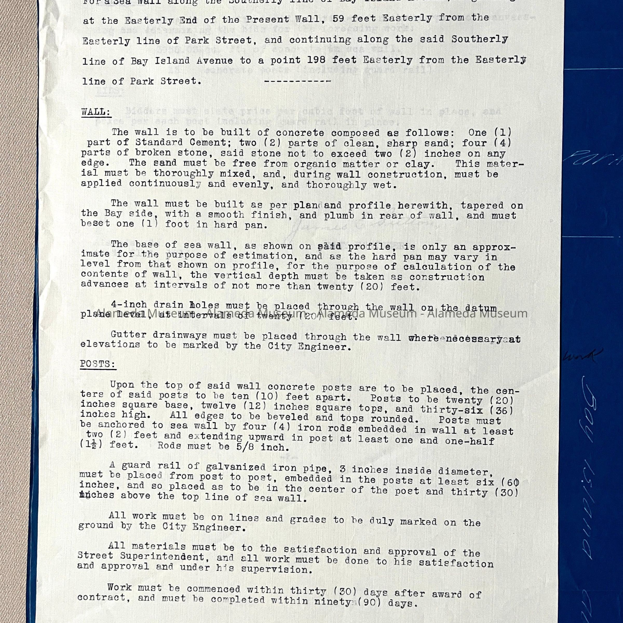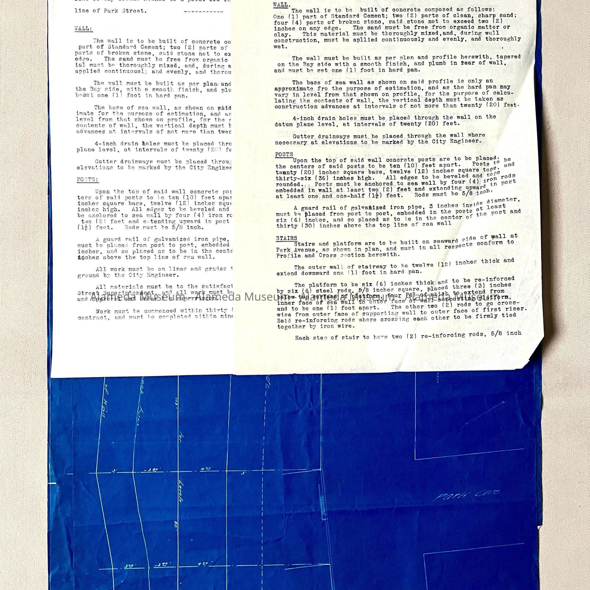 SPECIFICATIONS AND BLUEPRINTS FOR A SEA WALL ON THE SOUTHERLY LINE OF BAY ISLAND AVENUE (NOW KNOWN AS OTIS DRIVE), EAST OF PARK STREET, ALAMEDA, CALIFORNIA. BLUEPRINTS ARE SIGNED BY J E SUTTON, CITY ENGINEER.