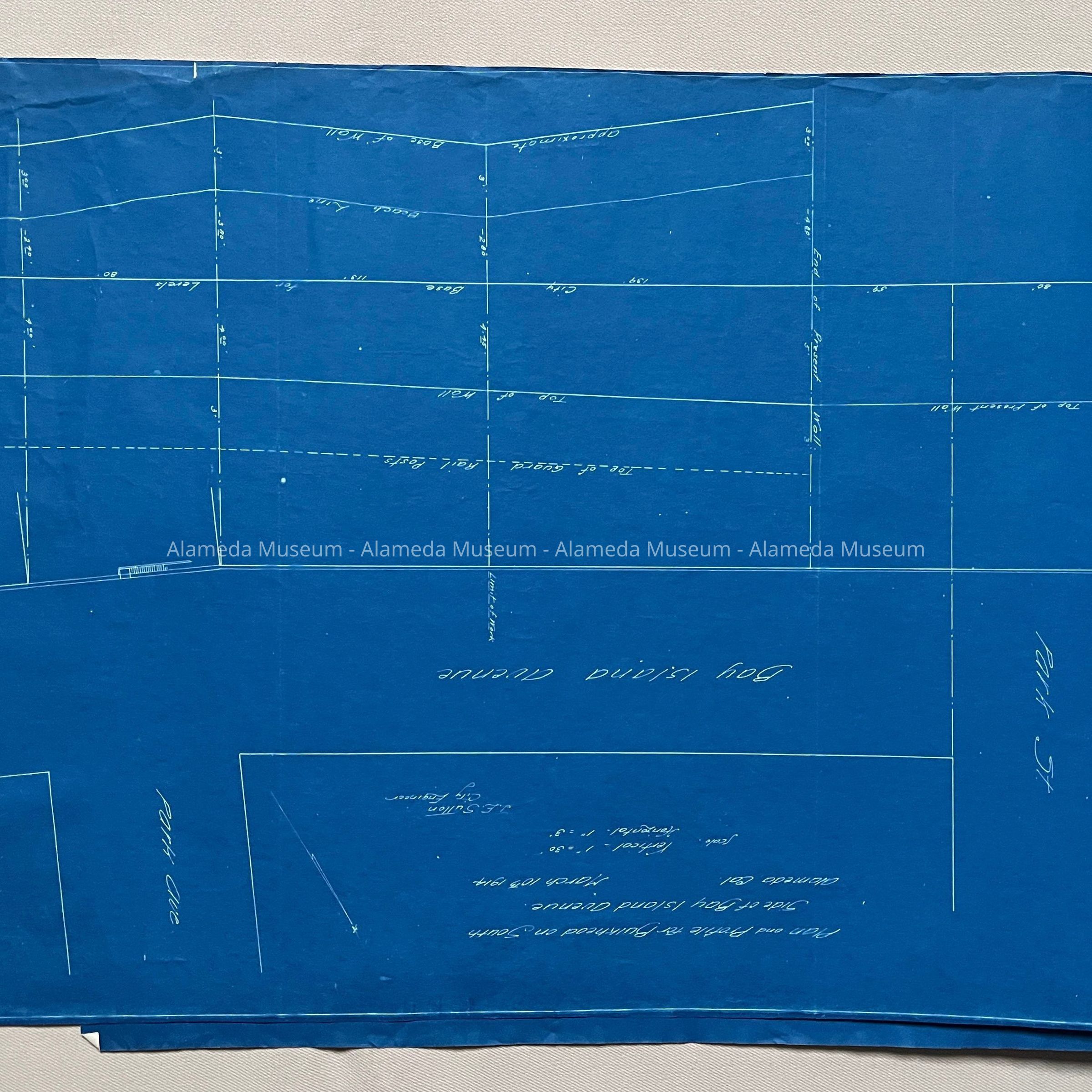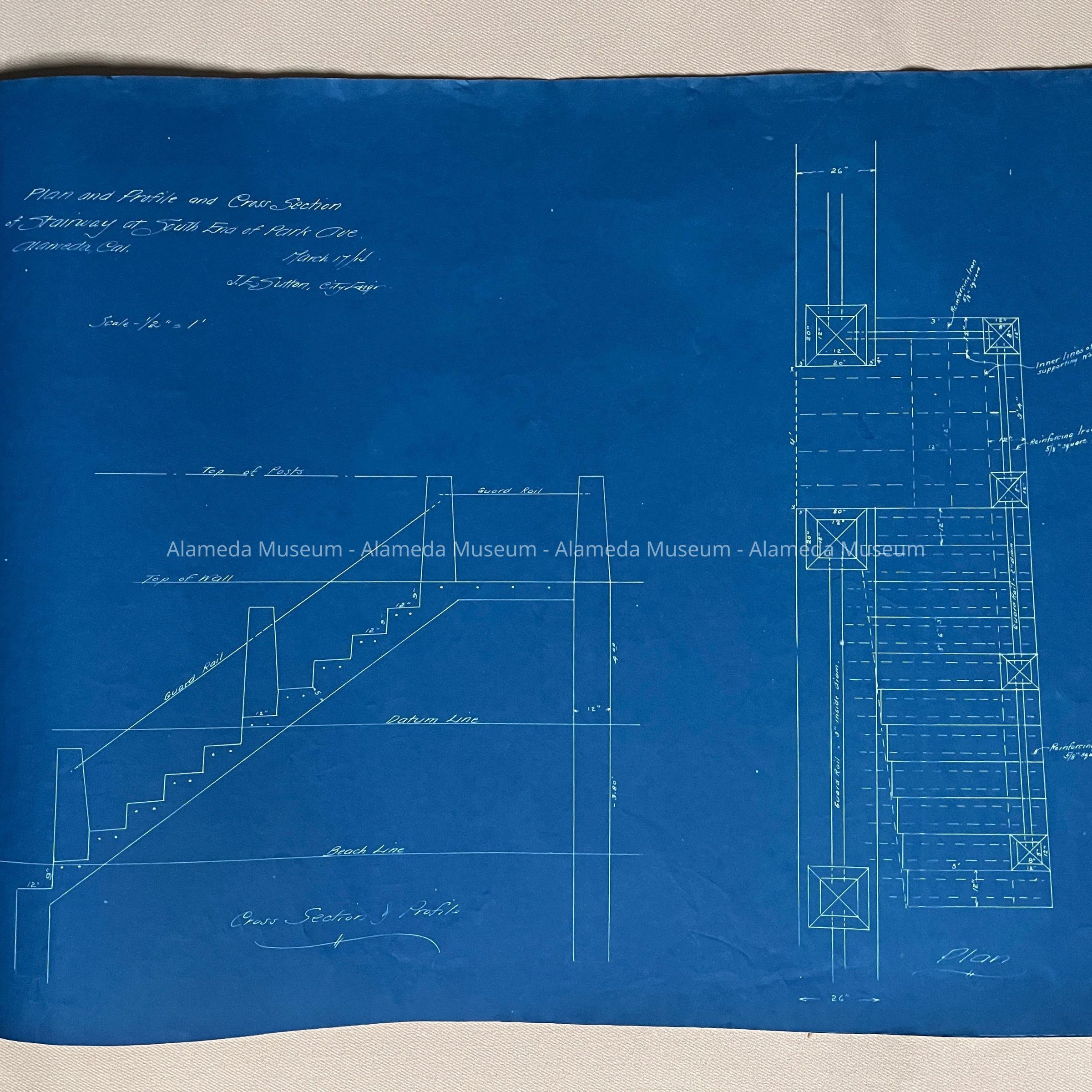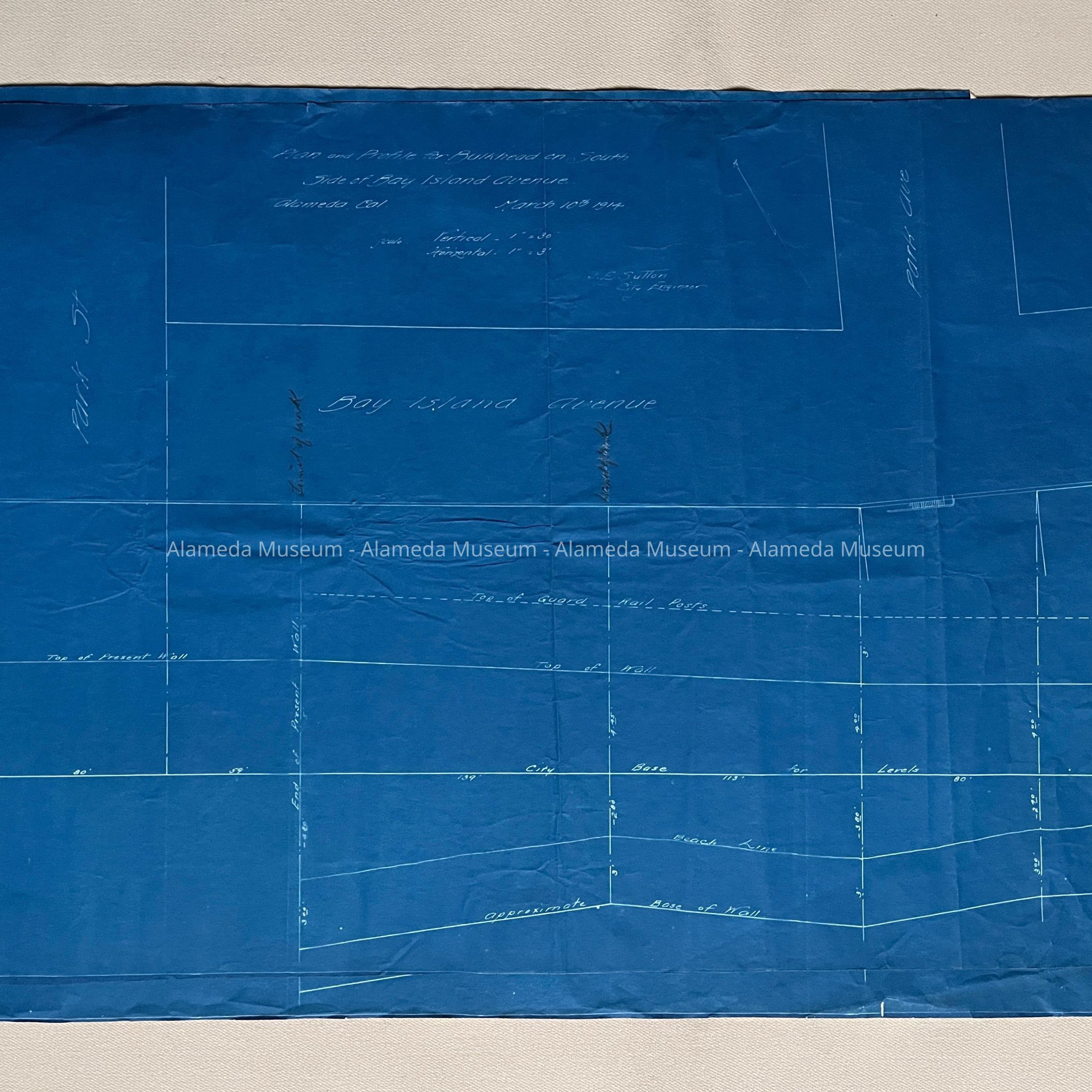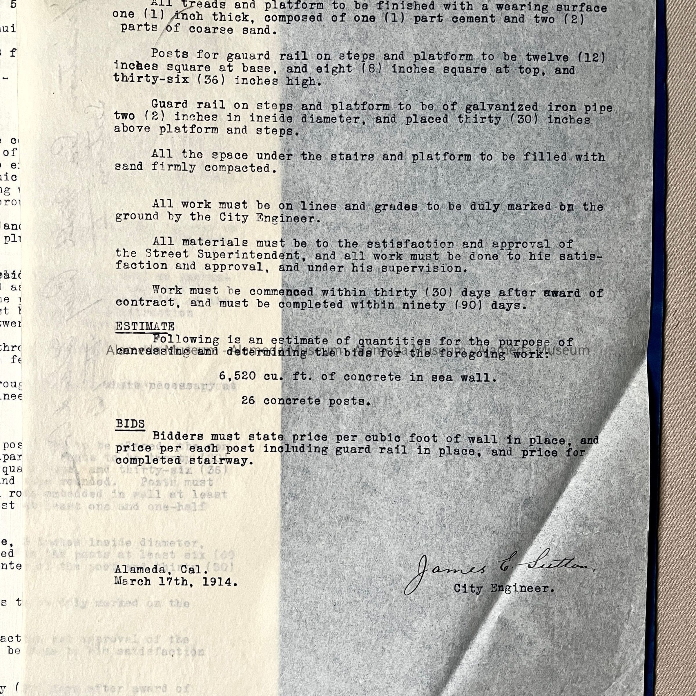 SPECIFICATIONS AND BLUEPRINTS FOR A SEA WALL ON THE SOUTHERLY LINE OF BAY ISLAND AVENUE (NOW KNOWN AS OTIS DRIVE), EAST OF PARK STREET, ALAMEDA, CALIFORNIA. BLUEPRINTS ARE SIGNED BY J E SUTTON, CITY ENGINEER.