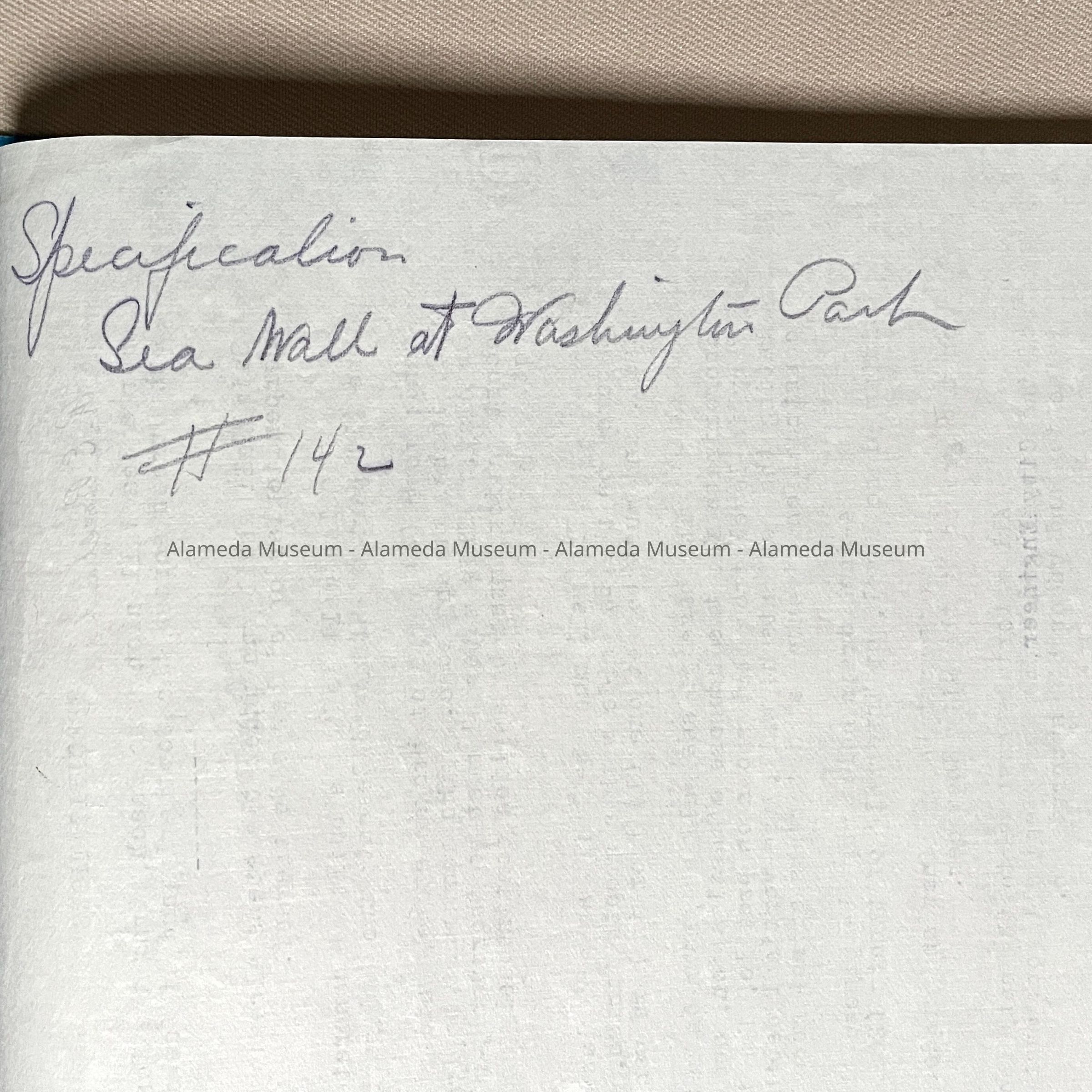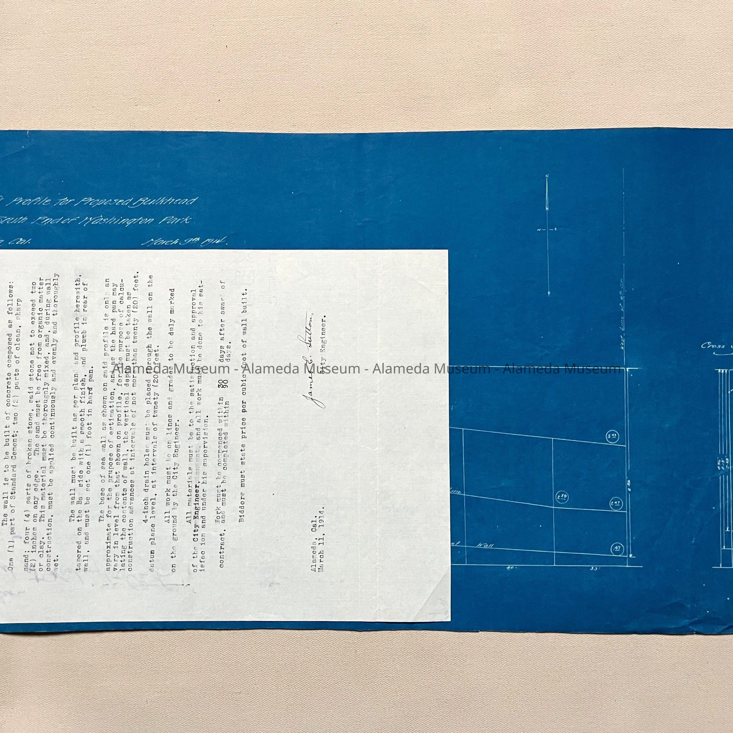 SPECIFICATION AND BLUEPRINT FOR THE CONSTRUCTION OF THE SEA WALL ALONG THE BEACH, FROM THE WESTERLY LINE OF EIGHTH STREET ACROSS THE SOUTHERLY END OF WASHINGTON PARK, ALAMEDA, CALIF.