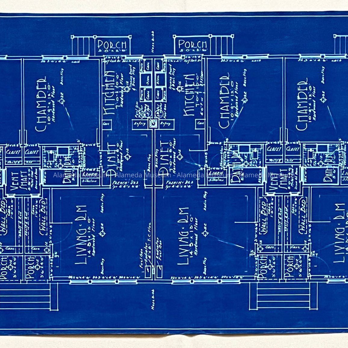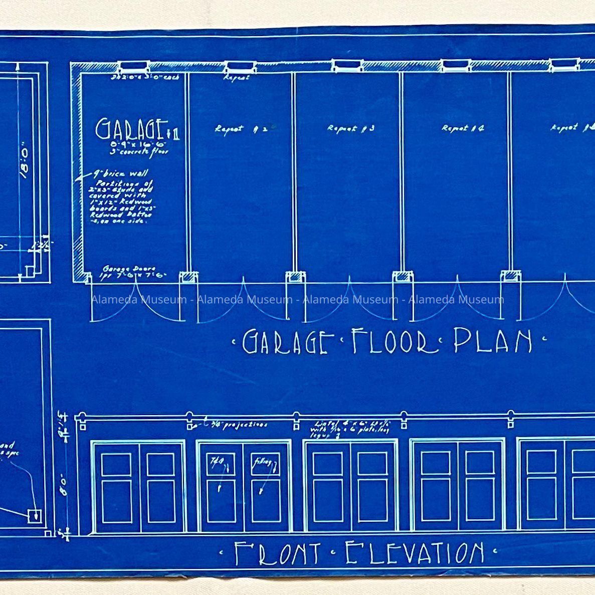 HISTORY OF OBJECTS: ARCHITECTURAL DRAWINGS FOR A BUNGALOW COURT, WITH JOINED UNITS OF THREE ROOMS AND BATHS. ALSO INCLUDED ARE GARAGES, WHICH HAVE OPENINGS FOR 6 VEHICLES. THE PLAN OF THE FOUNDATION AND ROOF ARE ALSO SHOWN. AT THIS TIME WE DO NOT KNOW WHETHER THE BUNGALOWS AND ACCOMPANYING PROPERTY WERE EVER CONSTRUCTED.