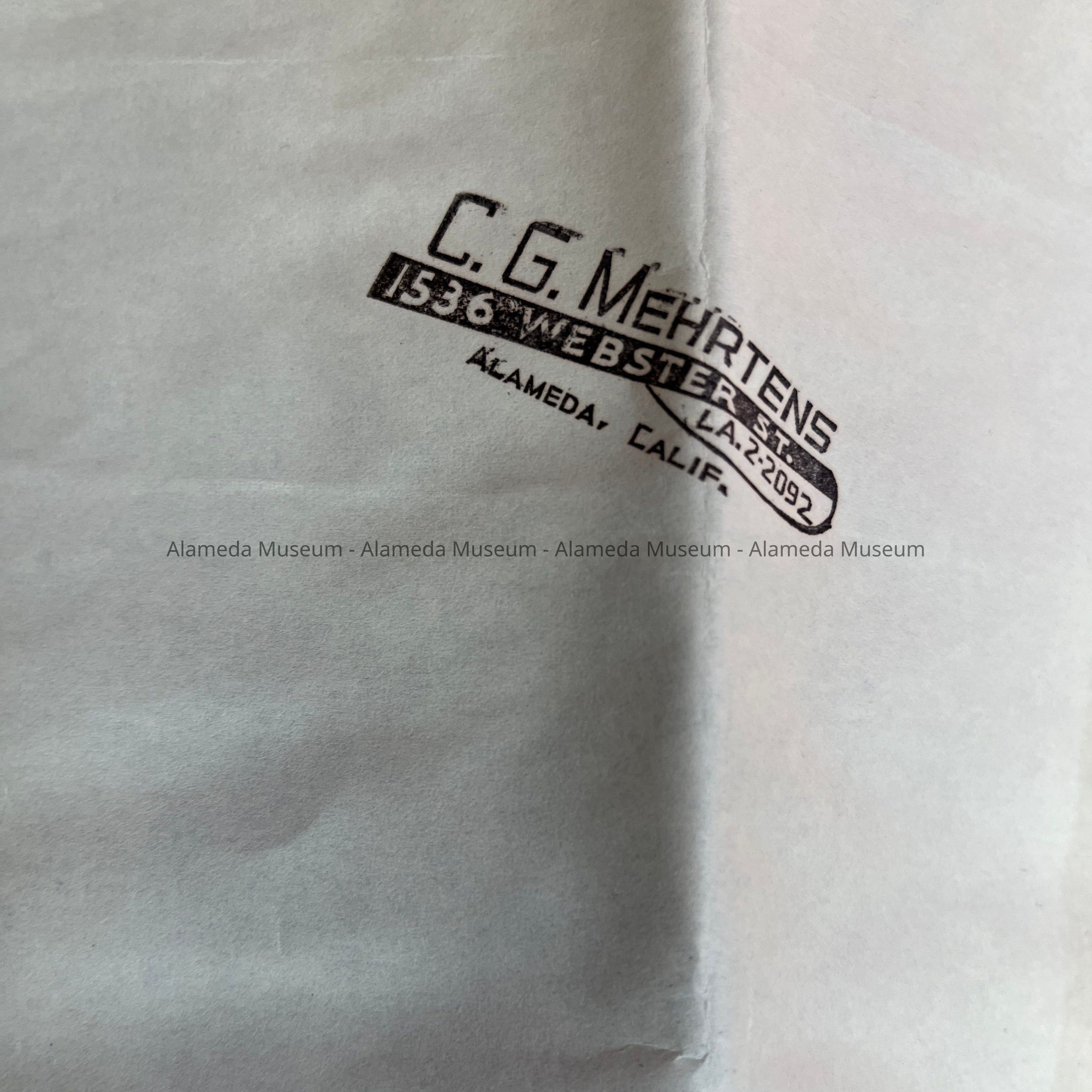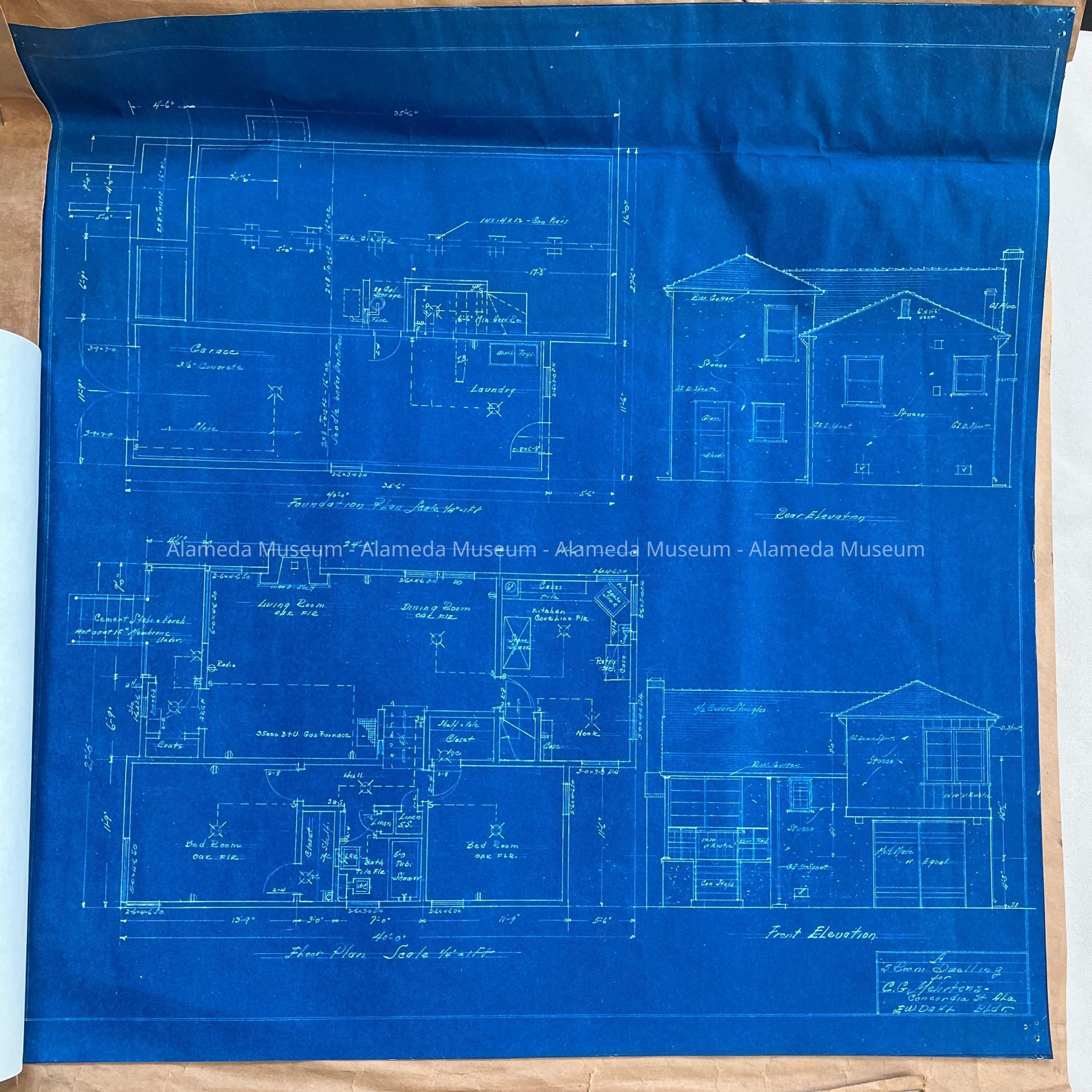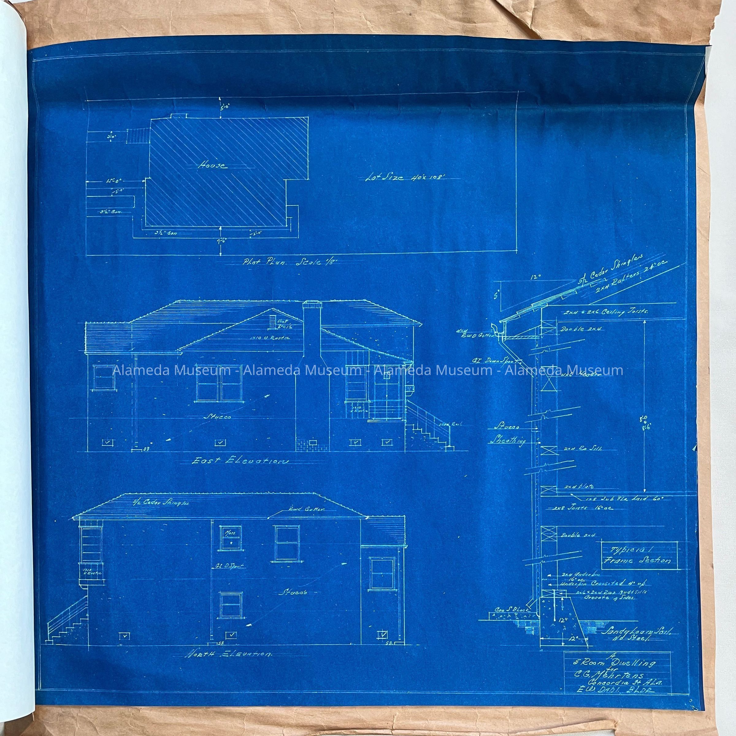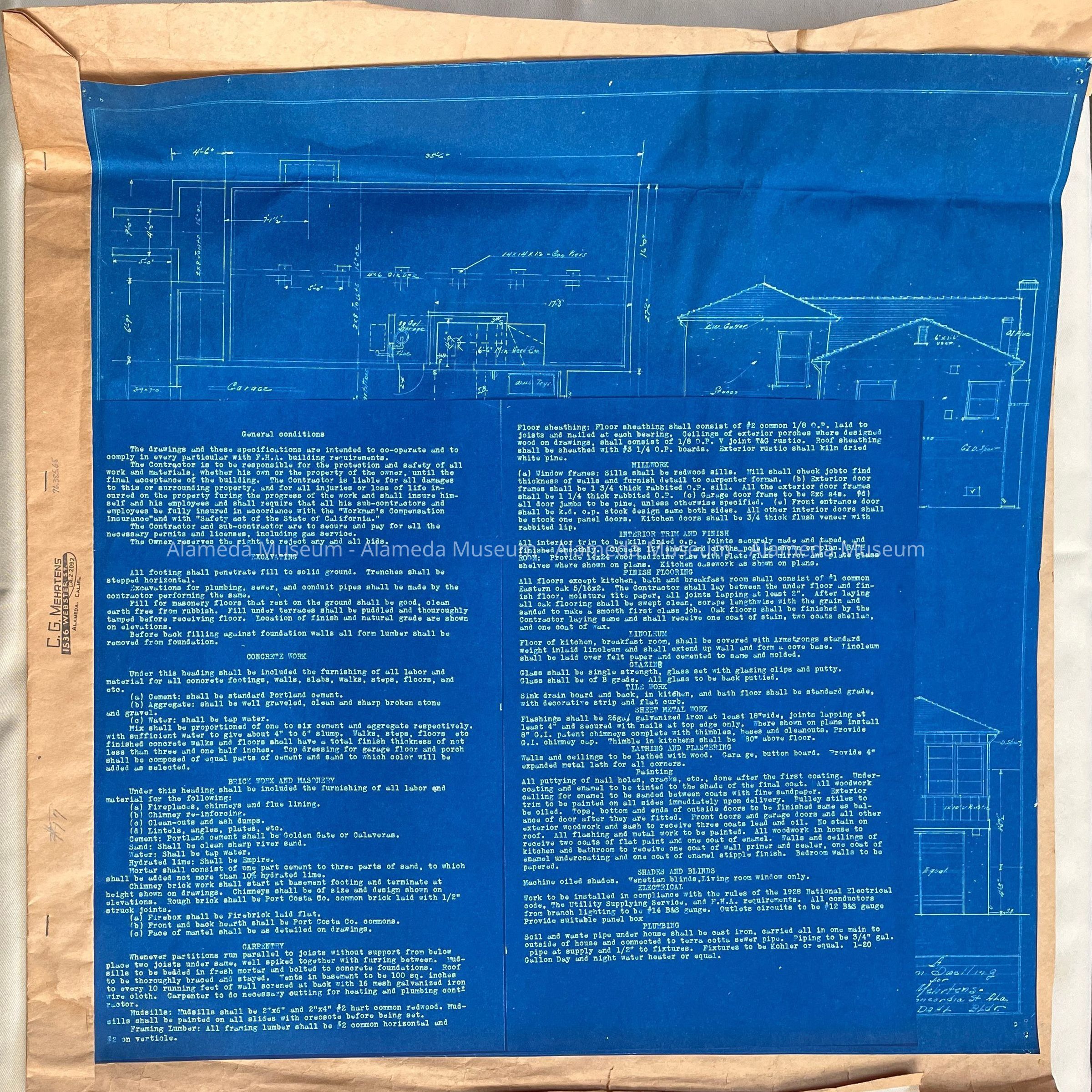 BLUEPRINTS FOR A FIVE-ROOM DWELLING FOR C G MEHRTENS, CONCORDIA STREET, ALAMEDA, CALIFORNIA. EDWIN W DAHL, BUILDER. BLUEPRINTS ALSO INCLUDE GENERAL CONDITIONS AND INSTRUCTIONS CONCERNING CONCRETE, BRICK WORK, ETC.