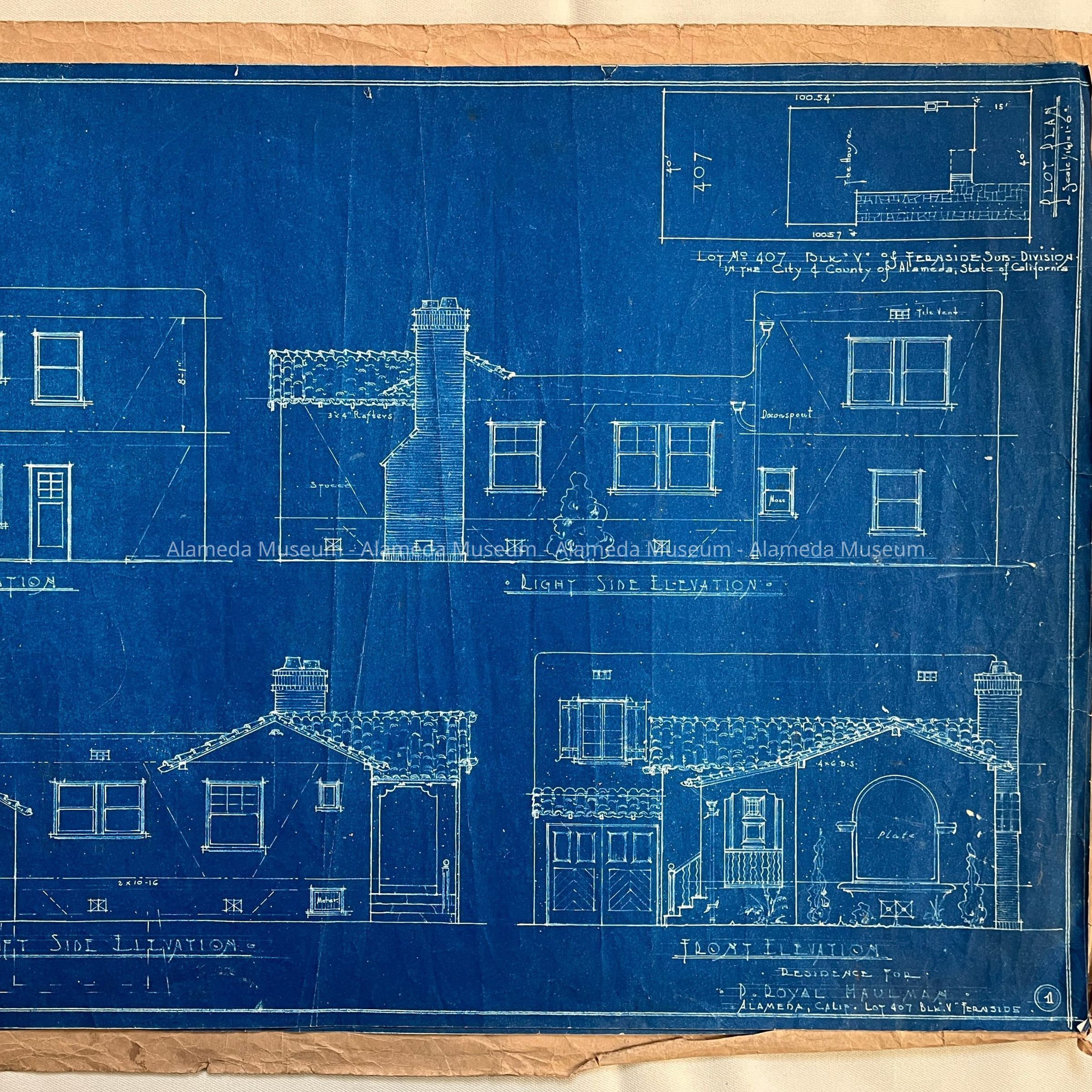 BLUEPRINTS OF EXTERIOR ELEVATION PLUS FLOOR PLAN FOR A MEDITERRANEAN-STYLE RESIDENCE FOR P R HAULMAN, BUILDER. LOT #407, BLOCK "V," FERNSIDE, ALAMEDA, CALIFORNIA.