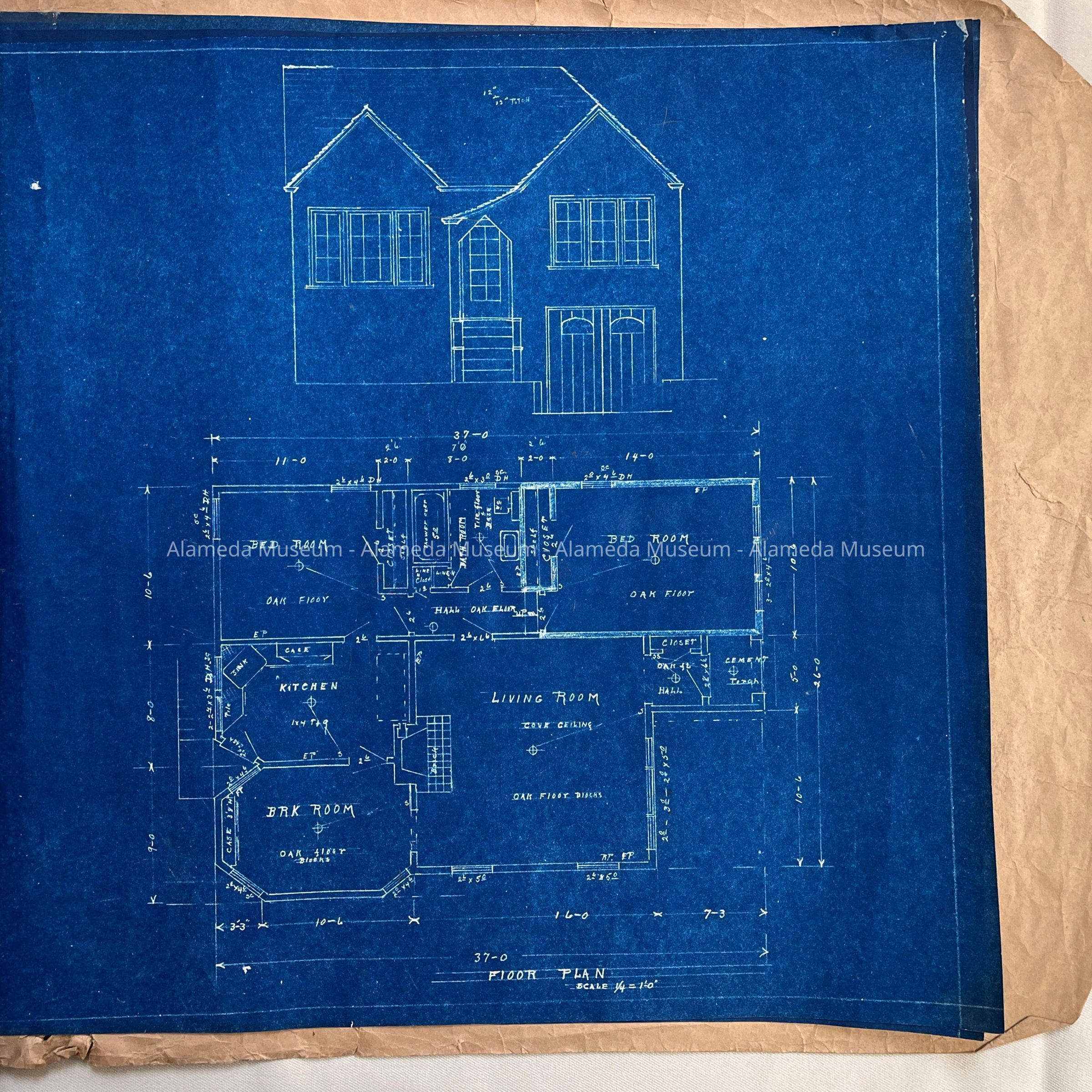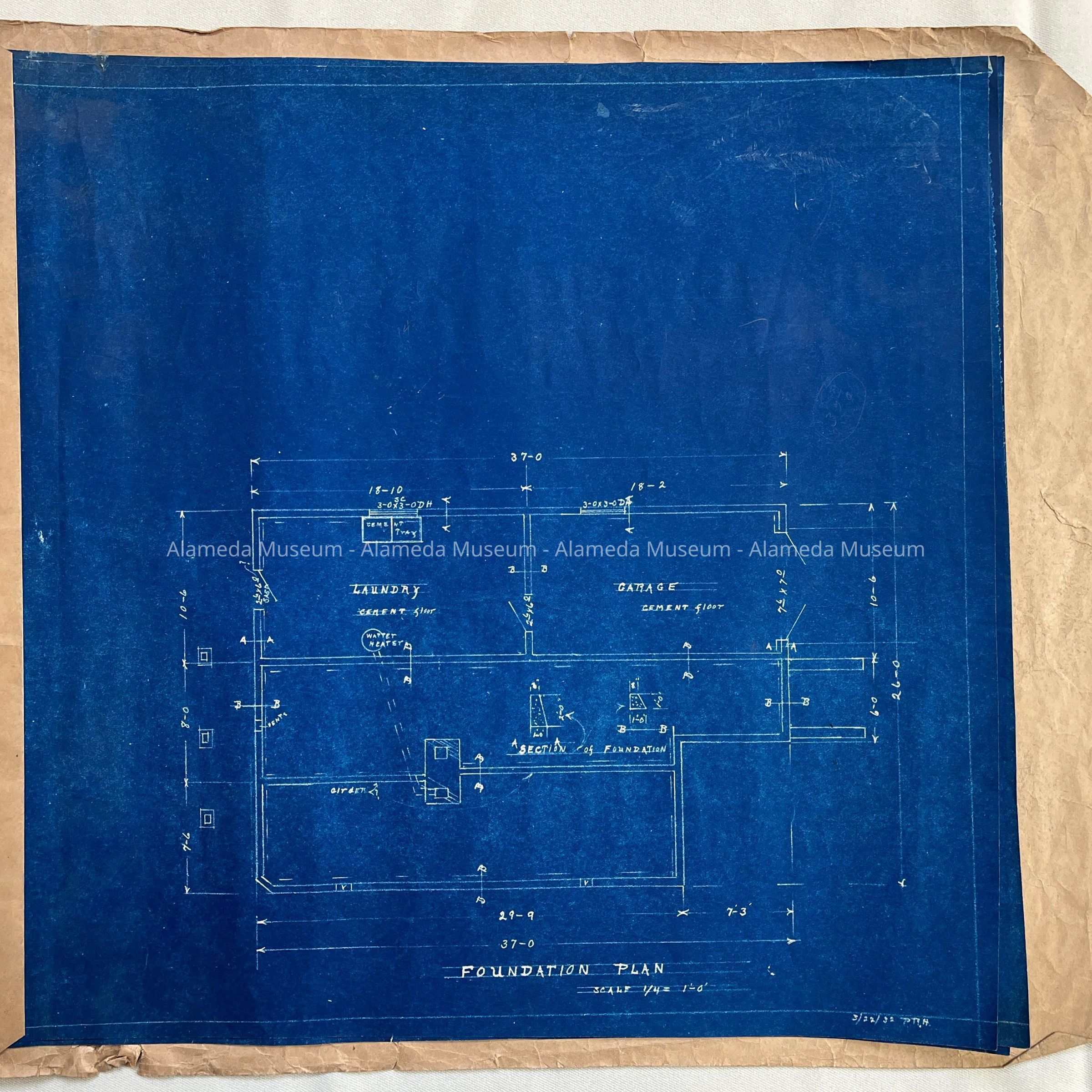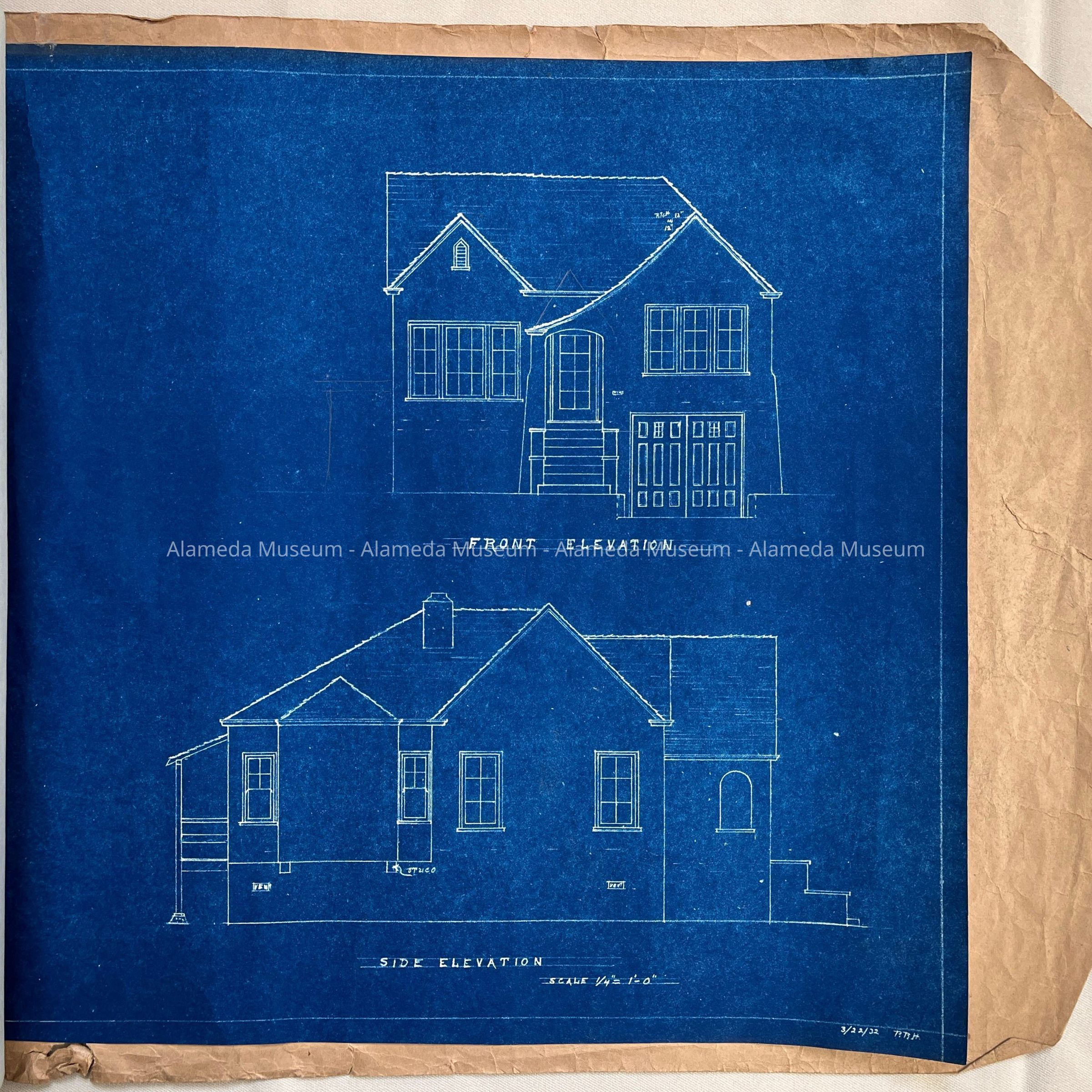 EXTERIOR ELEVATION AND FLOOR PLAN FOR A RESIDENCE AT AN UNKNOWN LOCATION. BLUEPRINTS ARE DATED MARCH 22, 1932 AND SIGNED BY P R HAULMAN.