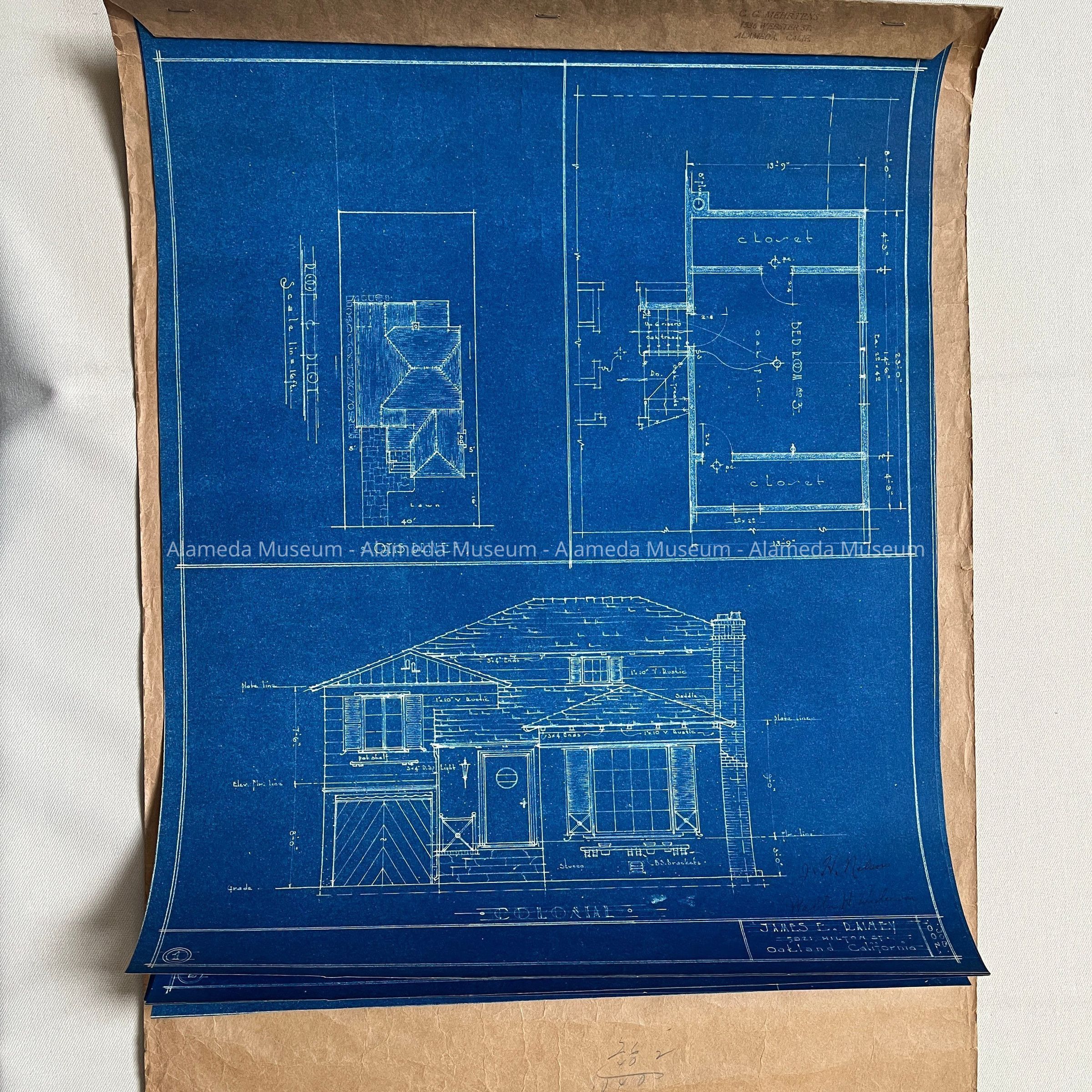 EXTERIOR ELEVATIONS AND FLOOR PLAN FOR A COLONIAL STYLE RESIDENCE. PLANS SIGNED BY JAMES E RAINEY, OAKLAND. POSSIBLY BUILT FOR HART, OTIS DRIVE, ALAMEDA, CA.