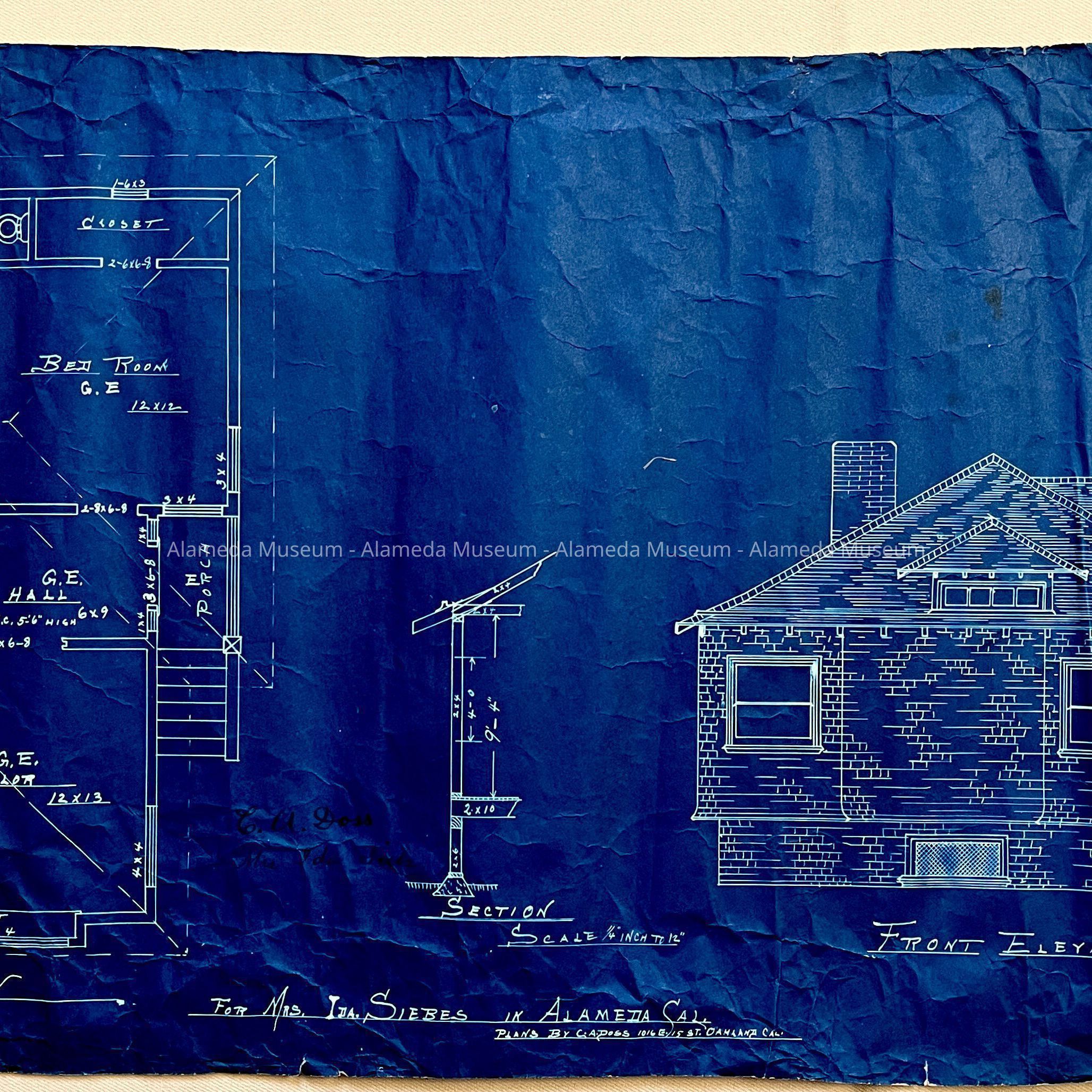 Description: One-page blueprint detailing exterior front elevation and floor plan. Blueprint caption states "For Mrs. Ida Siebs in Alameda, California”.