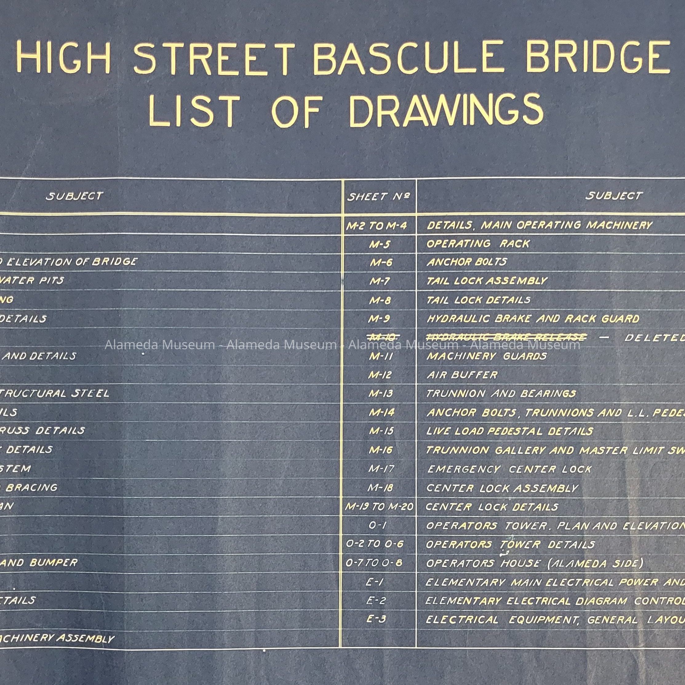 Description: Set of blueprints for the High Street Bridge. 69 of the 70 drawings listed in the index are in this set. Drawing F-14 is missing. A loose duplicate of drawing A-1 is also included. Almost all of the drawings are the same size, but a few are longer and folded over to match the width of the others.