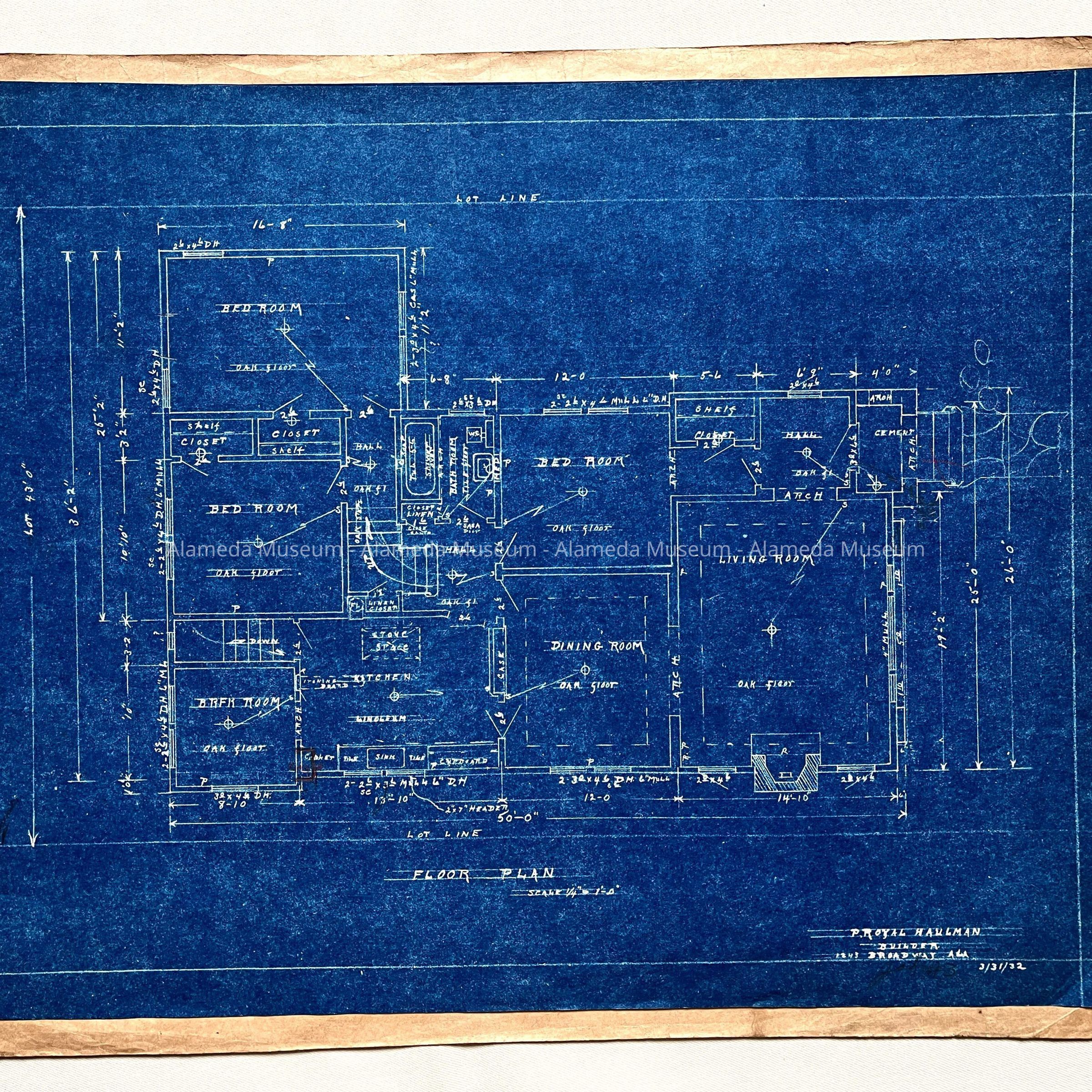 EXTERIOR ELEVATION AND FLOOR PLAN FOR A MEDITERRANEAN-STYLE RESIDENCE TO BE BUILT FOR P ROYAL HAULMAN, AND DATED MARCH 6, 1932. SITE UNKNOWN.