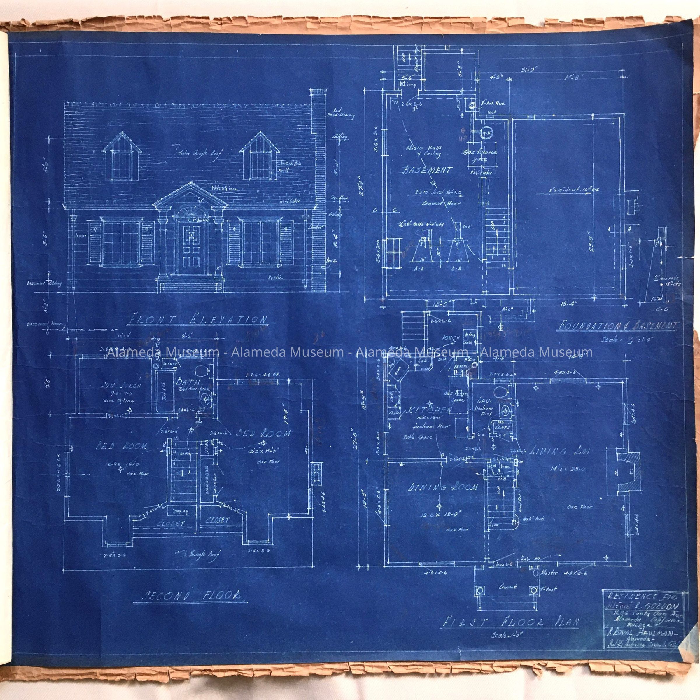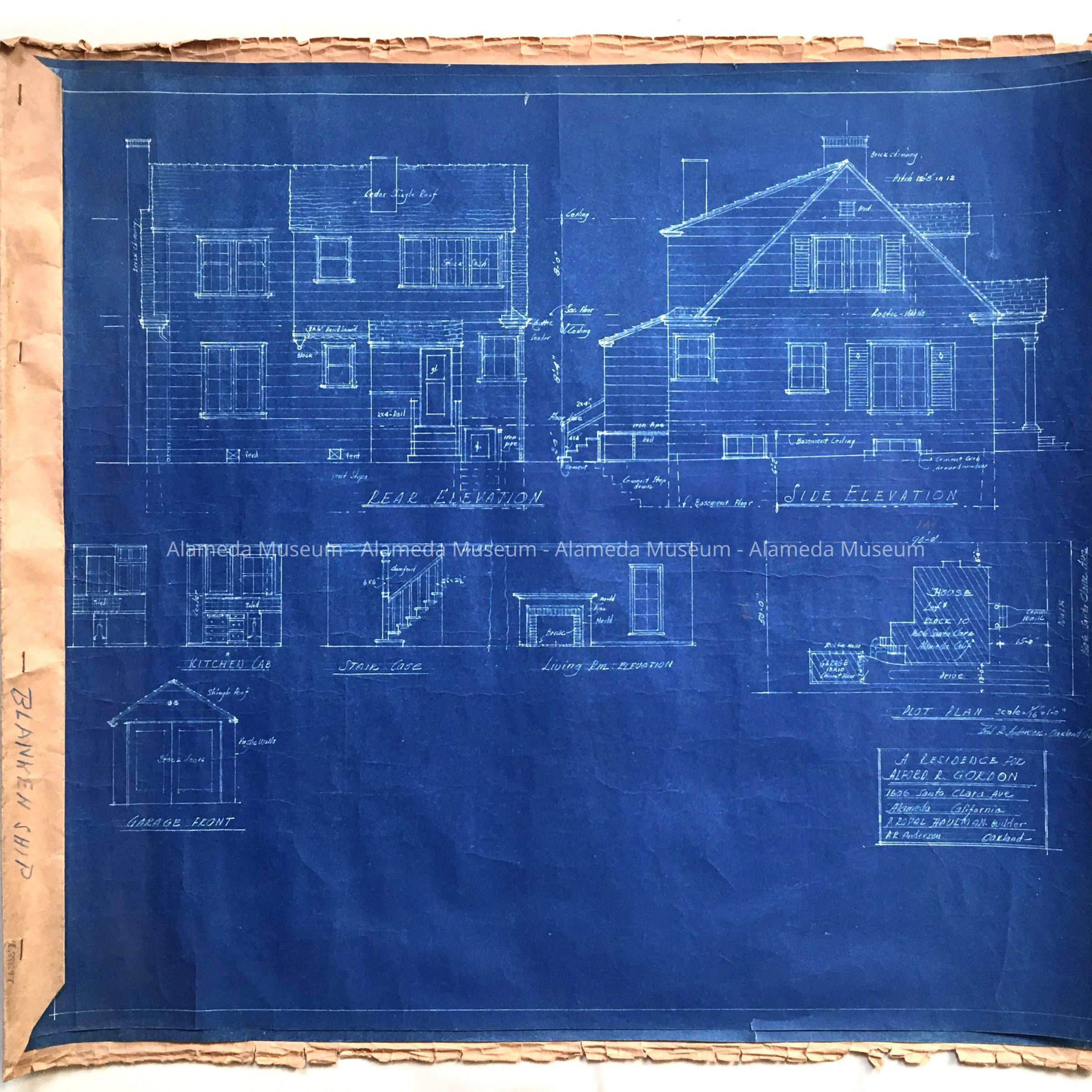 HISTORY OF OBJECT: TWO PAGES OF BLUEPRINTS REPRESENTING A RESIDENCE FOR ALFORD GORDON, 1606 SANTA CLARA AVENUE, ALAMEDA, CALIFORNIA. P ROYAL HAULMAN, BUILDER. P R ANDERSON, ARCHITECT, OAKLAND.