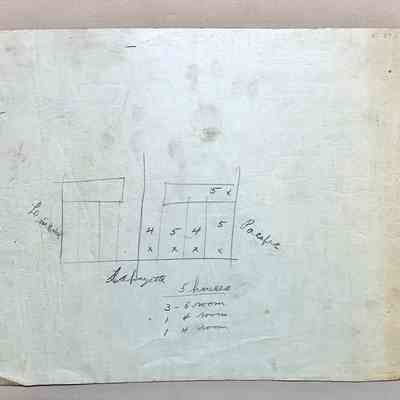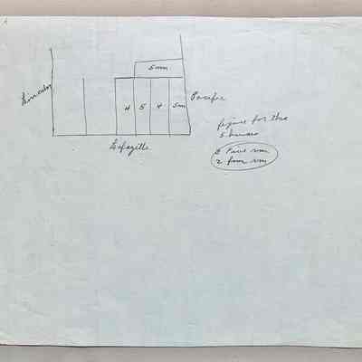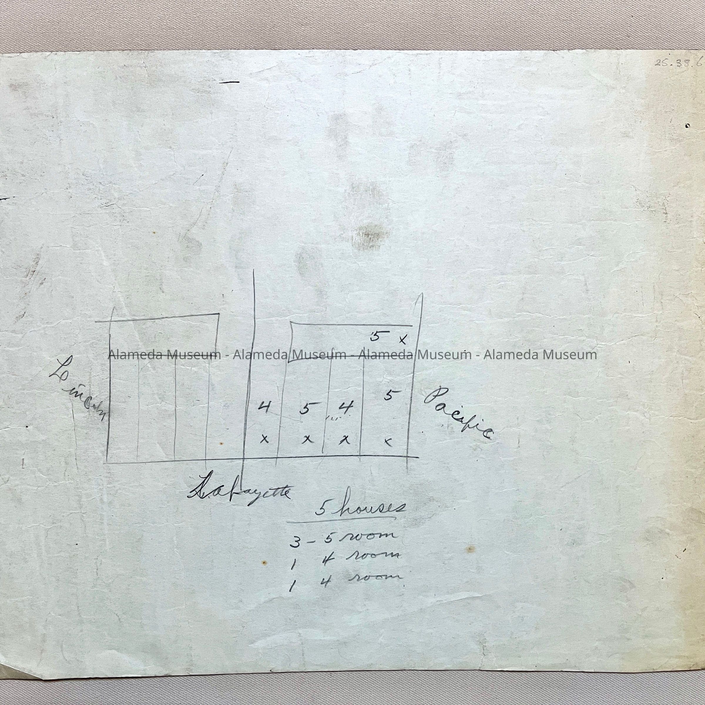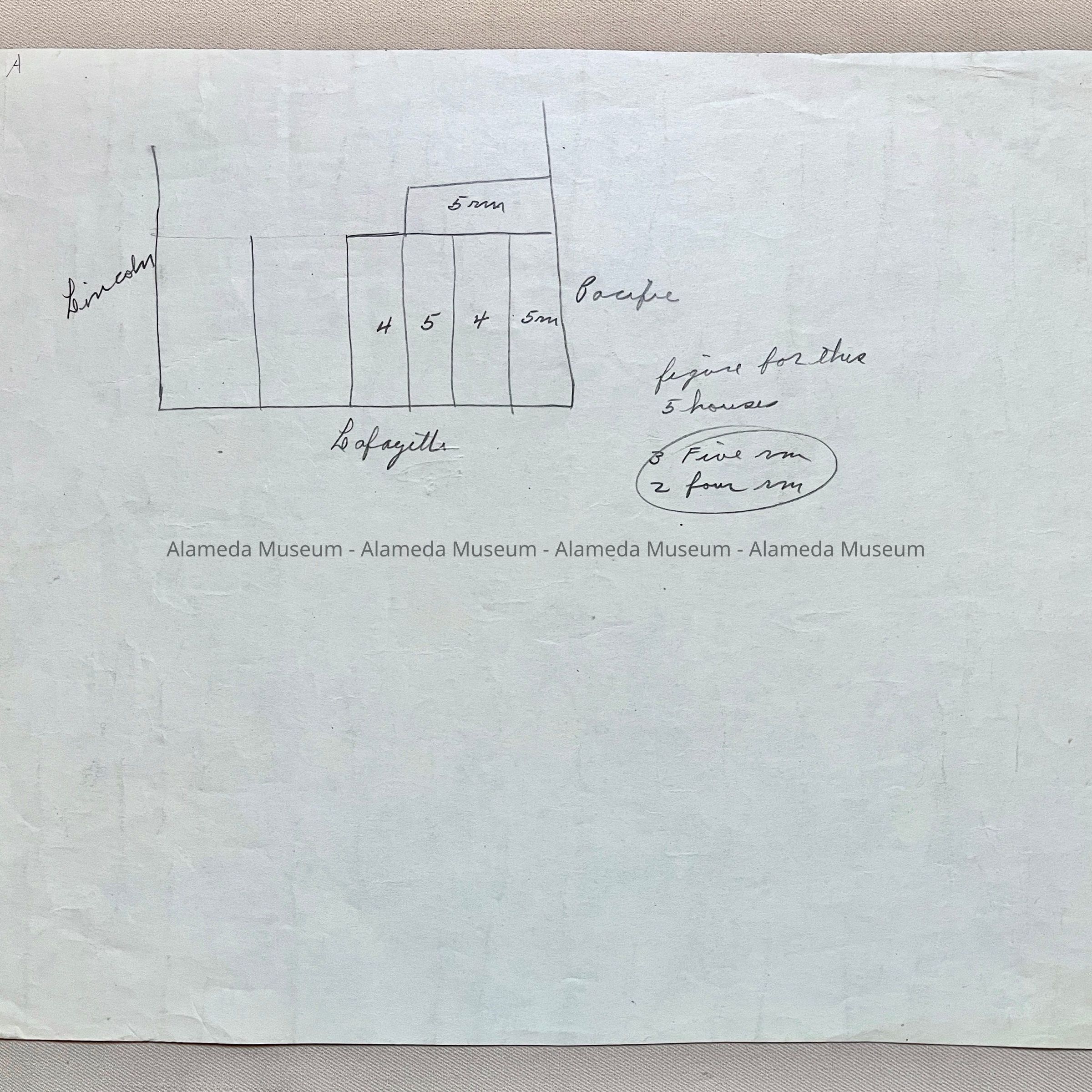 Description: Blueprints (two copies) of the ground floor plan of a house, no identifying information on the drawing. Versos have hand-drawn maps of 4 lots along Lafayette, between Lincoln and Pacific, and one lot on Pacific.
