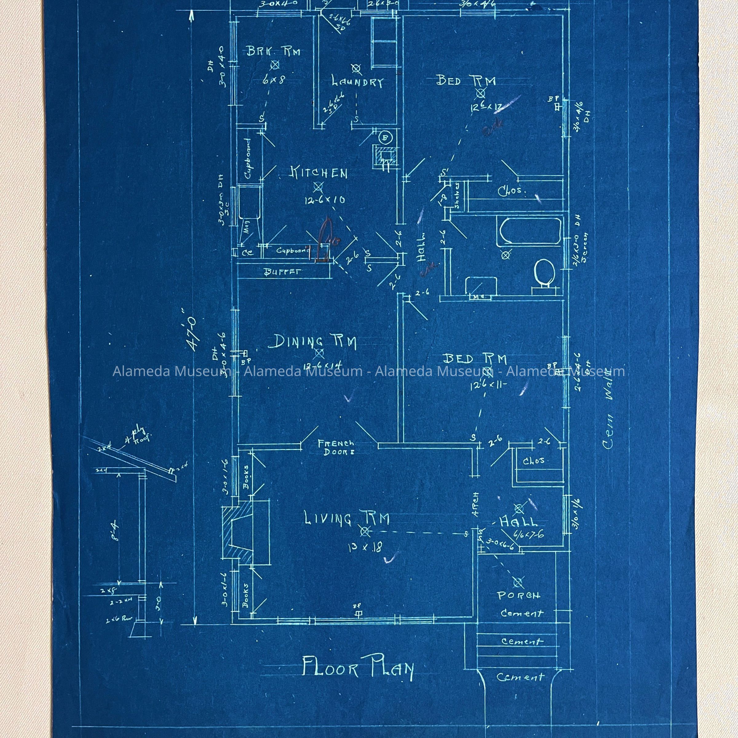History of Objects: A blueprint likely from the attic of the Office of H.G. or C.G. Mehrtens, real estate brokers. Assuming the map on the back is related, based on the position of the porch (right), and chimney (left) only 1601 Lafayette matches the layout, although a garage appears to have been added on the Lincoln side. City records suggest a remodel in 1959, perhaps the garage was added then. Other houses on the block (except 1625 Lafayette (built 1925)) appear similar in style to 1601, but have the porch and living room window reversed from the blueprint, or completely different layout (1832 Pacific).
