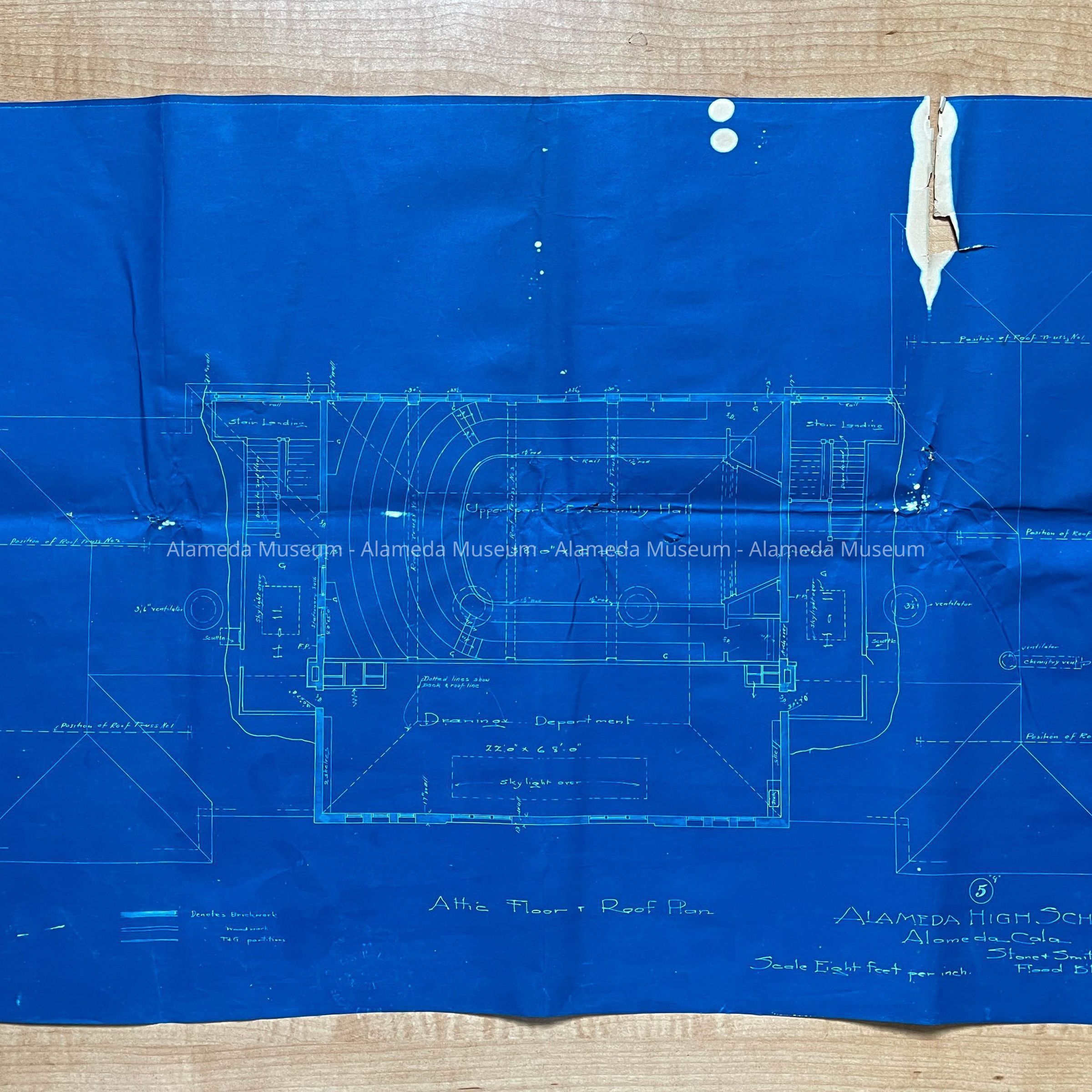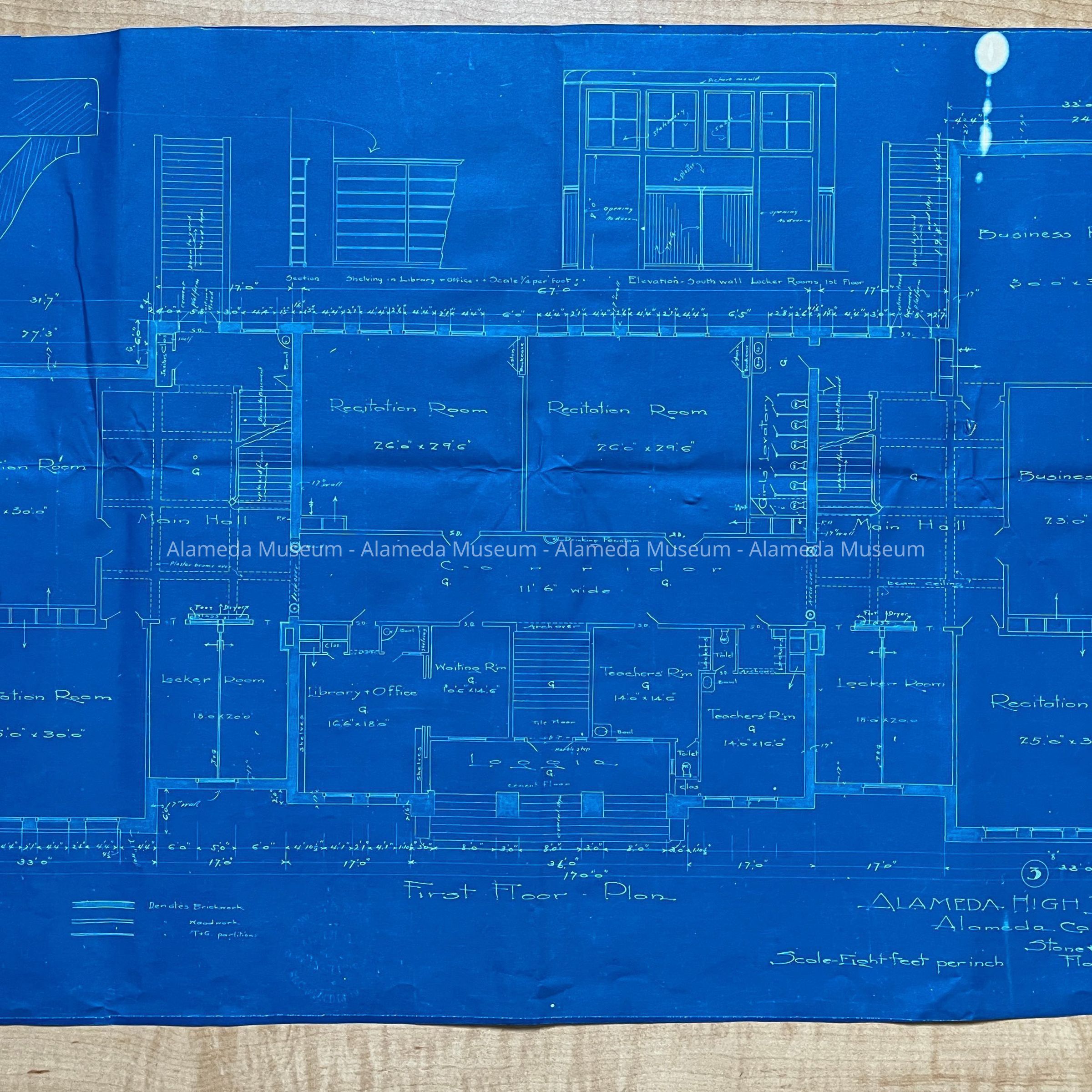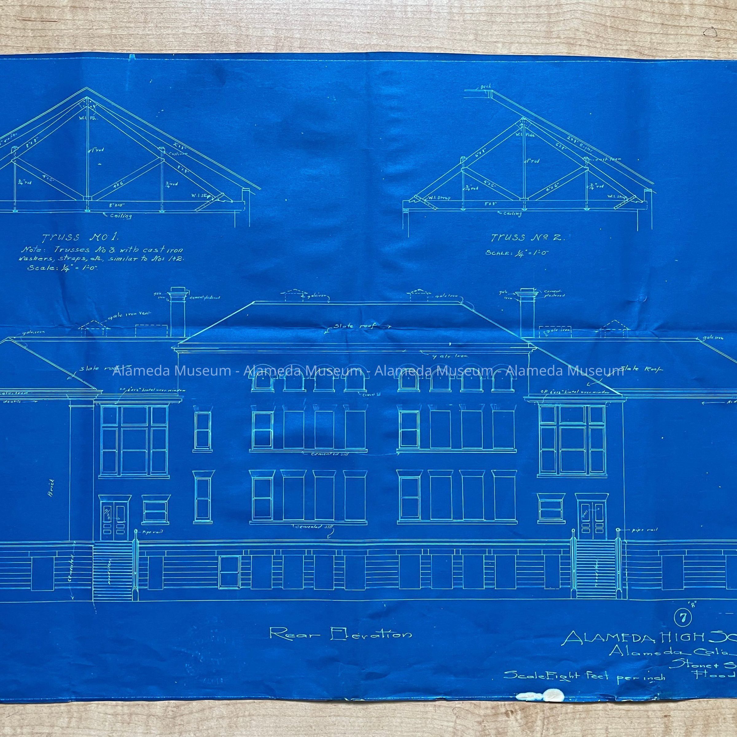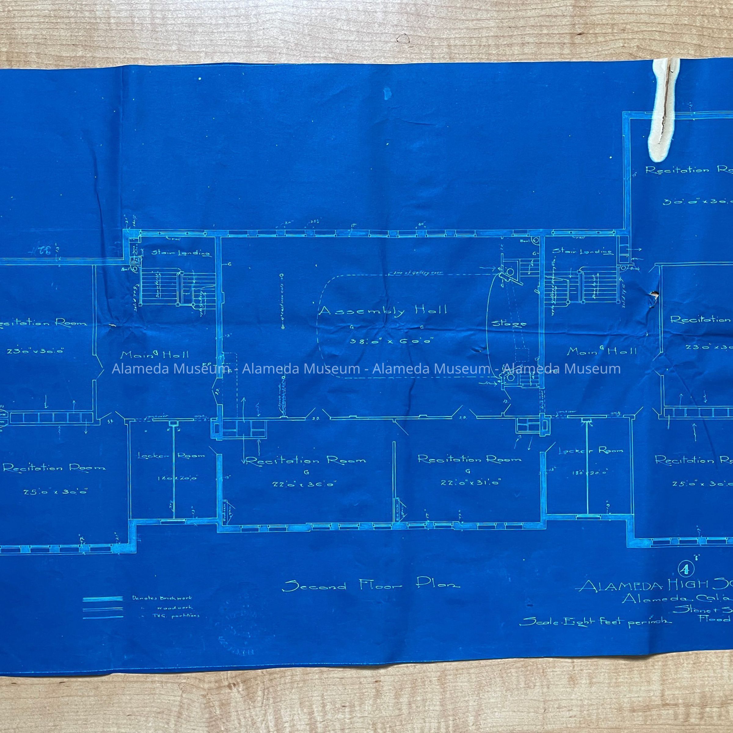 HISTORY OF OBJECTS: BLUEPRINTS SHOWING THE EXTERIOR AND INTERIOR OF THE ALAMEDA HIGH SCHOOL WHICH WAS CONSTRUCTED AT THE SOUTHEAST CORNER OF CENTRAL AVENUE AND WALNUT STREET. THIS BUILDING WOULD HAVE THE DISTINCTION OF BEING THE FIRST STRUCTURE ERECTED IN THE CITY OF ALAMEDA WITH THE PRIMARY USE AS A HIGH SCHOOL. BUILT OF BRICK CONSTRUCTION, IT WAS ULTIMATELY DEMOLISHED AND REPLACED BY AN EARTHQUAKE-PROOF BUILDING IN 1956.