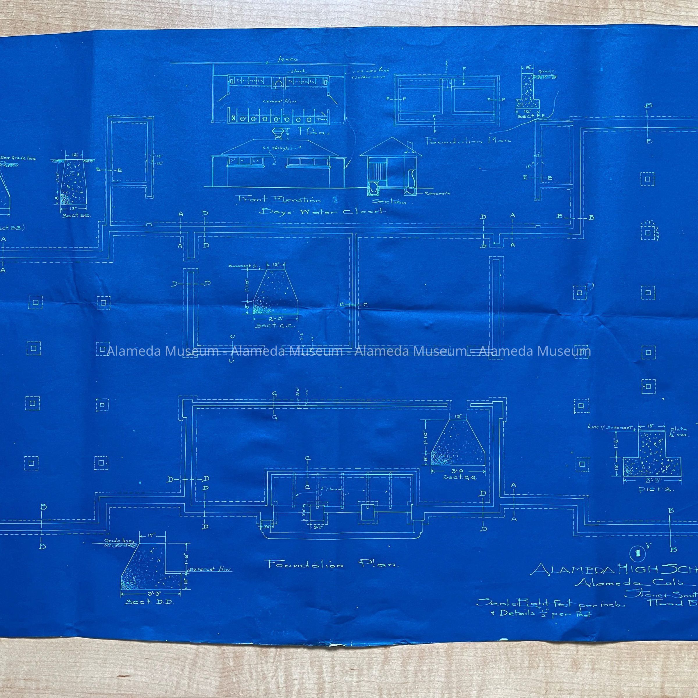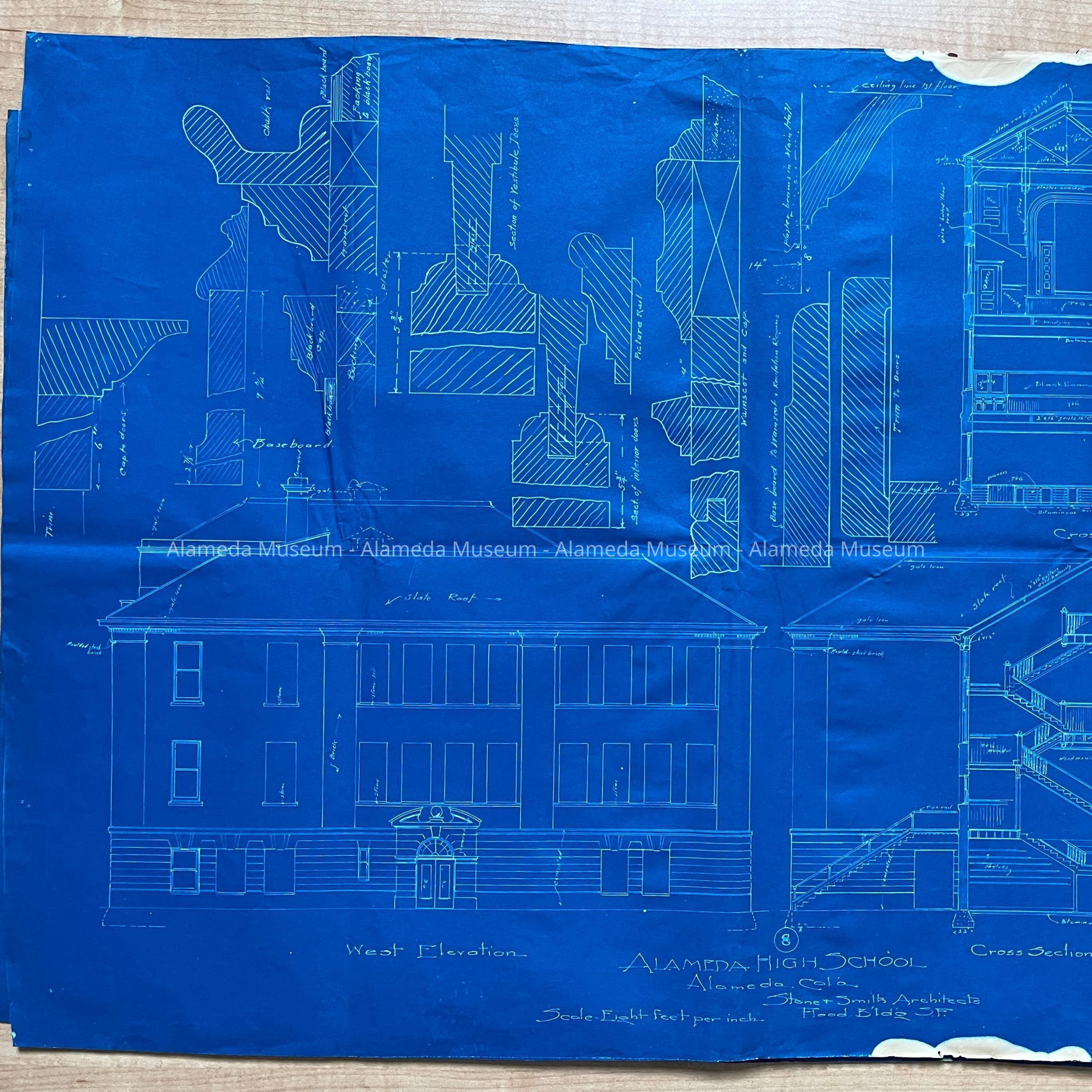 DESCRIPTION: SERIES OF 8 BLUEPRINTS, WHICH HAVE BOLD-PRINTED CAPTIONS IN THE LOWER RIGHT-HAND CORNER, STATING "ALAMEDA HIGH SCHOOL, ALAMEDA, CALIF., STONE AND SMITH, ARCHITECTS, FLOOD BLDG, SAN FRANCISCO."
