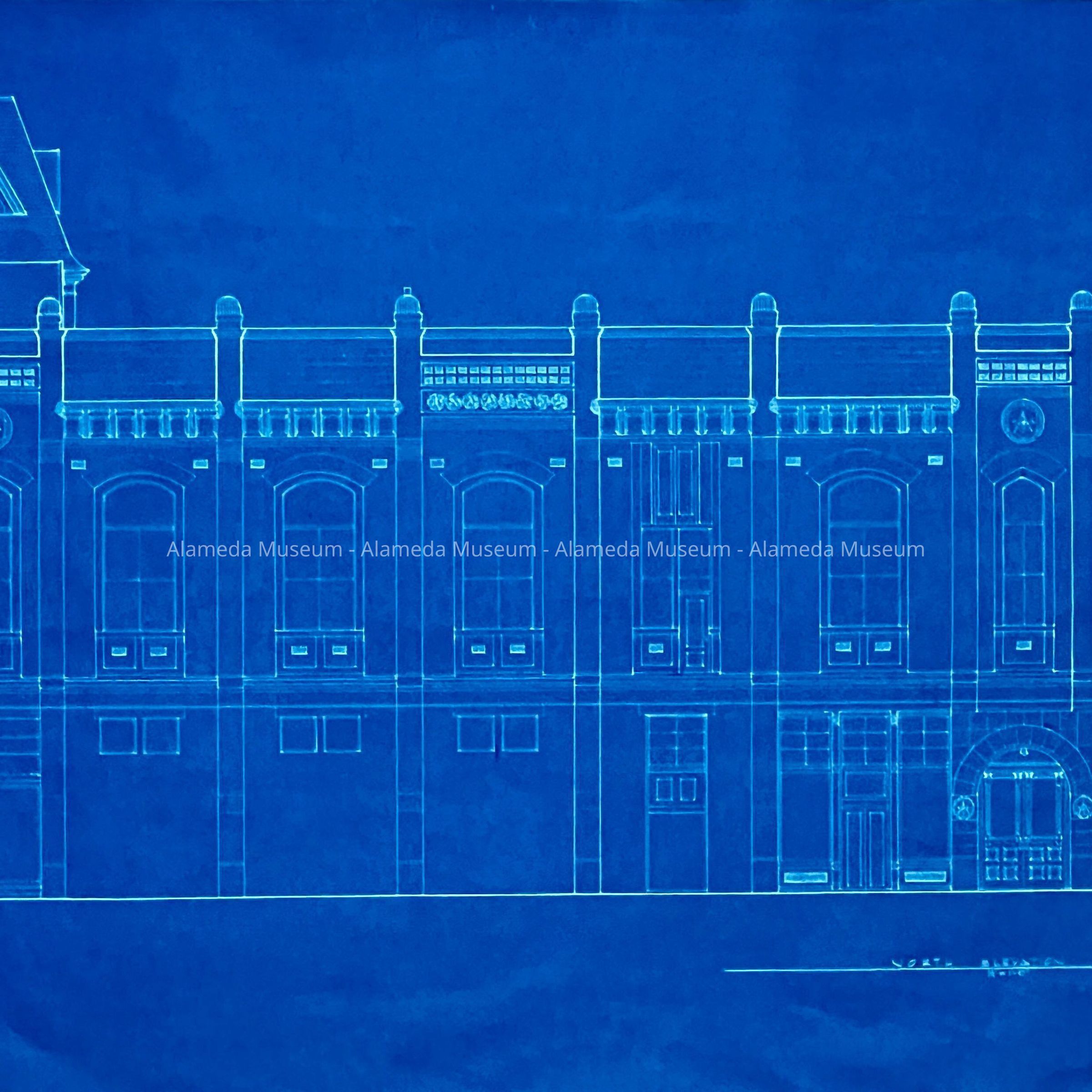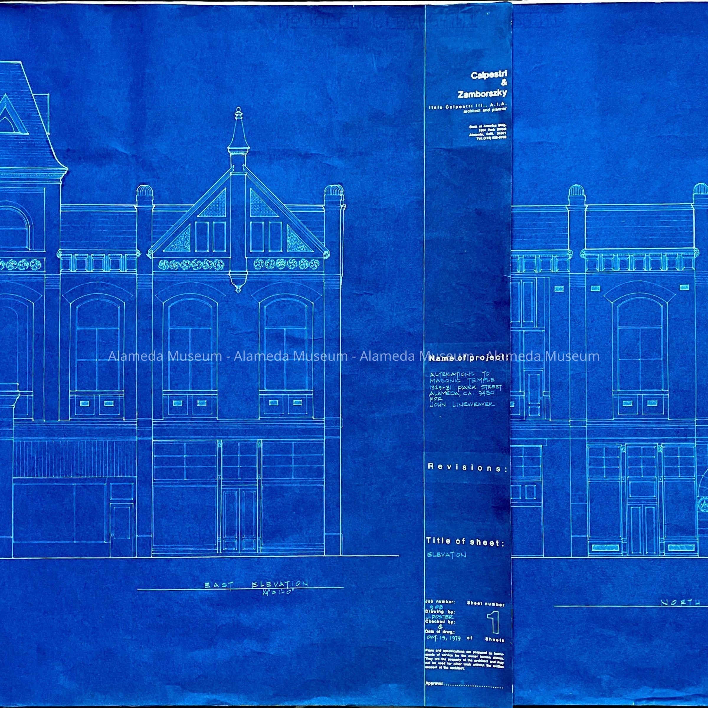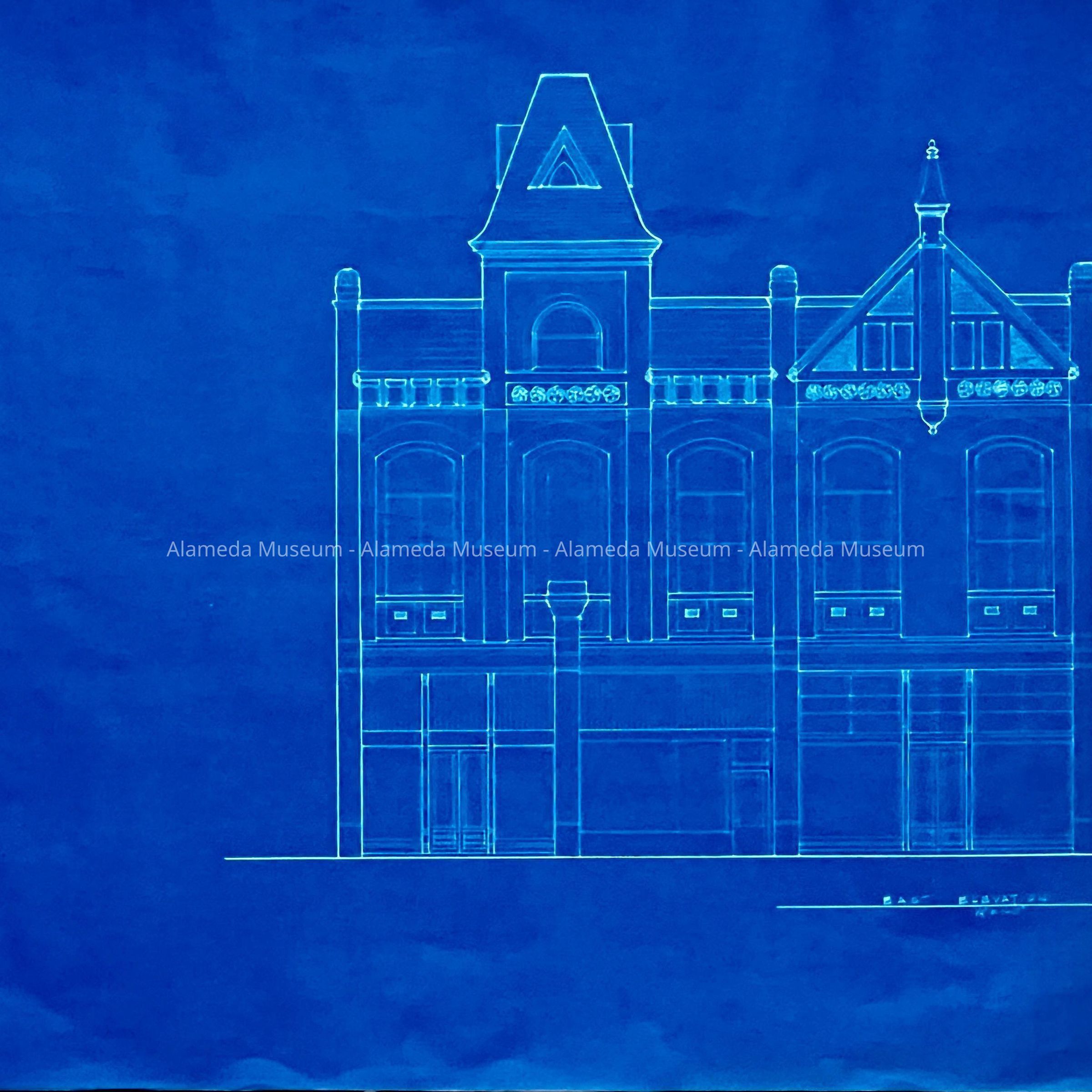 Blueprints depicting the exterior, east and north elevation of the original Masonic Hall, 1329-31 Park Street, Alameda, erected in 1890. Plans were drawn for considered alterations for John Lineweaver, the owner of the building at that time.