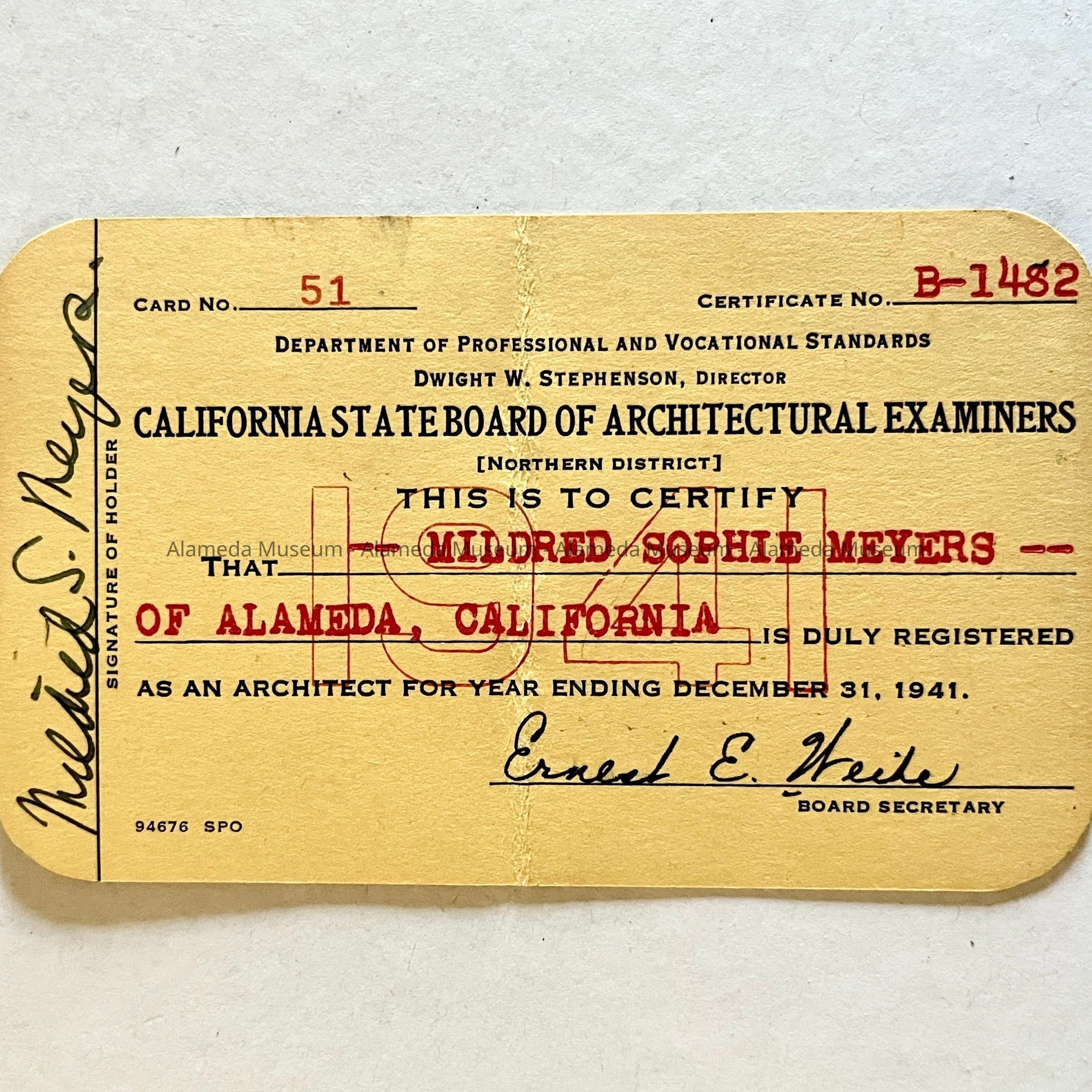 DESCRIPTION: A MEMBERSHIP CARD PRINTED ON HEAVY STOCK PAPER WITH BOLD-PRINTED CAPTION, "CALIFORNIA STATE BOARD OF ARCHITECT EXAMINERS," ON A YELLOW-COLORED BACKGROUND. CARD ALSO HAS THE SIGNATURE OF THE RECIPIENT, MILDRED S. MEYERS.