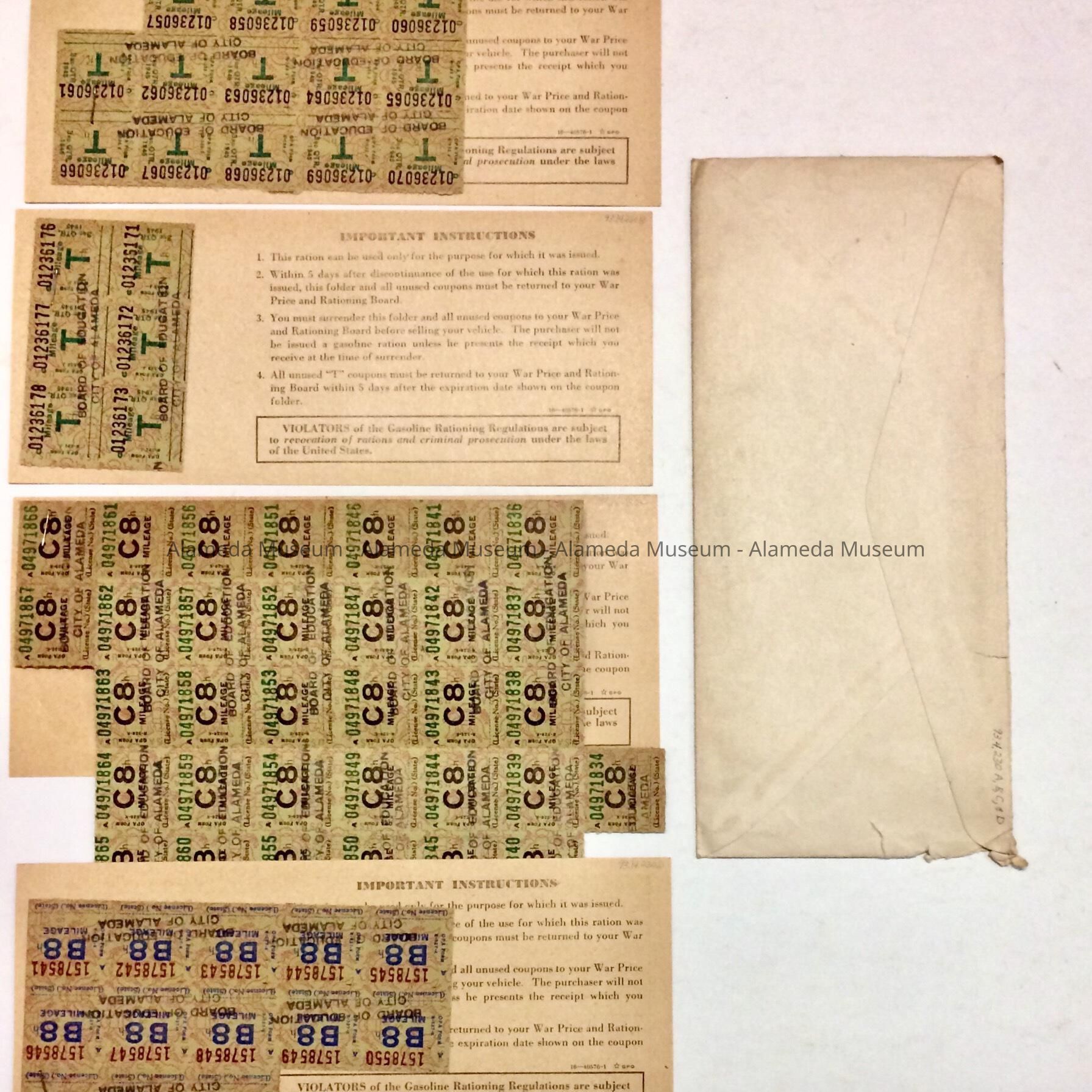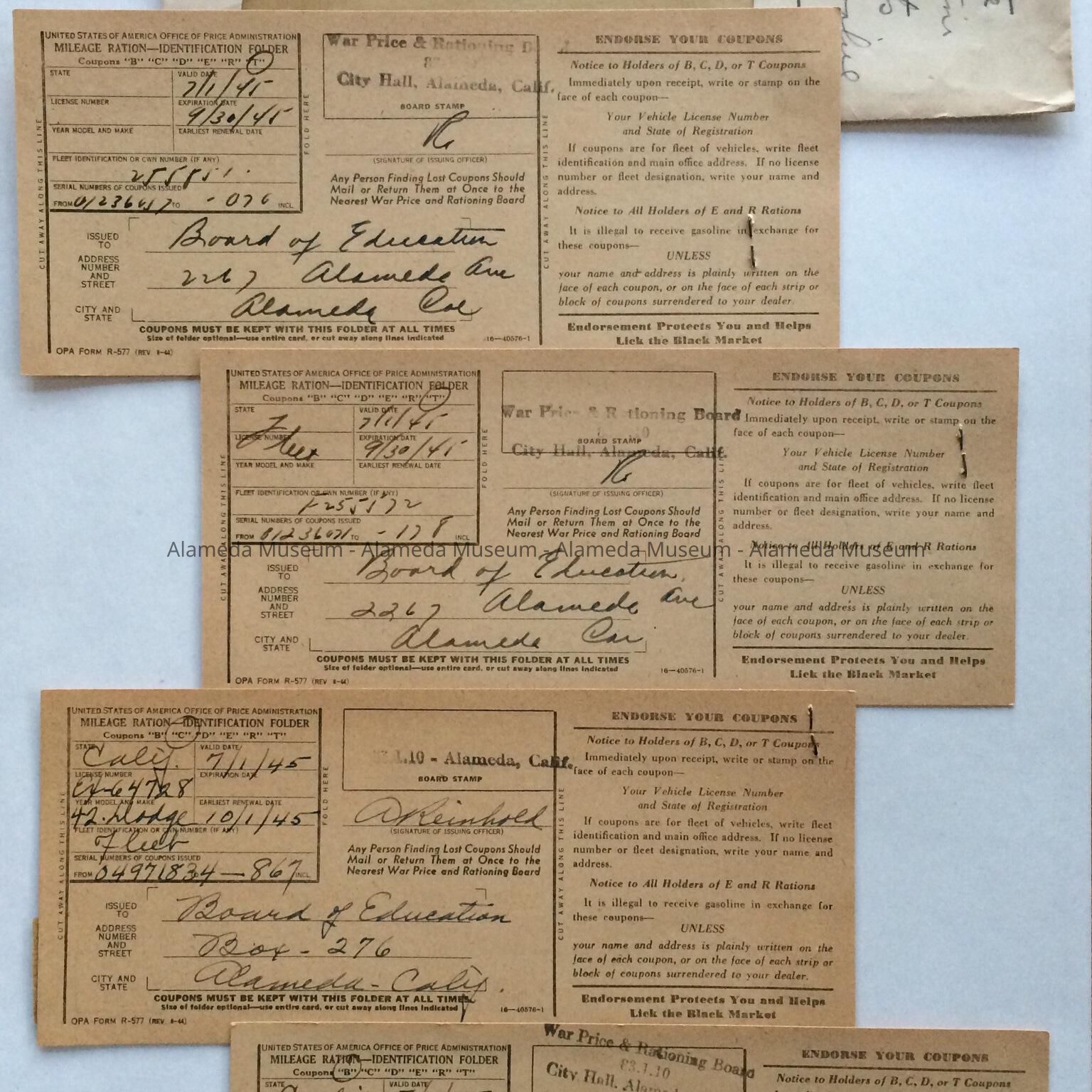 Gas ration stamps issued to the Board of Education, Alameda Unified School District, that were used by Wm. Cox employed by the district. Mr. Cox was a long time resident of the City.