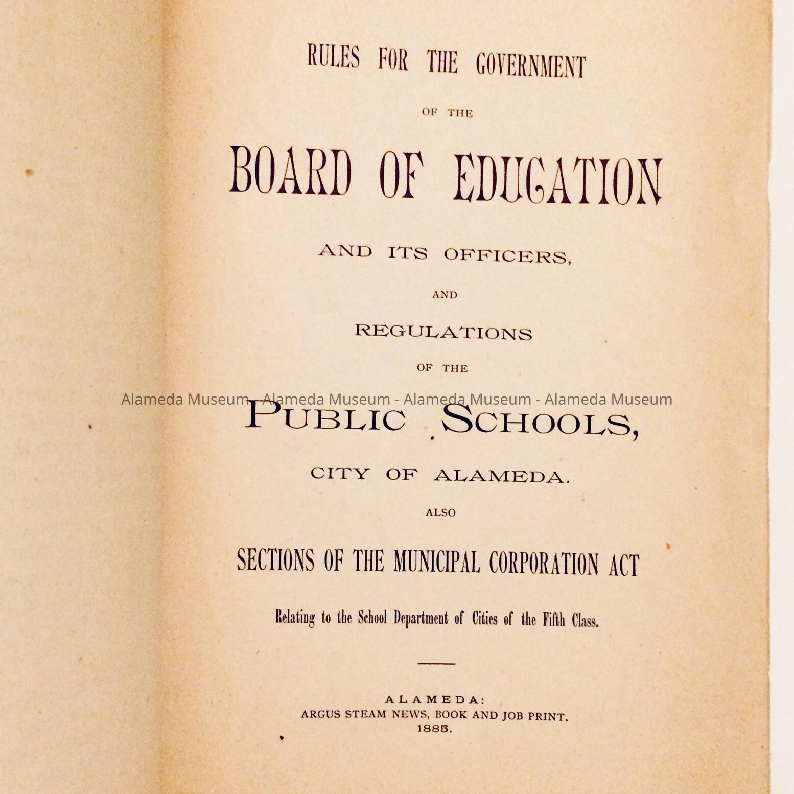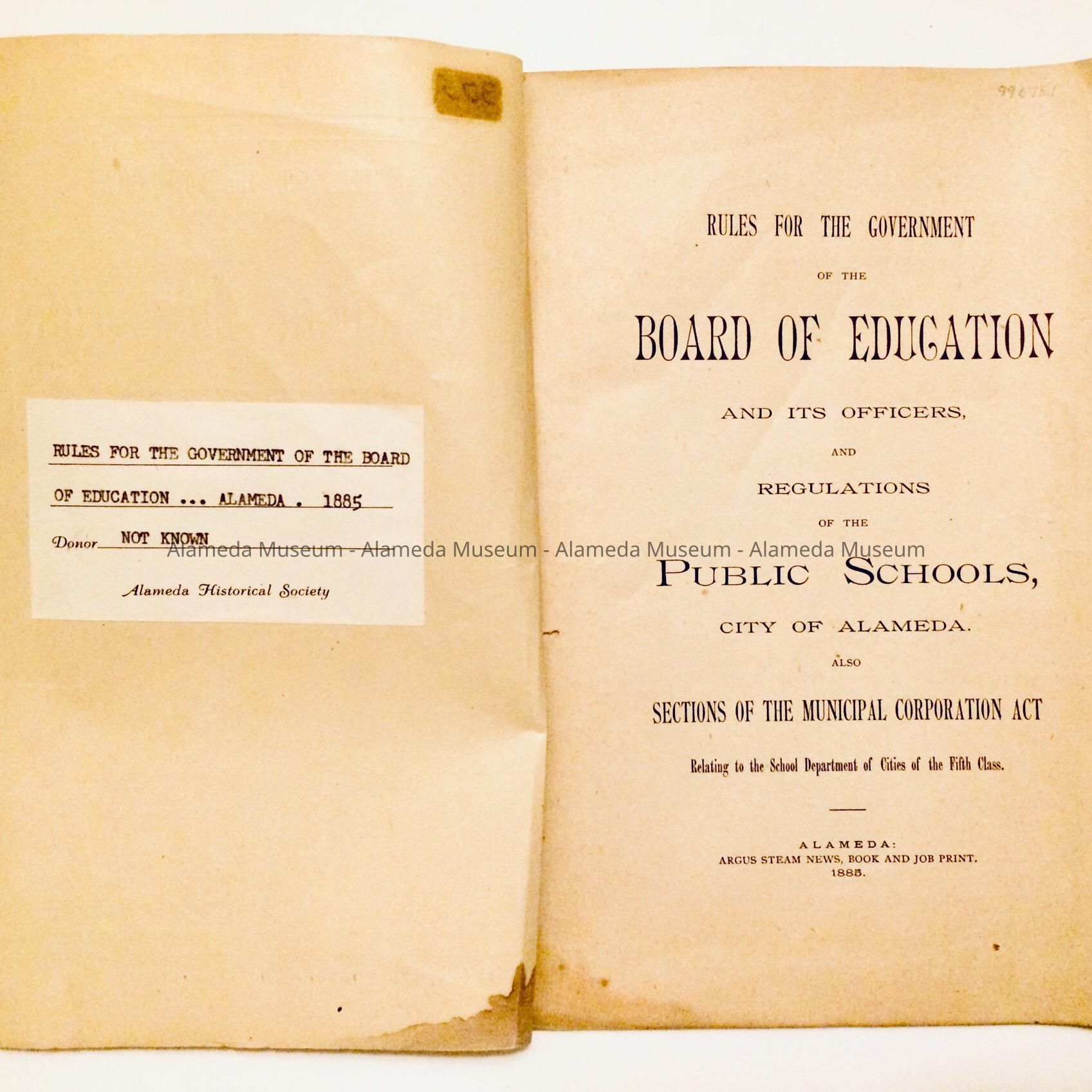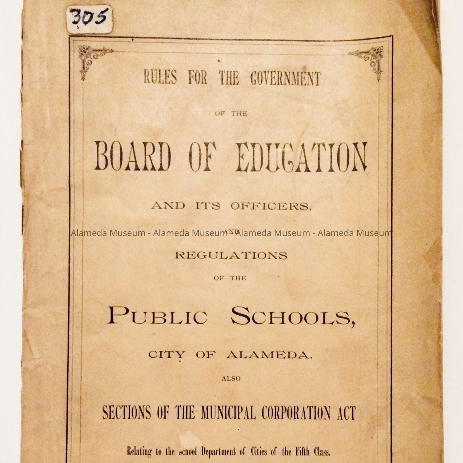 Booklet containing rules for the government of the Board of Education and its officers and regulations of the public schools, City of Alameda. Booklet could be considered one of the earliest artifacts of the Alameda Historical Society as it was given in 1949, one year after the founding of the Society, numbered 305 and never catalogued.