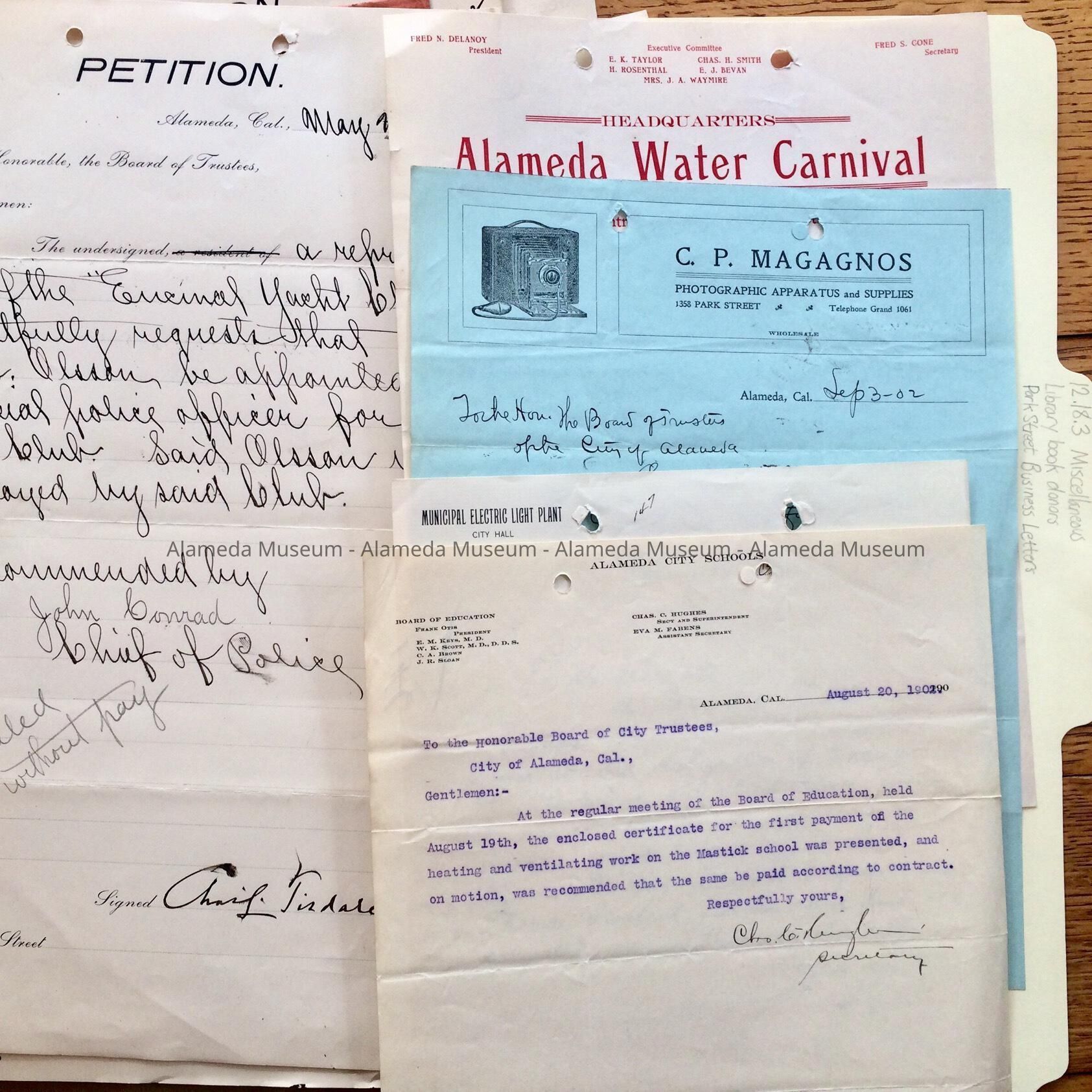 Documents in this folder pertain to: #102: appointment of Chas. Olsson as Encinal Yacht Club-paid special police officer (without pay).#104, 105: application for gratuitious peddler's license.#106: personnel matters at the Fire Dept.; #107: Theo. Gier Co. requesting refund for rescinded liquor license; #108: J.E. Anderson of Bay Farm Island presenting himself as candidate for Police Officer; #109: Expense Report Electric Light Plant for May; #110, 111: bids for contracting work on the schools and a water heater for Wilson School, including by C.F. Fischer Plumbing Company, 1334 Park Street; #111 1/2: petition to erect telegraph or telephone wires for a term of 50 years by the 'Independent Telephone and Telegraph Company'; #112: Oakland Transit Consolidated letter responding to complaint about noise from cars; #113: Superintendent of Streets Frodden suggesting prohibiting poplar ('popular') trees as street planting; #114: Expense report Fire Department for June; #115: revised bids after revision of plans for Mastick School; #116: payment of architects of School plans due; #117: sick / injury leave issues at the Fire Department; #118: petition by Julius Bronecke move of a cottage from Foley St. to NE corner Lincoln Ave and Broadway; #119: petition by Jules Krywer [?] to move a house from near the Power House on Webster, to Webster Street; #121: proposition by City Engineer W.P. Poyzer to construct a syphon water main across the Tidal Canal. #121 1/2: annual report of the Free Library for fiscal year 1901-1902; #122: request for re-evaluation of charge for lighting by Joe Bernard, of the Crystal Wine Room Depot, 1544-1548 Park Street; #123: page from the Daily Encinal with advertisement of the Gas, Light and Heat Co, Alameda office N. side Santa Clara Ave, near Park St. - also ad from the Theo. Gier Company; #124: offer to handle current by Suburban Electric light Co., Oakland; #125: bids to deliver oil; [aargh, a silverfish!]; #126: declined application for gratuitous license to sell toilet articles to the beach; #127: Letter promoting sixth Annual Convention of League of American Municipalities; #128: Board of Health requesting status of ordinance governing dairies; #129: transfer (sale) of junk license; #130: offer to lease the electric light plant if the Trustees decide to obtain current elsewhere; #131: petition by Joseph Koenig & Co., 2315 Alameda Ave, to place a steam boiler in the Cleaning & Dying Works; #132: Petition by residents at the South End of Alameda Park, to have small lights installed at the Cypress tree; #133: application for gratuitous license to sell shoes by R.J. Silva of 1401 Stanton St., and application for gratuitous peddler's license by A.P. Chrisman of Oakland; #133 1/2: bids for radiators in the Wilson School addition, including by C. F. Fisher Plumbing Co.; #134 Treasurer's Quarterly Report; #135: United Engineering Co. request their two watchmen to be appointed regular policemen without Pay; #137: Oakland Knights of Pythias invitation to a parade and requesting a school holiday for this Great Phythian Day; #138: G.S. Thompson, Manager Electric Light Plant, countering claims by Jos. Bernard, 1546 Park Str.; #139: Board of Education recommends payment of schools' architects; #140: notice of Trans-Missisiply Commercial Congress; #141: Bond payment for Chas. Paff. #142: Quarterly Electric Light Plant Boiler inspection report; #143: Board of Education recommends acceptance of bid by C.F. Fisher Plumbing Co.; #144: Fire Dept. Expense Report for July; #144 A: Petition to accept franchise application by Independent Telephone Company; #144 B: offer by Suburban Electric Light Co. to supply current; #144 1/2: report from Poundmaster; #145, 146: Payment recommendation from Board of Education for Wilson and Mastick additions; #147: Municipal Light Plant personnel changes (mentioning H. Henderlong, Stuart Hassey, Clarence Brittain, Thomas Stoddard); #148: C. P. Magagnos, 1358 Park Street, petitioning a free peddler's license, on behalf of the Carnival Committee; #149: Invitation for Alameda Water Carnival, September 15, 16, 17, 1902.