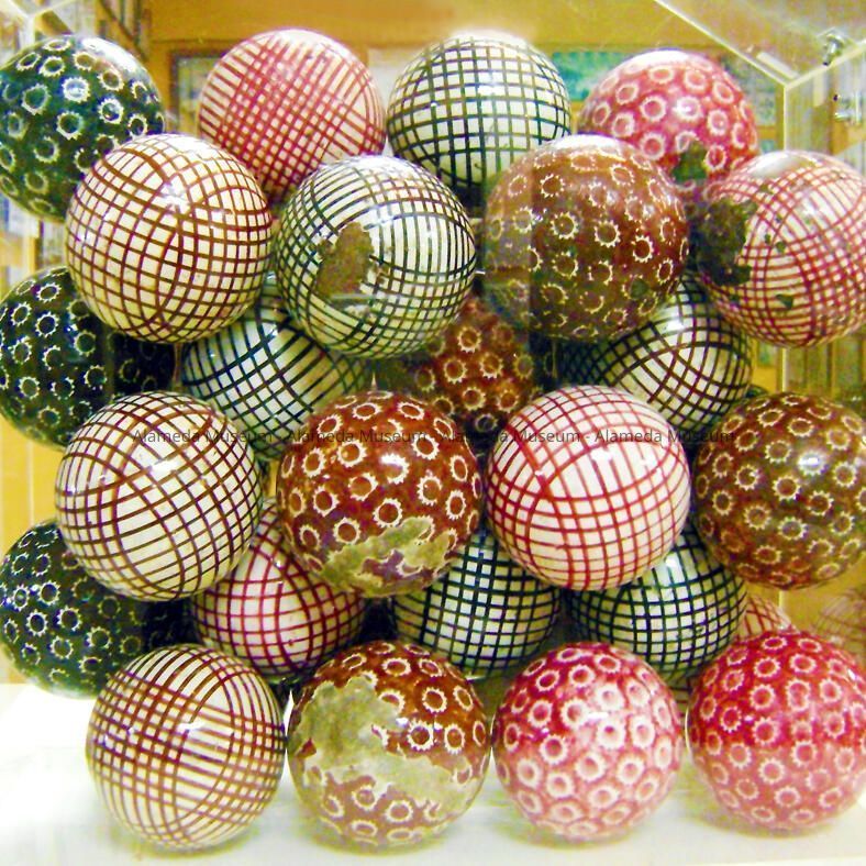 Description: Collection of composition decorated bocce balls. They appear to be hand-painted, some with a pseudo-floral design on solid color backgrounds incl. red and black; others have striped concentric lines in red or brown on a white background.
