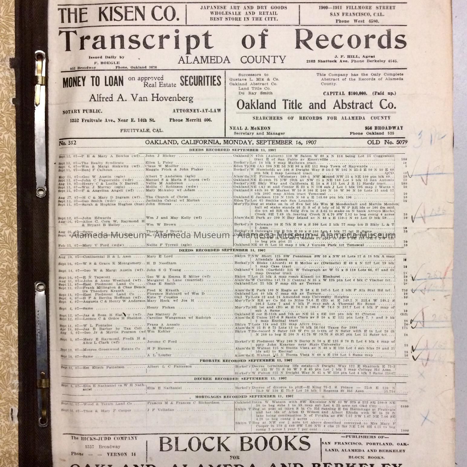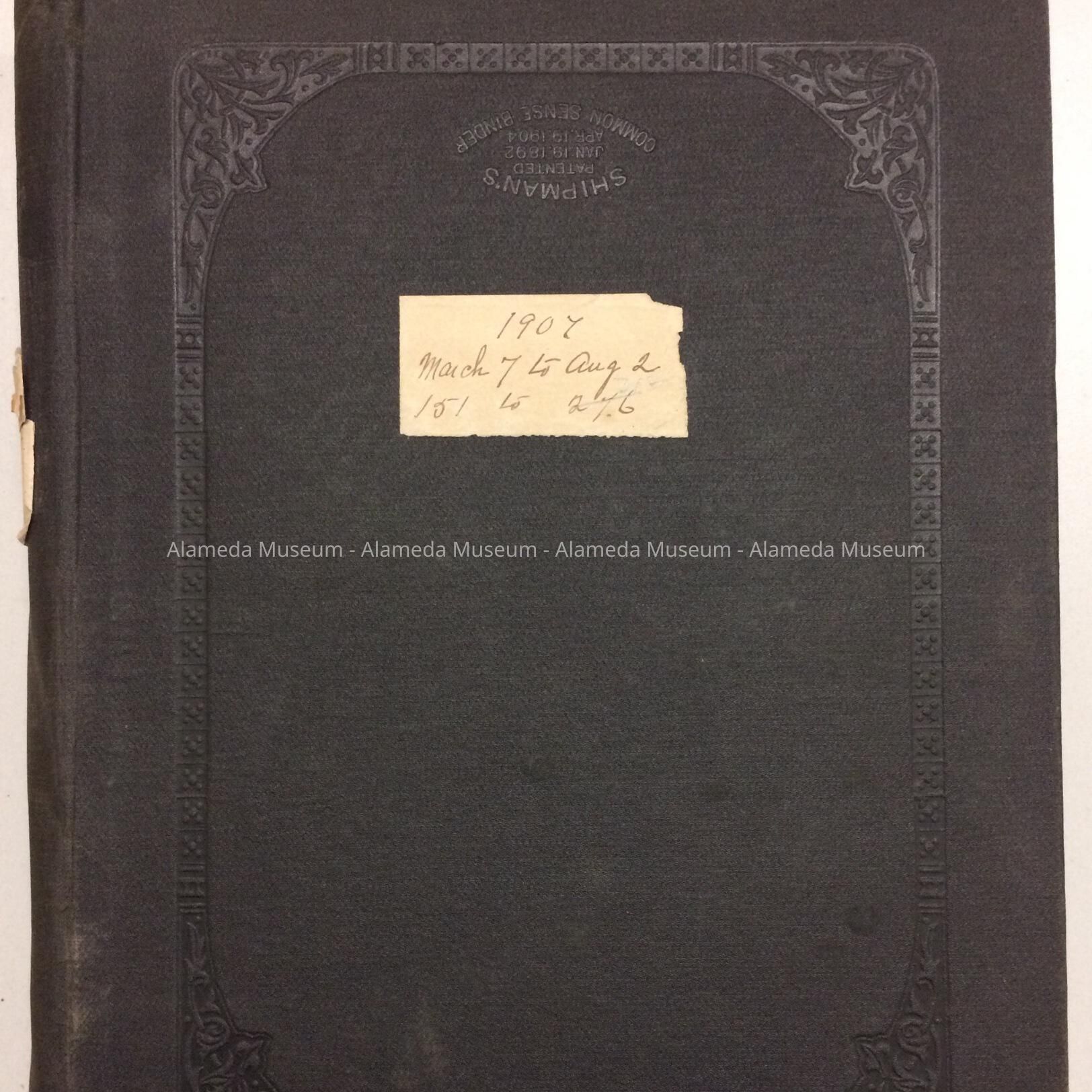 TRANSCRIPT OF RECORDS, ALAMEDA COUNTY, FOR THE PERIOD MARCH 7, 1907 TO SEPTEMBER 16, 1907. CONTAINED WITHIN A LOOSE-LEAF BINDER, COVERED IN BLACK-COLORED BUCKRAM.