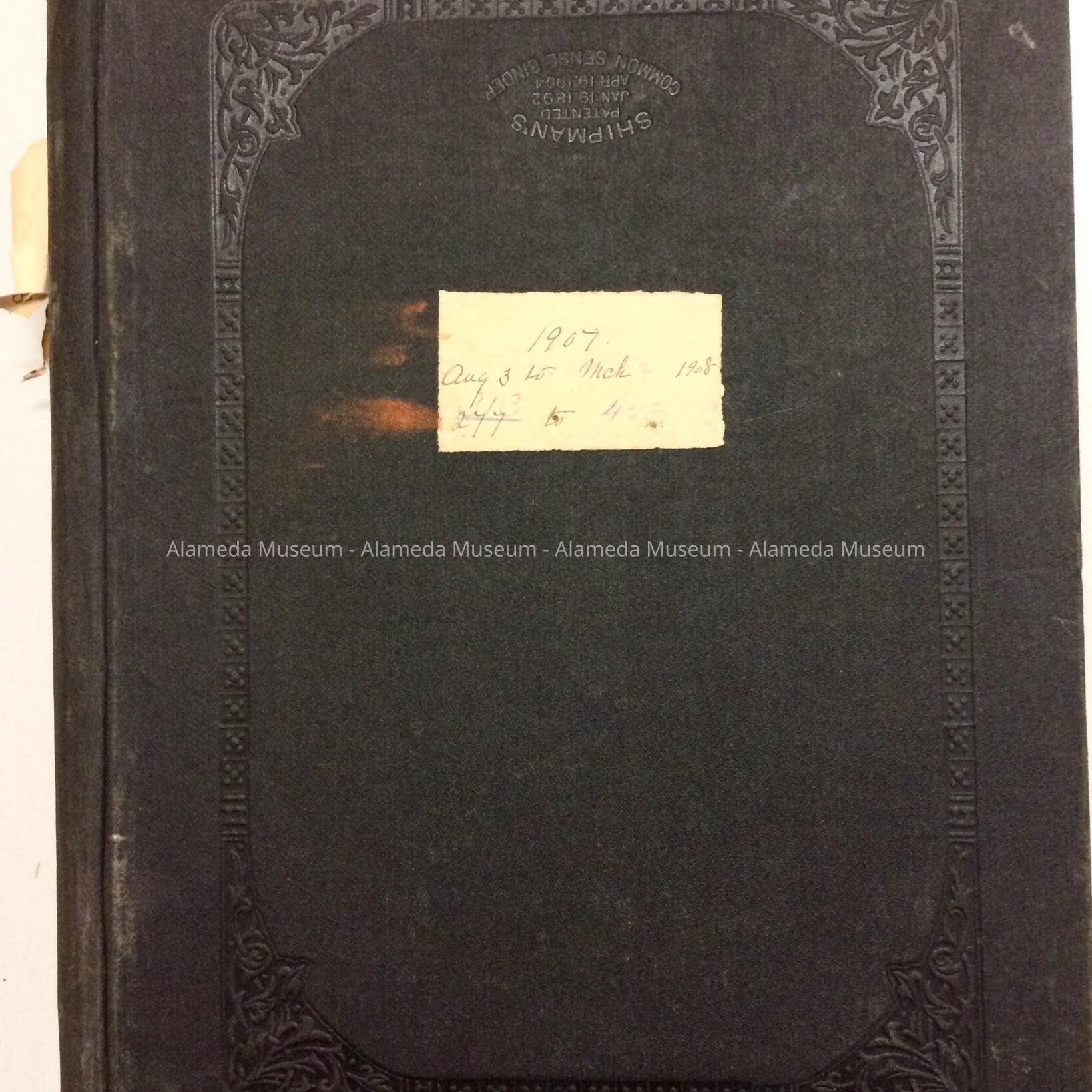 LOOSE-LEAF BINDER CONTAINING F BOEGLE, OAKLAND, CA TRANSCRIPT OF RECORDS. PAPER LABEL (HANDWRITTEN) READS, "SEPTEMBER 17, 1907 TO MARCH 3, 1908."