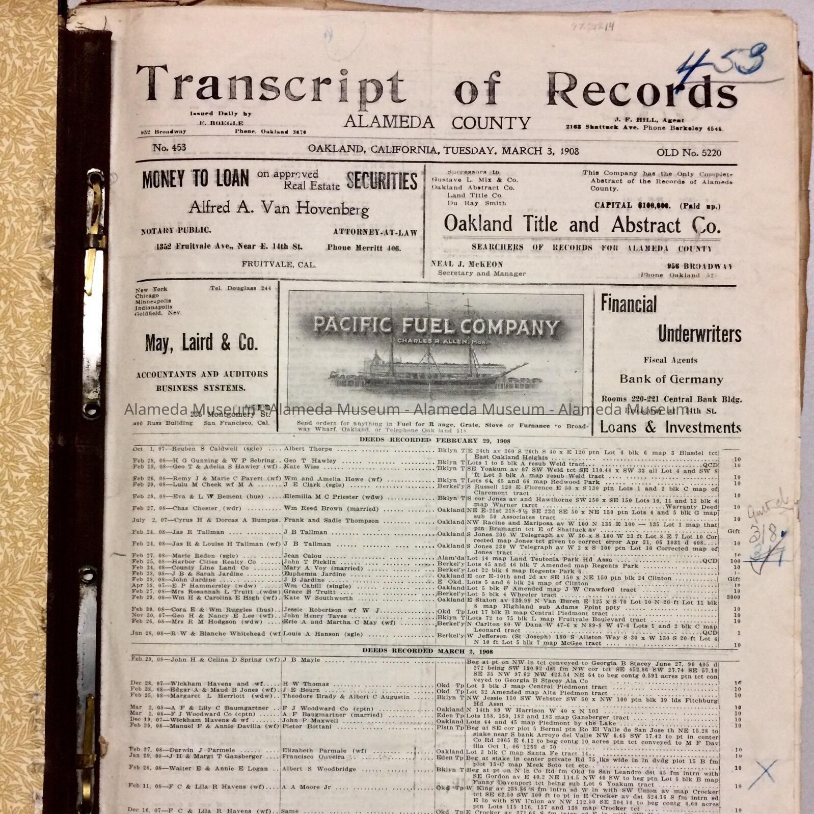 TRANSCRIPT OF RECORDS, ALAMEDA COUNTY, FOR THE PERIOD SEPTEMBER 17, 1907 TO MARCH 3, 1908.