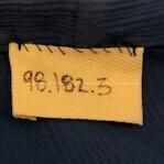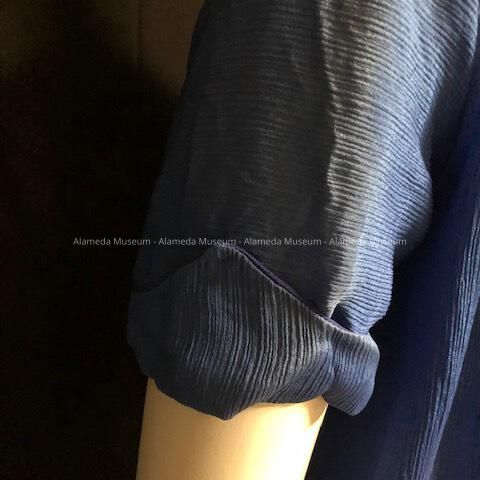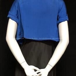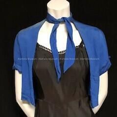 A BOLERO-STYLE JACKET OF DARK BLUE-COLORED CREPE, WITH SHORT SLEEVES. THE SLEEVES HAVE CUFFS WHICH ARE LINED IN DARK BLUE-COLORED SILK. THE COLLAR ENDS IN STREAMERS THAT CAN BE TIED.