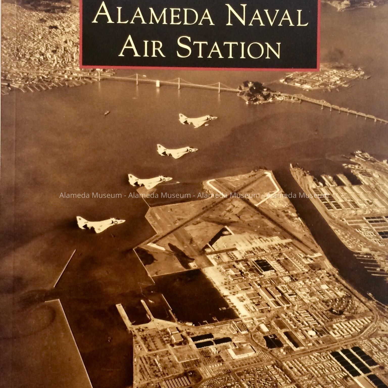 Description: soft-bound booklet featuring a cover with sepia image showing 4 airplanes above a landing field encircled by water on three sides, with San Francisco and the S.F. Bay as backdrop, titled 'Alameda Naval Air Station', by William T. Larkins and the Alameda Naval Air Museum, from the series 'Images of America', published by Arcadia Publishing, copyright 2010.