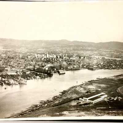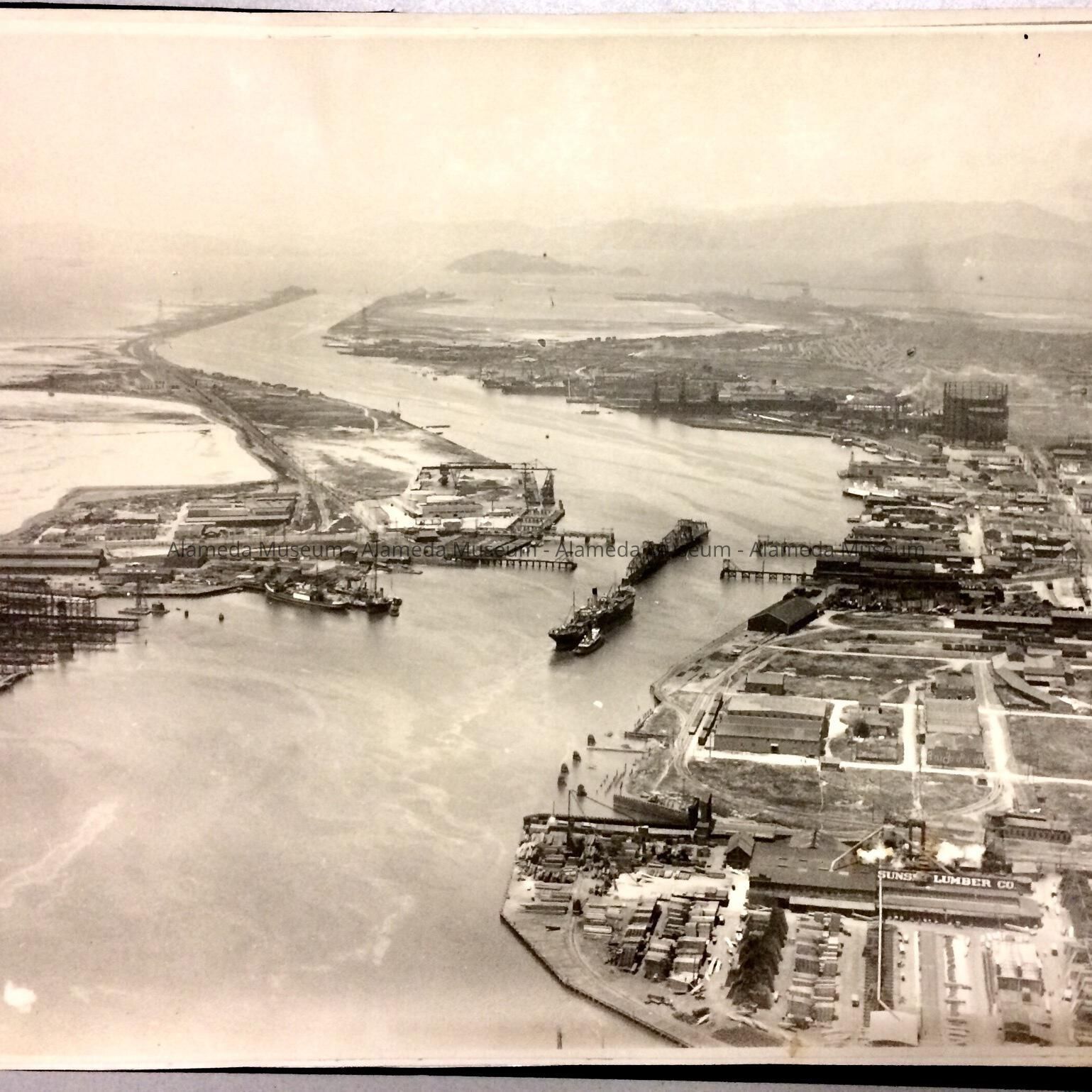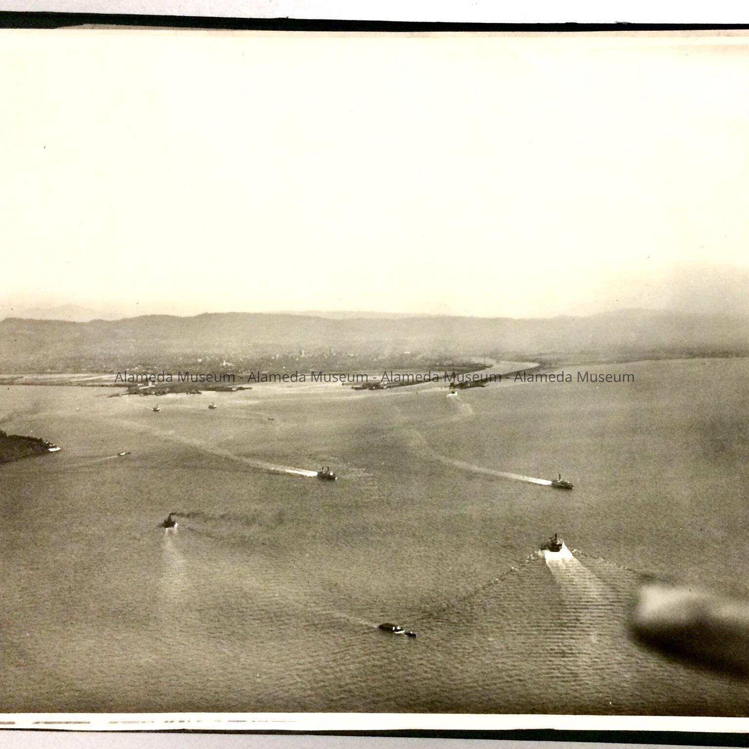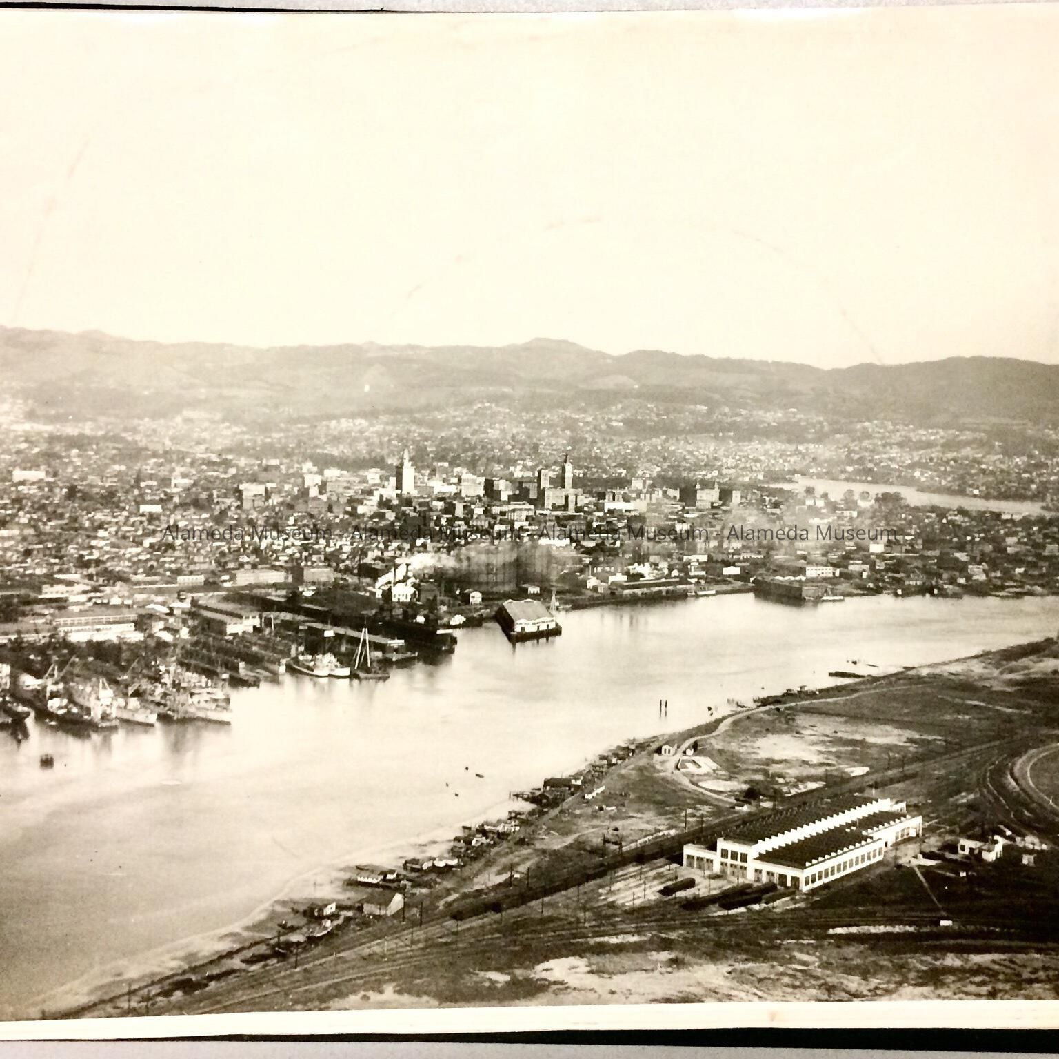 History of Object: set of 9 large photos with Aerial Views of Oakland, apparently to illustrate business properties handled by the firm. The 1st, 2nd, and 6th photo depict sections of the Oakland/Alameda Estuary.