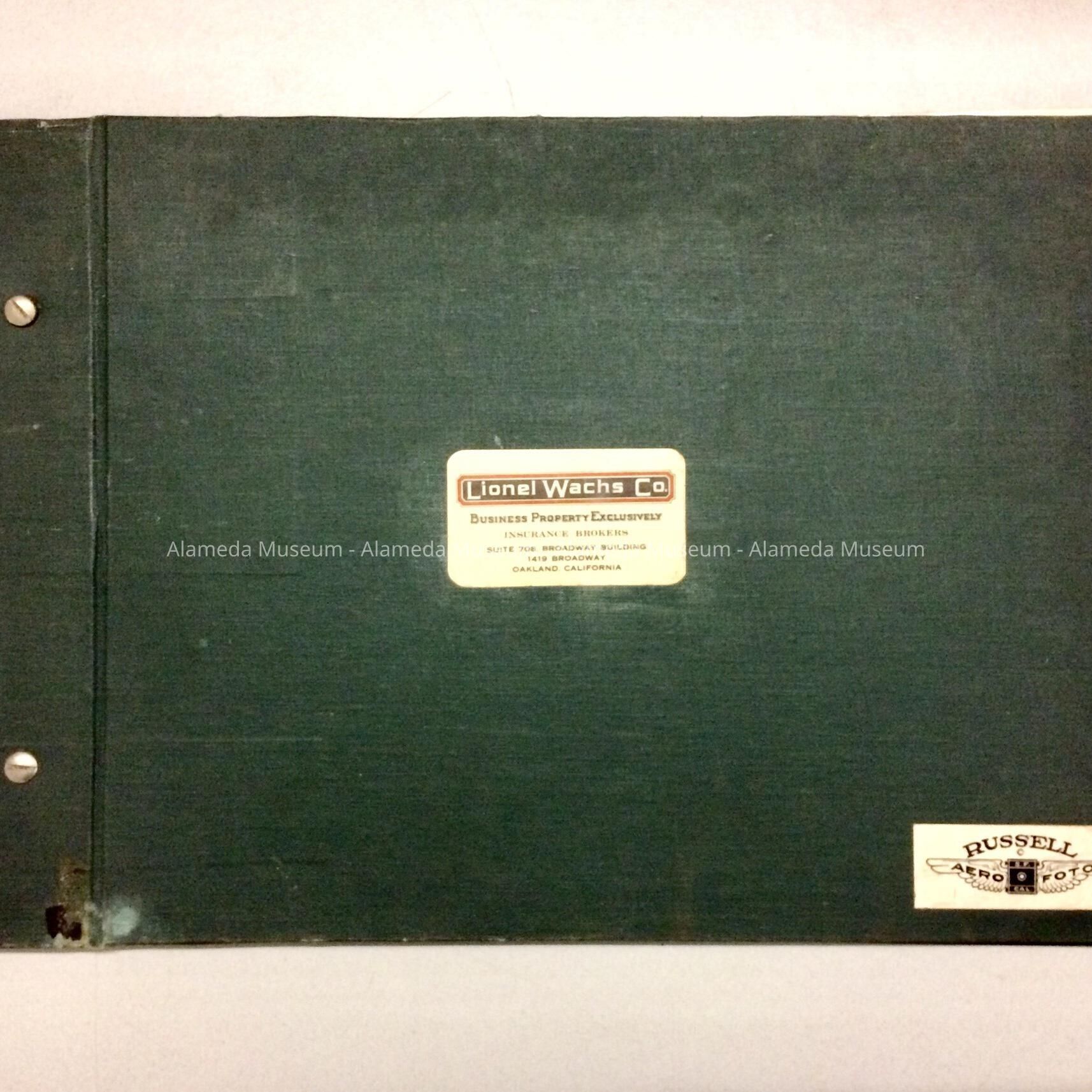 Description: A book of 14 x 11 inch photos, mounted within a cover of dark green buckram, bound with 2 metal screws. Front cover has two labels, one of 'Lionel Wachs Co., Insurance Brokers, Oakland'. the other of 'Russell Aero Foto, S.F., Cal'. Inside front cover has handwritten in what appears to be blue marker: 'Airoplane views, Photo's in 1926'. Photos in the book are all stamped on the reverse with the photographer's name and ownership details: G.E. Russell.