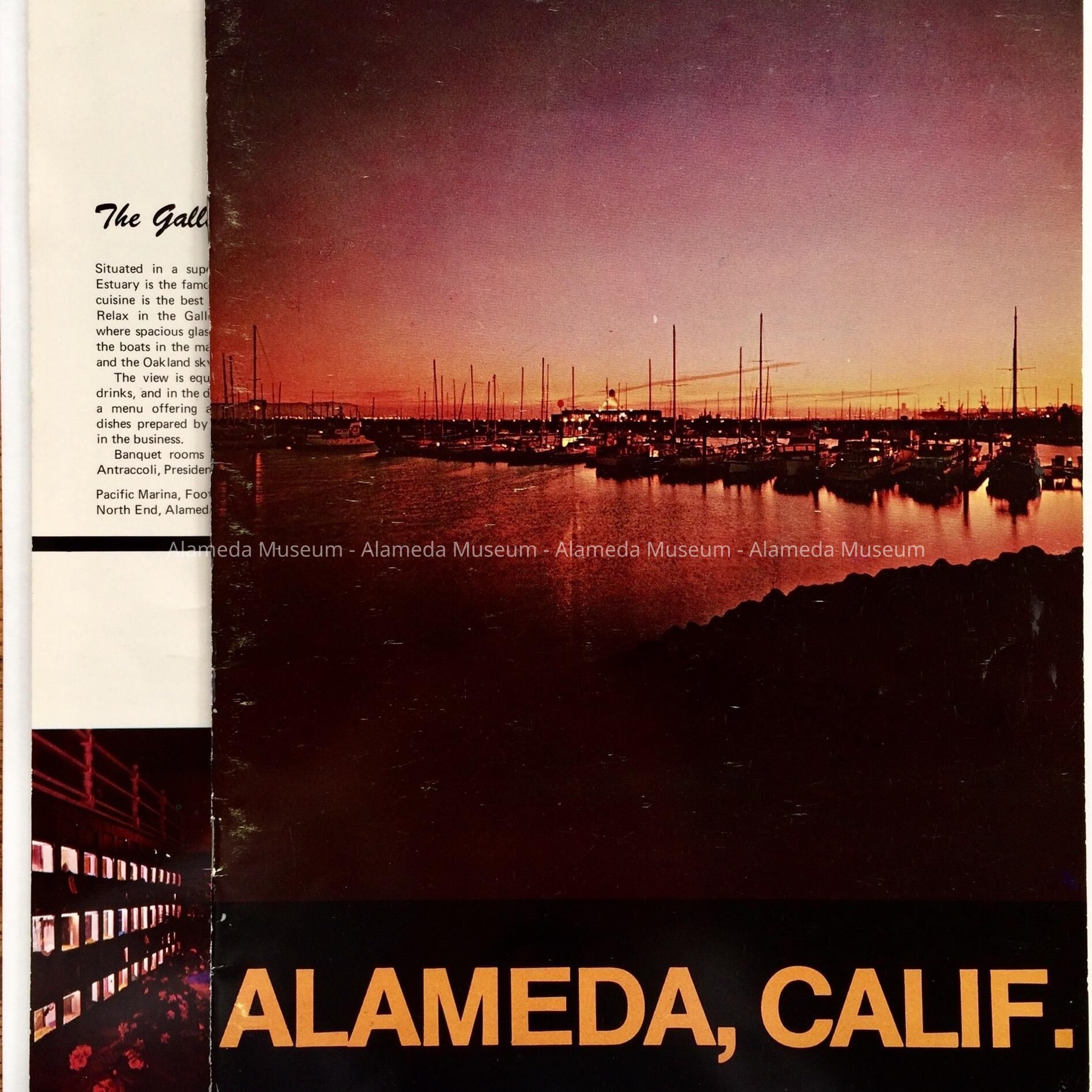 Description: Soft bound booklets with cover design in color depicting yacht harbor with bold printed caption "Alameda, Calif.".