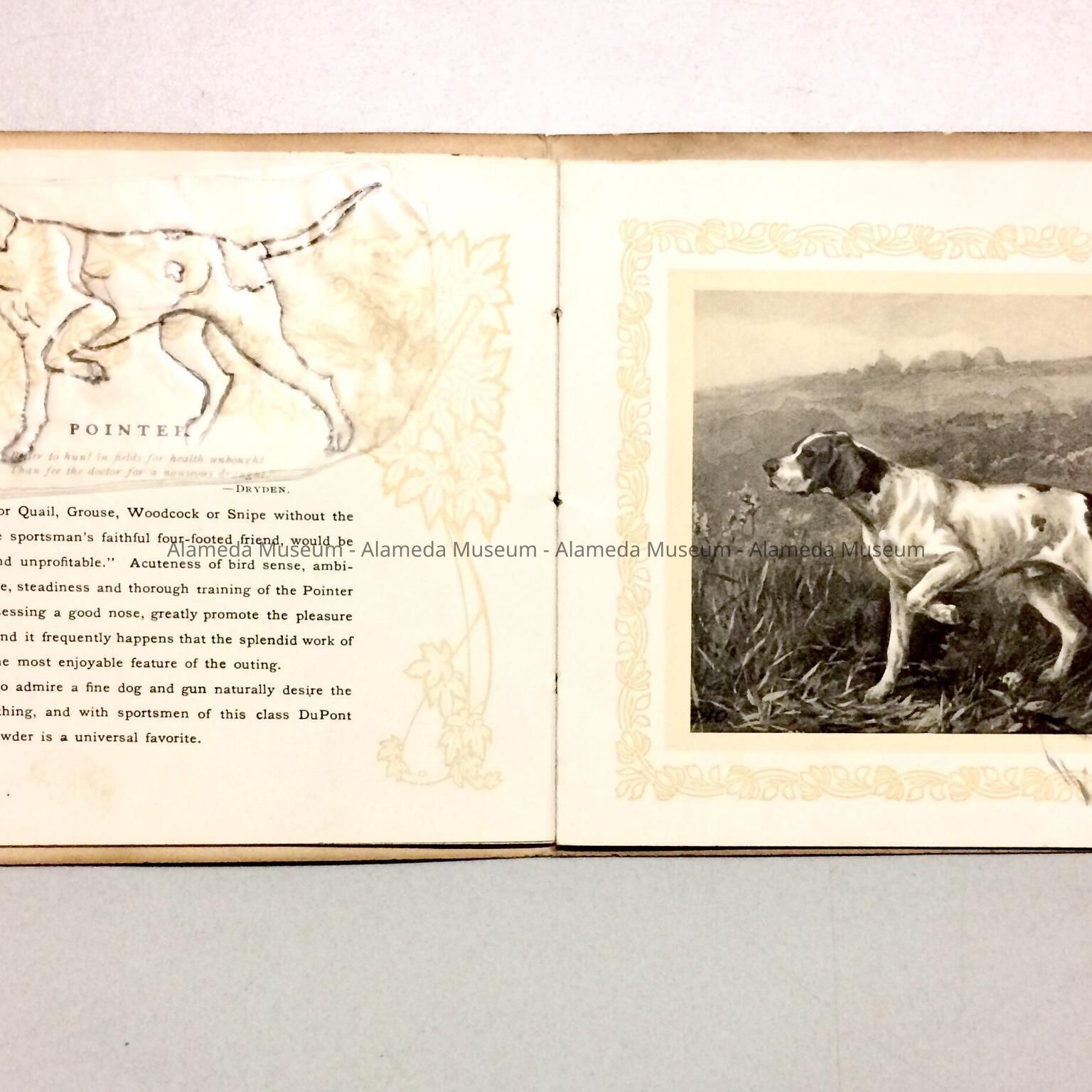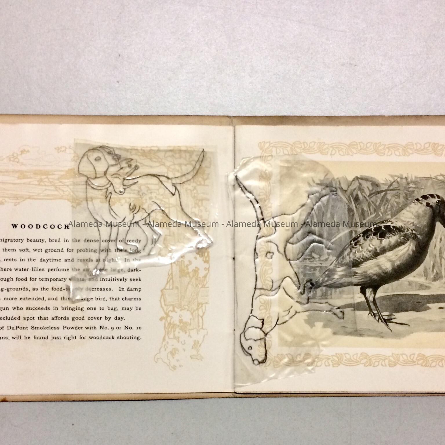 History of Object: Booklet issued by the DuPont Smokeless Gunpowder Company, illustrated with gaming animals. The illustrations in this booklet were most likely copied by Elizabeth Thomas (Alameda china painter) to get the proper proportions & details of gaming birds & animals used to decorate her hand painted china.